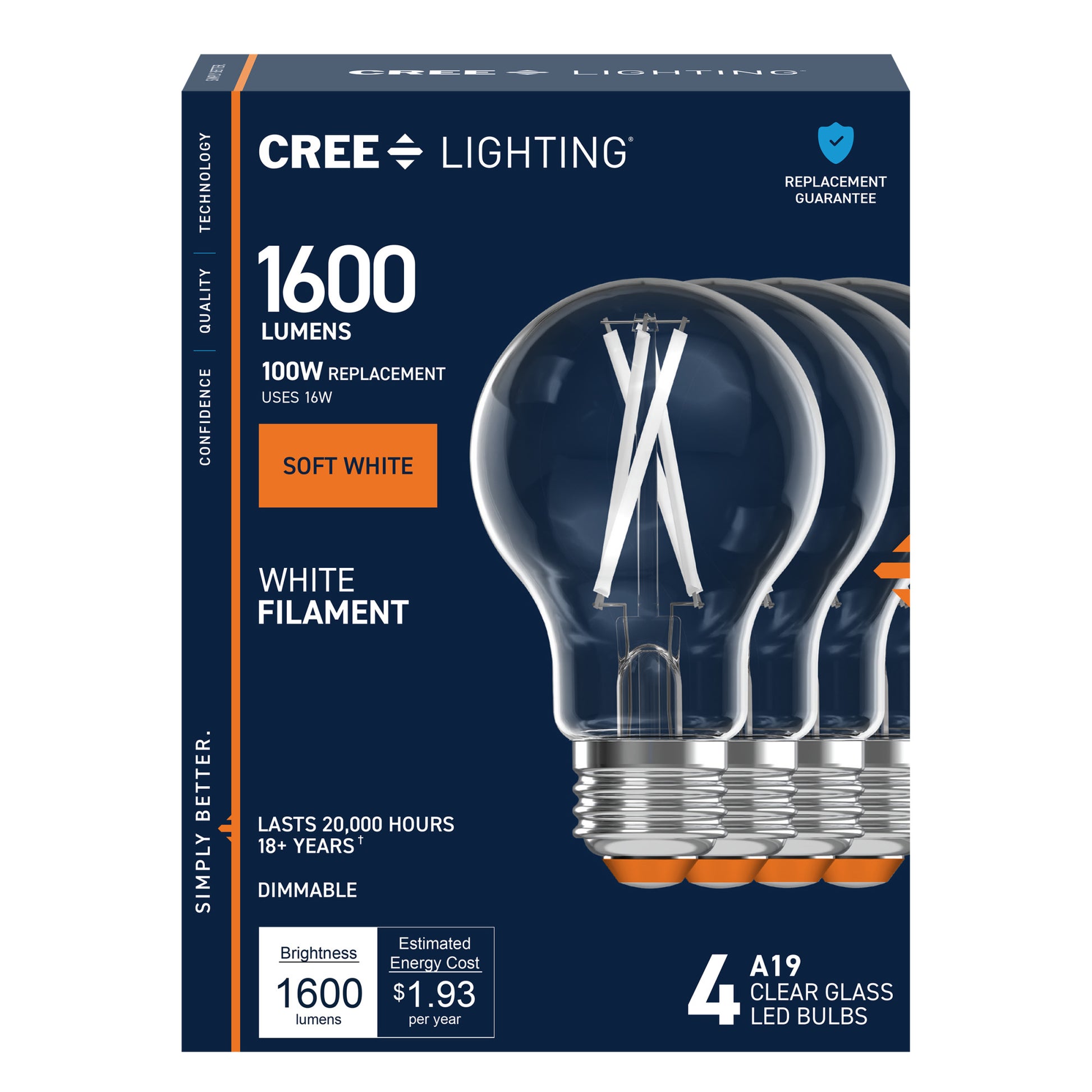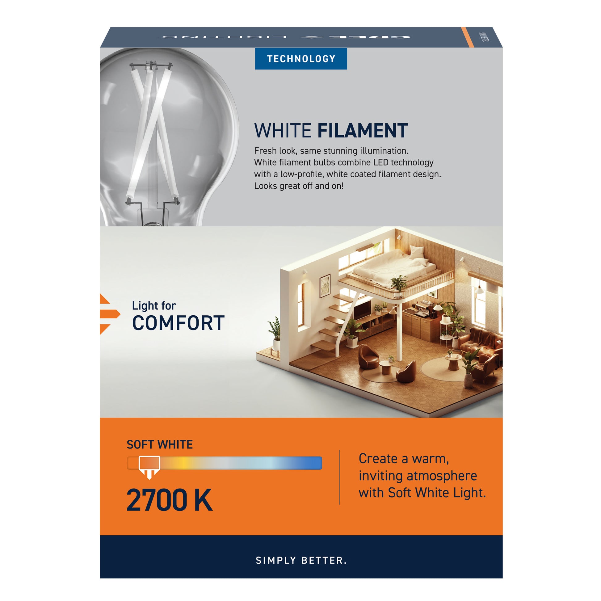 Refresh your lighting to fit your aesthetic with our White Filament LED A19 Soft White bulb. Equipped with low-profile, white coated filament design, these clear glass bulbs give off stunning illumination while on and blend seamlessly into your decor while off. The Soft White (2700K) tone creates a warm, inviting atmosphere that makes any space feel like home for up to 20,000 hours. The remarkable 90+ Color Rendering Index (CRI) makes colors appear more vivid and true-to-life, enhancing the beauty of your home's decor and making everything look its best. This 1600 Lumen bulb has a medium-size E26 base, making it an easy upgrade from traditional 100W incandescent bulbs in almost any fixture. Replacements are fewer and further between with eco-friendly, LED bulb technology that uses 84% less energy than incandescent bulbs. Whether it's in your living room, bedroom, or reading nook, enjoy flicker-free, sustainable lighting that elevates your fixtures with effortlessly sleek style.