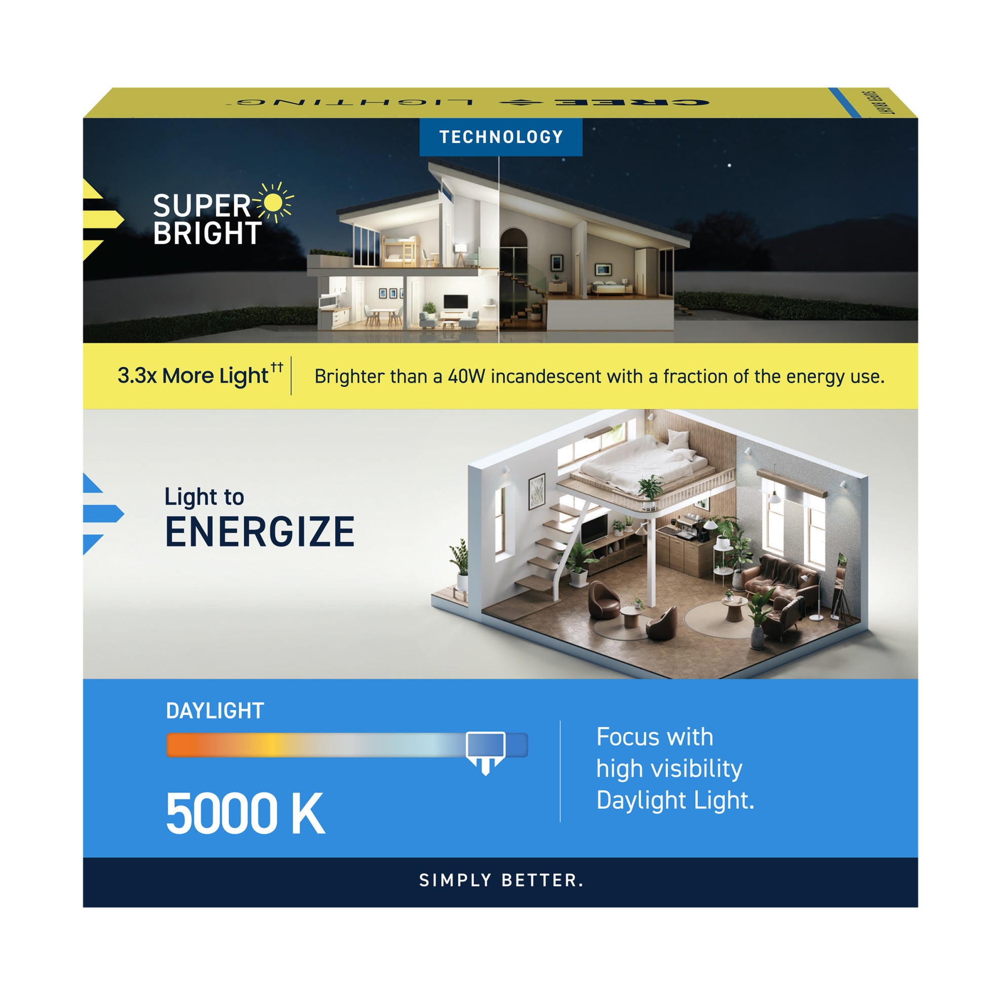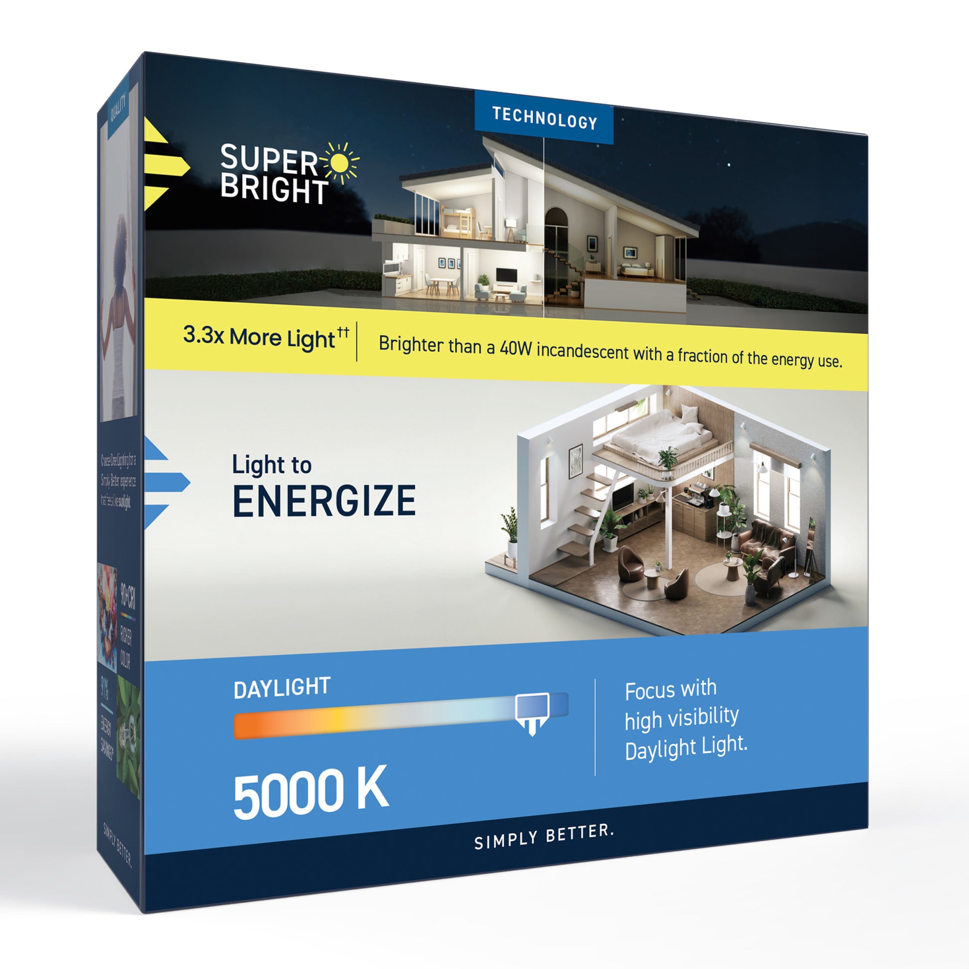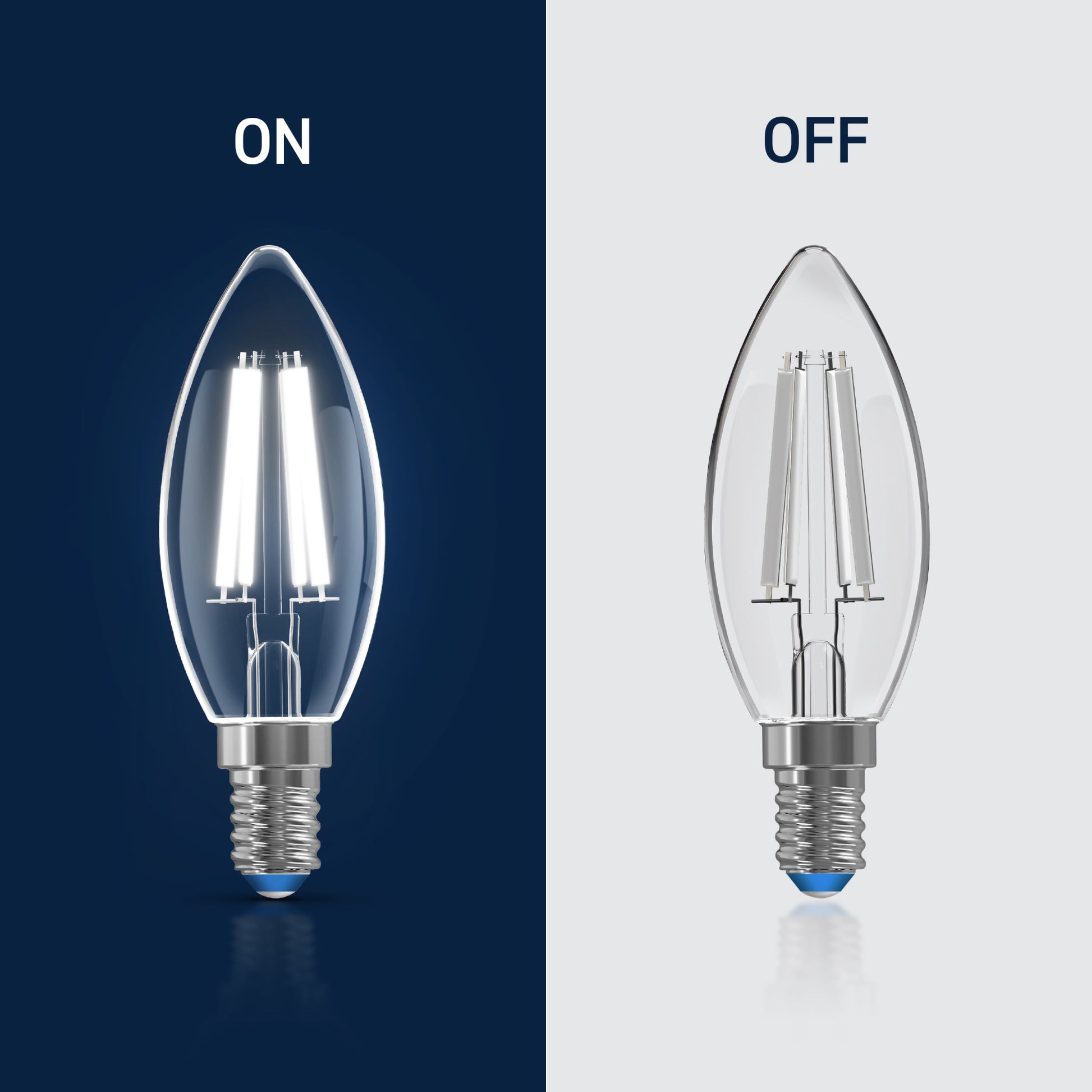 Refresh your lighting to fit your aesthetic with our Super Bright White Filament LED Daylight bulb. Equipped with low-profile, white coated filament design, these clear bulbs give off stunning, stylish illumination while on and blend seamlessly into your decor while off. The candle shape brings a high-end ambiance to your fixtures. Boost visibility and stay on task with the vibrant clarity of Daylight Light (5000K). The remarkable 90+ Color Rendering Index (CRI) makes colors appear more vivid and true-to-life, enhancing the beauty of your home's decor and making everything look its best for up to 20,000 hours. This 1000-lumen bulb has a Candelabra E12 base, and replacements are fewer and further between with eco-friendly, LED bulb technology. This bulb does with 11W what a traditional incandescent bulb does with 100W, making it more efficient. Whether it's in your living room, home office, or kitchen, enjoy flicker-free, sustainable lighting that elevates your fixtures with effortlessly sleek style.