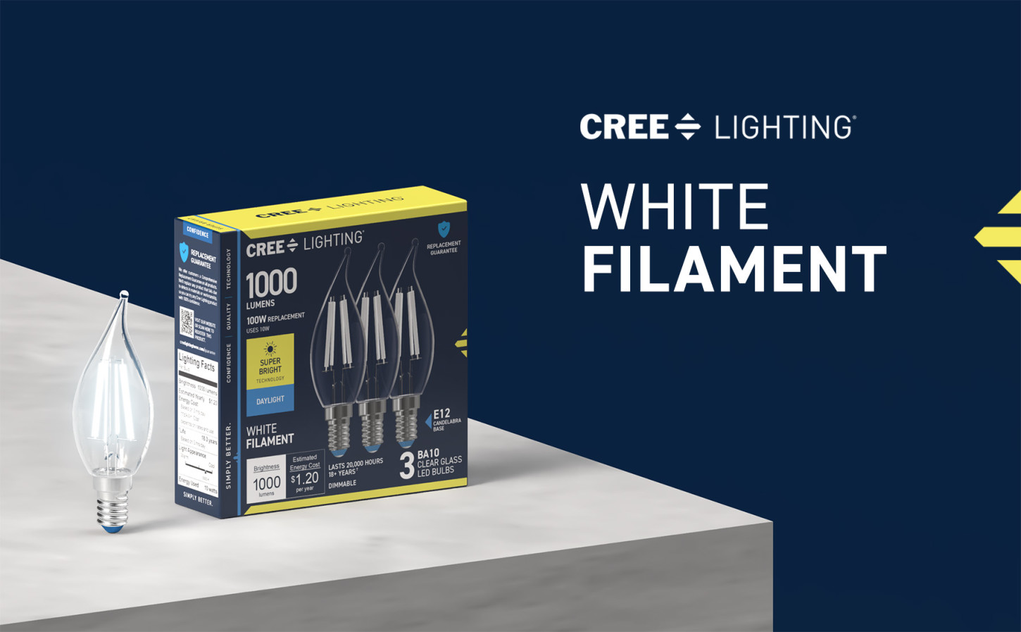 Refresh your lighting to fit your aesthetic with our Super Bright White Filament LED Daylight bulb. Equipped with low-profile, white coated filament design, these clear bulbs give off stunning, stylish illumination while on and blend seamlessly into your decor while off. The candle shape brings a high-end ambiance to your fixtures. Boost visibility and stay on task with the vibrant clarity of Daylight Light (5000K). The remarkable 90+ Color Rendering Index (CRI) makes colors appear more vivid and true-to-life, enhancing the beauty of your home’s decor and making everything look its best for up to 20,000 hours. This 1000-lumen bulb has a Candelabra E12 base, and replacements are fewer and further between with eco-friendly, LED bulb technology. This bulb does with 10W what a traditional incandescent bulb does with 100W, making it 90% more efficient. Whether it’s in your living room, home office, or kitchen, enjoy flicker-free, sustainable lighting that elevates your fixtures with effortlessly sleek style.