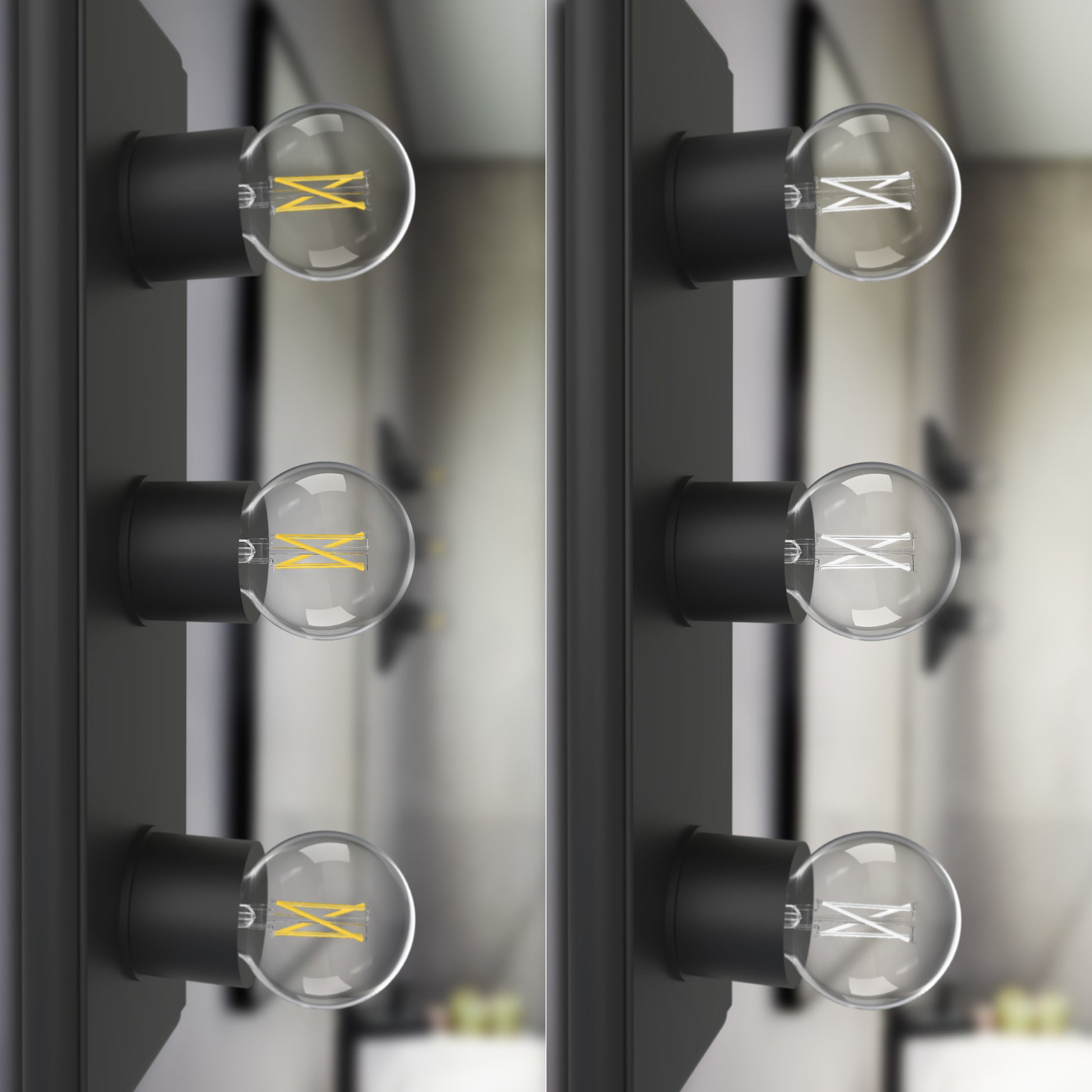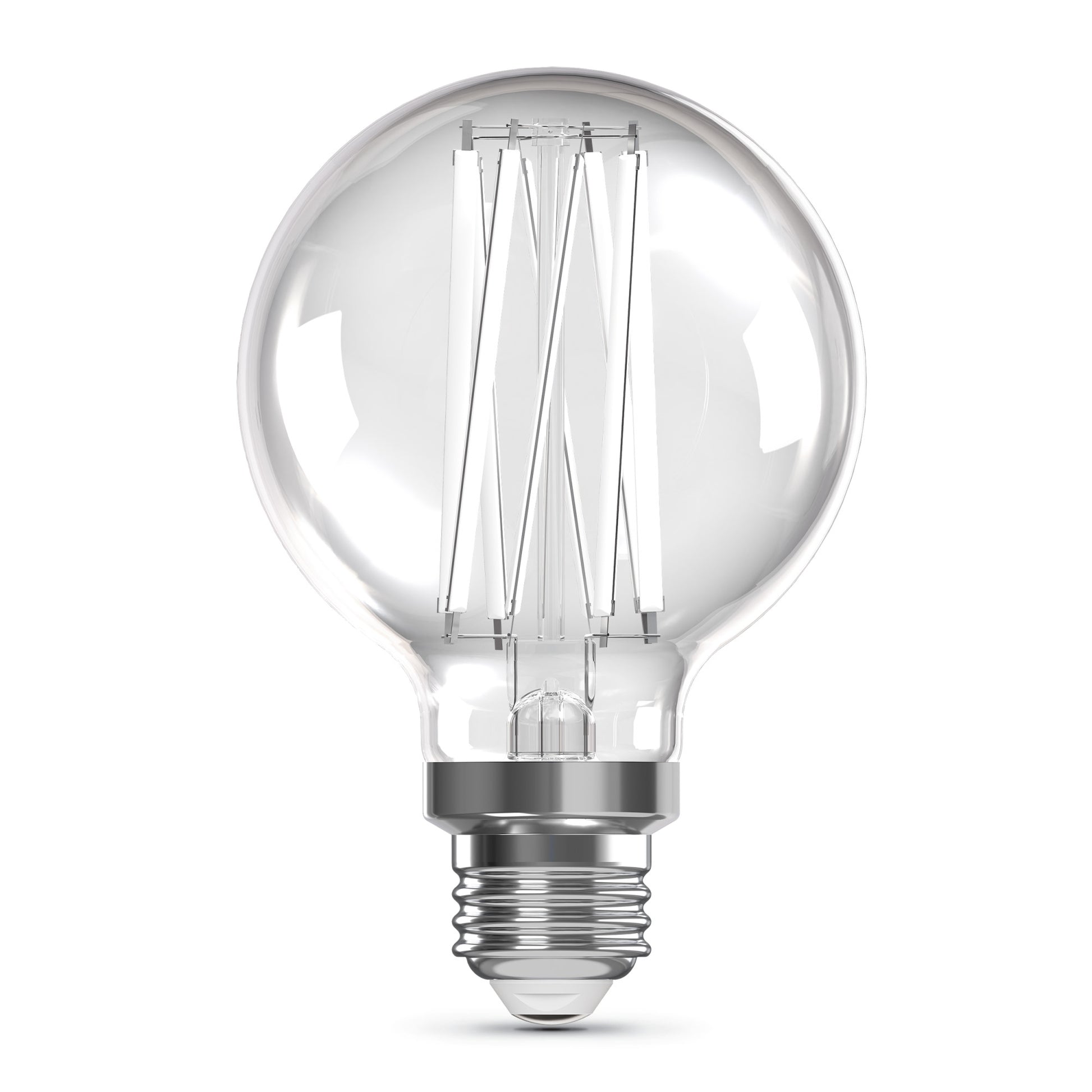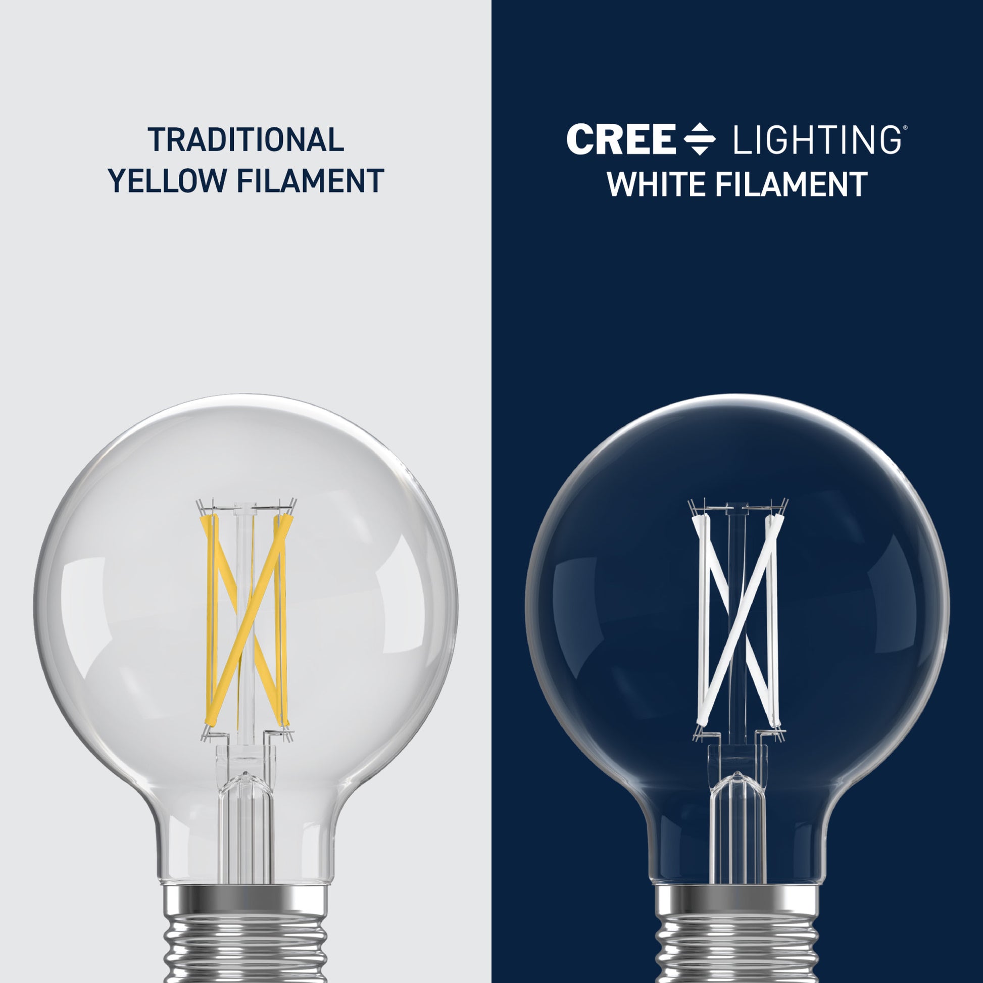 Upgrade your exposed lighting fixtures with the Cree Lighting G25 Super Bright Switchable White light bulb, designed to deliver quality, efficiency, and style in any room. Its stunning globe shape is ideal for decorative fixtures like hanging pendants and bathroom vanities. Equipped with low-profile, white coated filament design, these clear bulbs give off stunning, stylish illumination while on and blend seamlessly into your decor while off. Toggle between Soft White (2700K), Warm White (3000K), Bright White (3500K), Cool White (4000K), and Daylight (5000K) to suit any room, whether you’re going for cozy and inviting, bright and energizing, or matching other lighting in the room. With a remarkable 90+ Color Rendering Index (CRI), colors appear more vivid and true-to-life, enhancing the beauty of your home’s decor and making everything look its best. Built to last with an impressive 20,000-hour lifespan, this energy-efficient LED saves time and money, reducing replacements and energy costs when compared to traditional 100W incandescent bulbs. With a medium E26 base for easy upgrades in almost any fixture, this bulb is suitable for indoor and outdoor enclosed fixtures and is fully dimmable. Illuminate your world with a bulb that’s mercury-free, sustainable, and effortlessly chic.