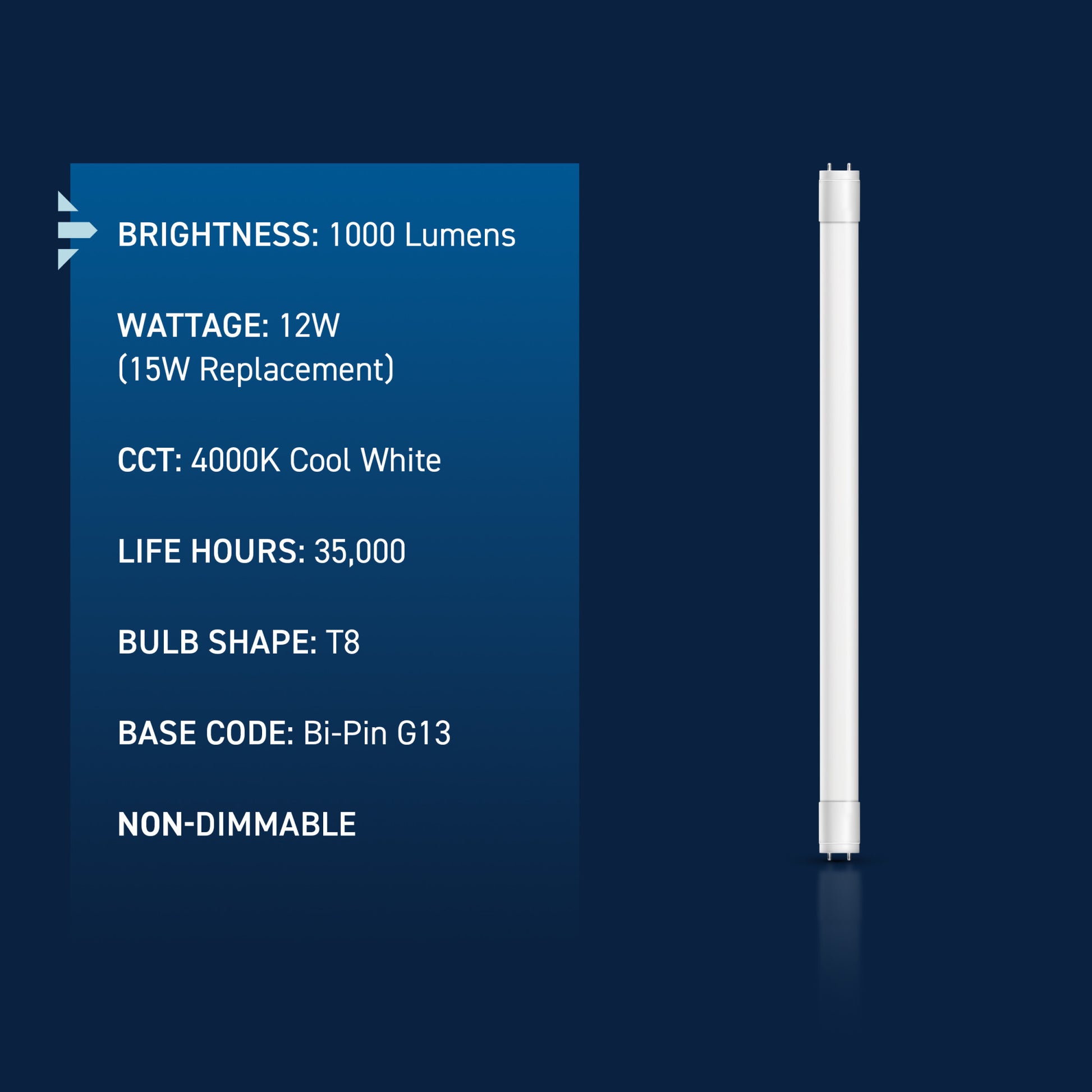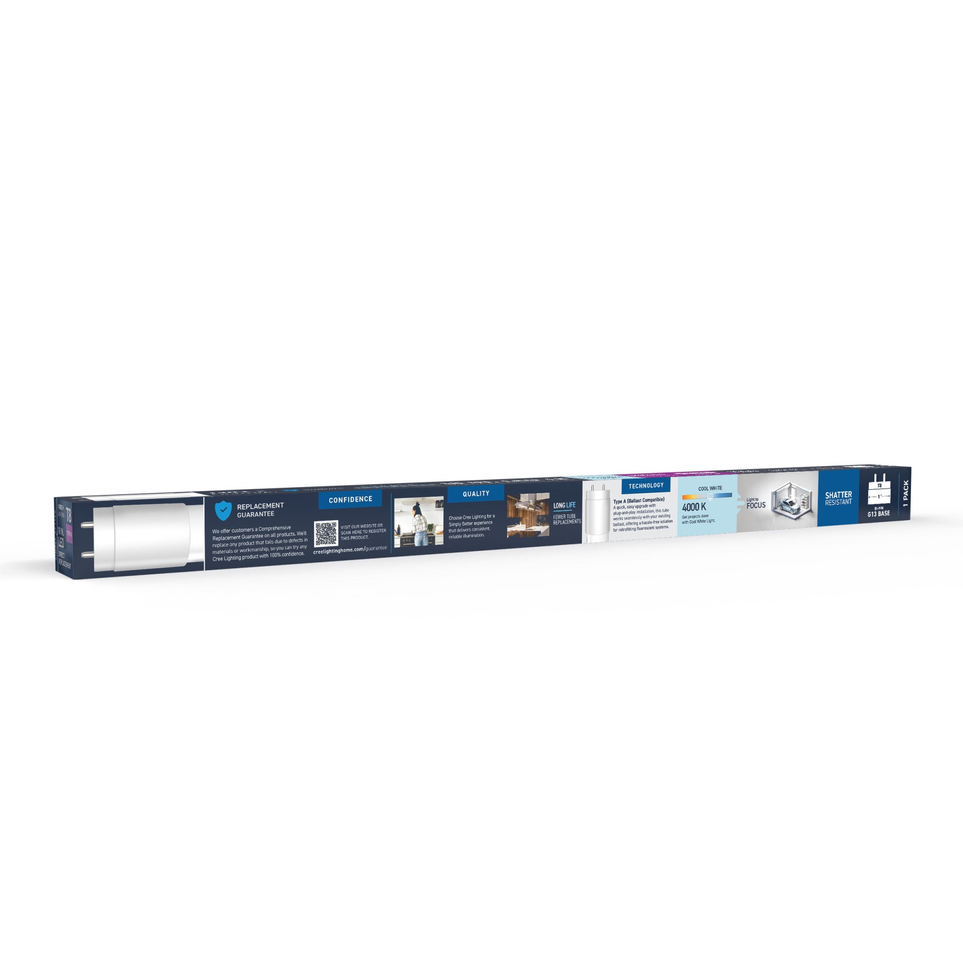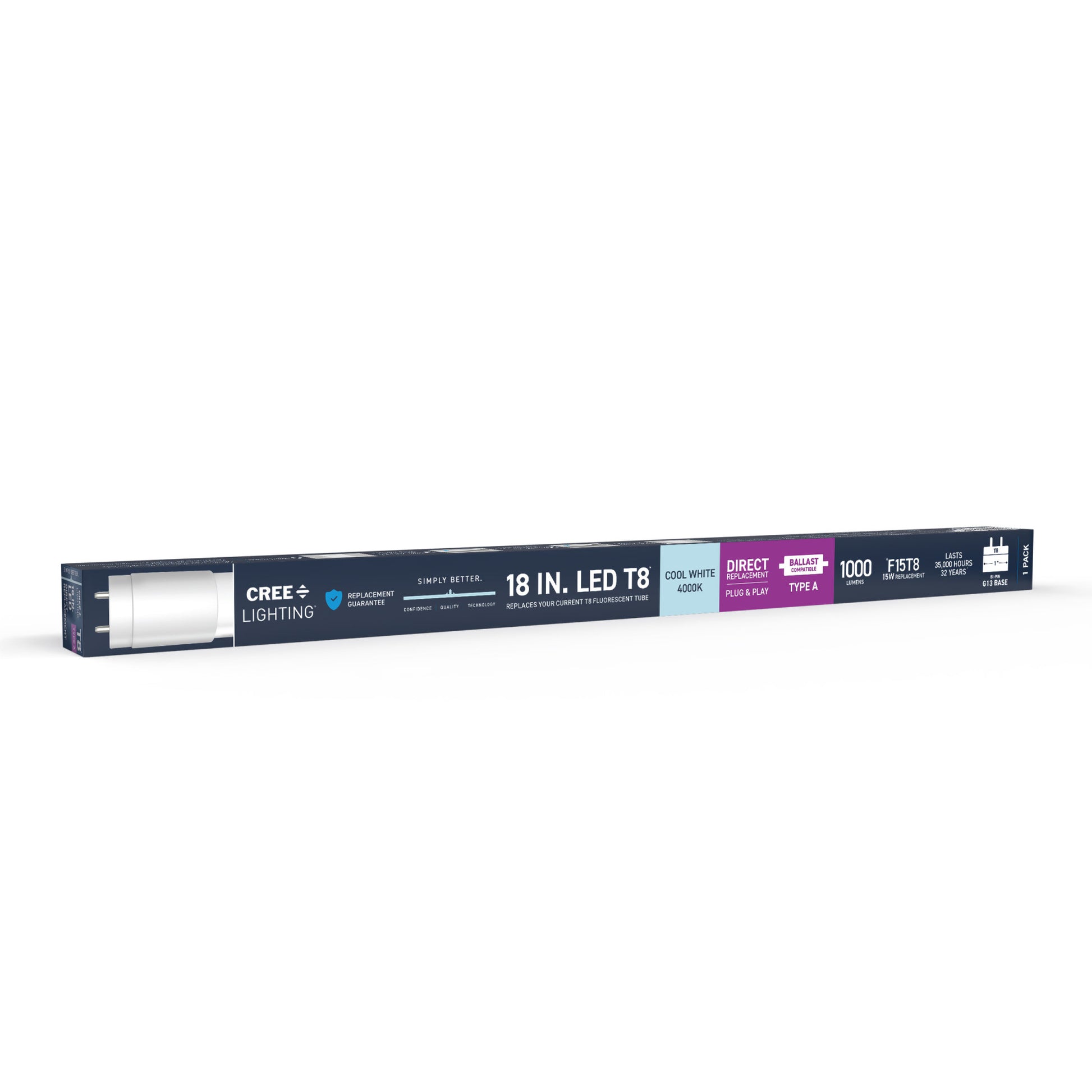 Upgrade your lighting game with Cree Lighting’s 18in LED Light Tube, a perfect replacement for T8 fluorescent bulbs in almost any commercial or business environment. This tube is a Type A Direct Replacement that works with most existing electronic ballasts for quick and easy plug-and-play installation, no rewiring required. 4000K Cool White CCT casts crisp, refreshing illumination to keep you sharp and productive. LED light turns on instantly without the warmup time required by fluorescents. This 1000 Lumen non-dimmable tube uses just 12W of electricity, with cool running performance for its entire 35,000-hour lifespan. Its bi-pin base makes for easy installation and upgrades. Whether it’s in the garage, storage unit, warehouse, or office, enjoy flicker-free, mercury-free lighting built to last.