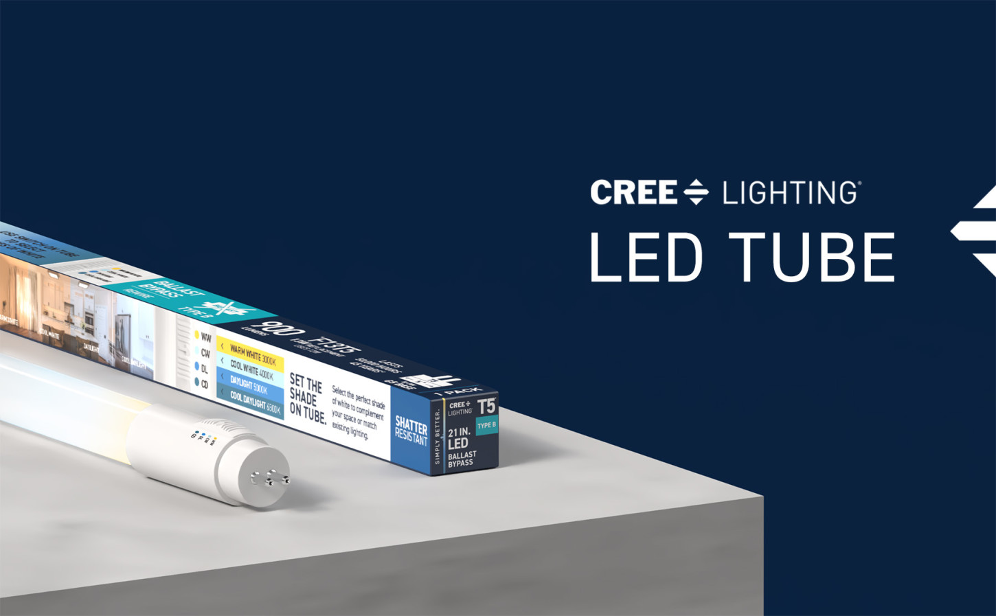 Upgrade your lighting game with Cree Lighting's 21in LED Light Tube, a perfect replacement for T5 fluorescent bulbs in almost any commercial or business environment. This tube is a Type B Ballast Bypass that uses direct wiring and requires less maintenance over time. Set your color temperature on the bulb before installation to get the right light for your space – 3000K Warm White, 4000K Cool White, 5000K Daylight, or 6500K Cool Daylight. LED light turns on instantly without the warmup time required by fluorescents. This 900 Lumen non-dimmable tube uses just 12W of electricity, with cool running performance for its entire 50,000-hour lifespan. Whether it's in the garage, storage unit, warehouse, or office, enjoy flicker-free, mercury-free lighting built to last.