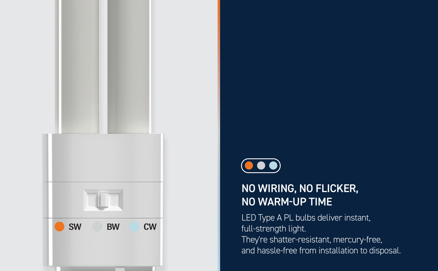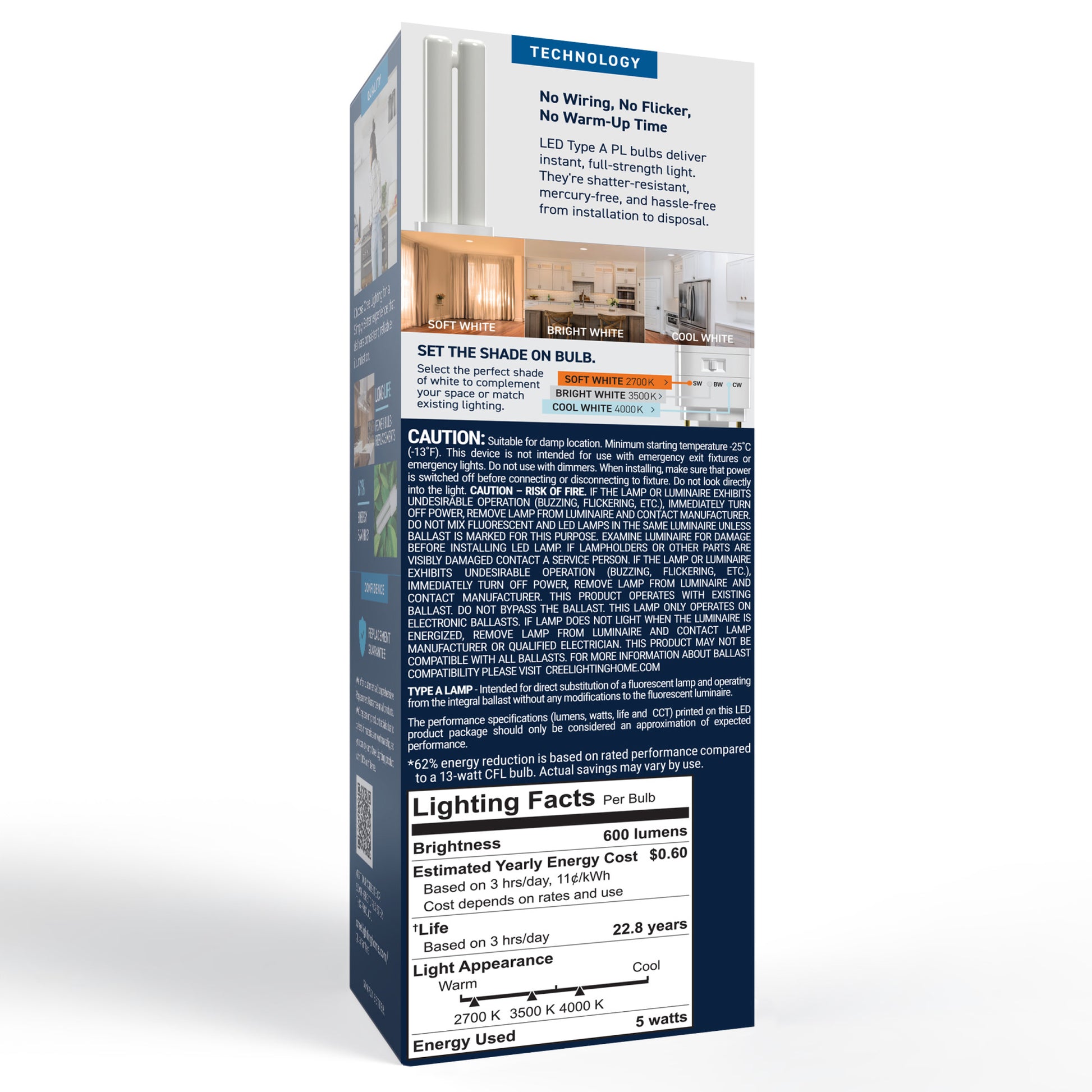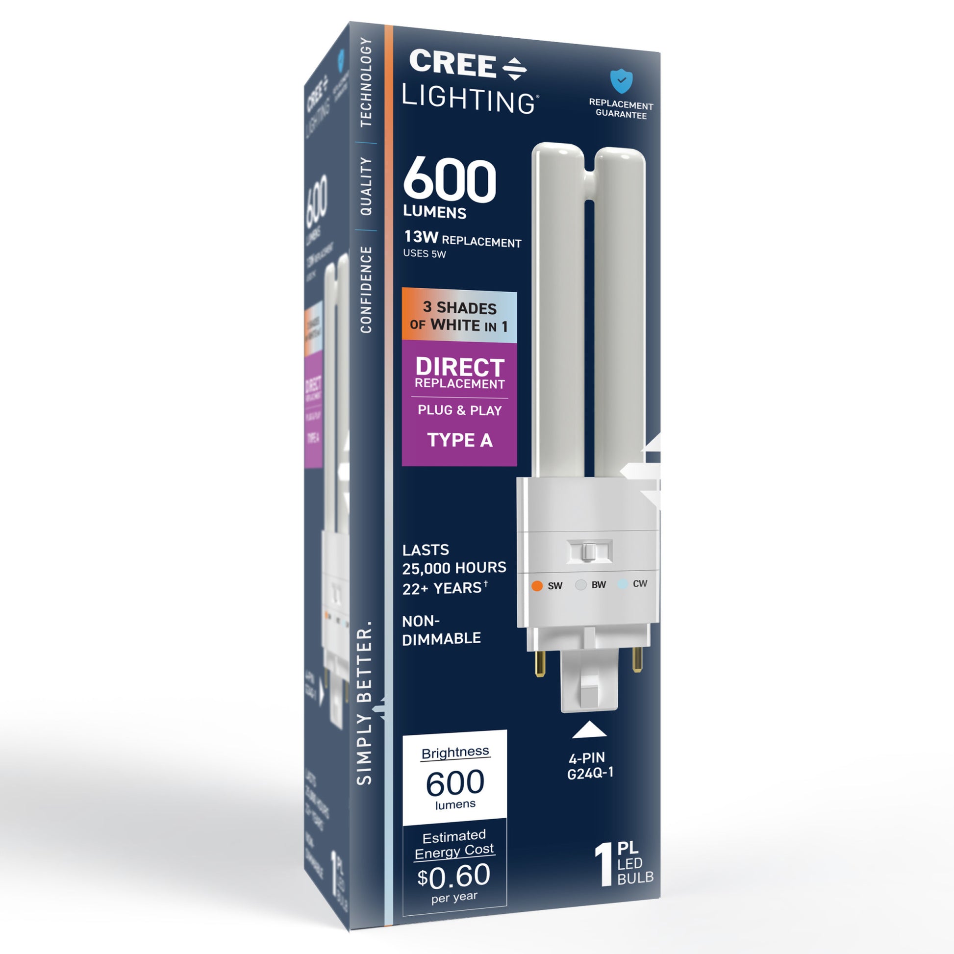Take control of your light with the 13W Replacement Double Twin Tube PL LED Bulb from Cree Lighting. With 3 color temperatures to choose from—Soft White, Bright White, and Cool White—this 5W retrofit bulb makes it easy to get the right look for any space. The GX24q-1 base is compatible with a wide range of recessed and ceiling fixtures, and the mercury-free LED lasts up to 25,000 hours.