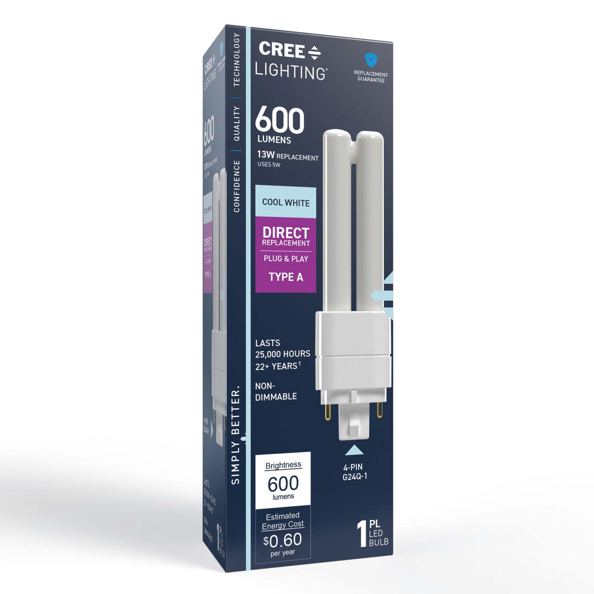 Get bright, functional lighting with the 13W Replacement Double Twin Tube PL LED Bulb from Cree Lighting. Designed for GX24q-1 base fixtures and delivering Cool White (4100K) light, this efficient 5W LED is ideal for task lighting, recessed ceilings, and utility areas. It’s mercury-free, long-lasting, and flicker-free—everything you want in a retrofit that works as hard as you do.