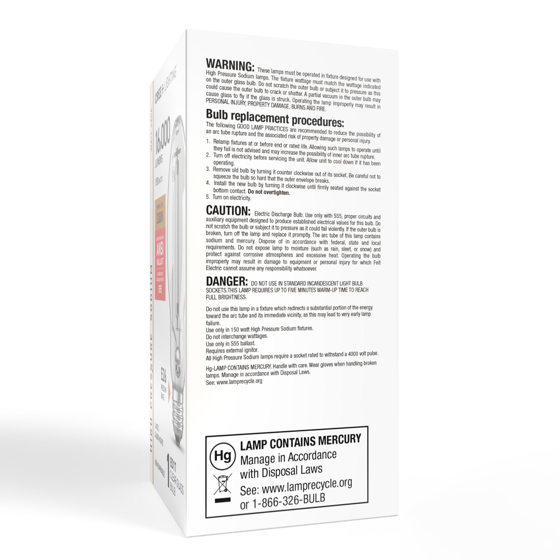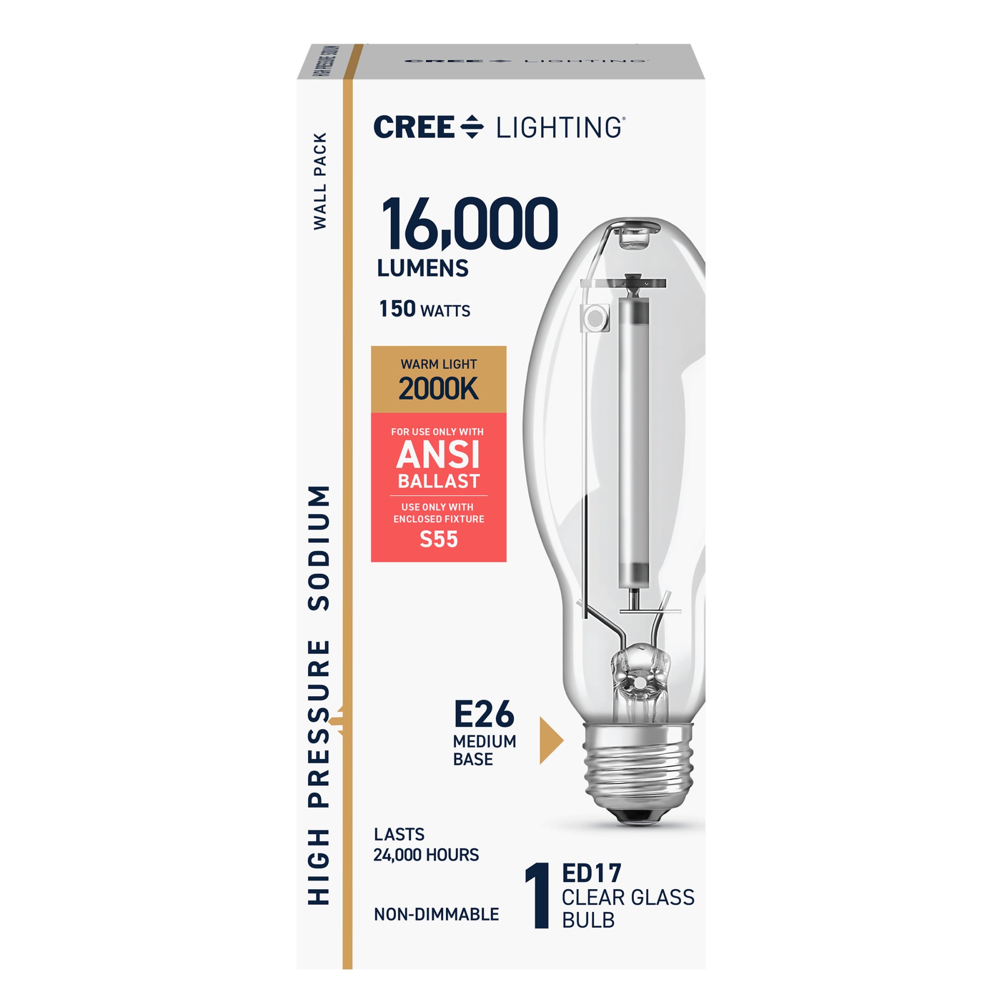 The Cree Lighting 150W High Pressure Sodium HID Bulb delivers powerful, long-lasting illumination for large-scale and industrial applications. Producing 16,000 lumens of Warm Light (2000K) light, this ED17 bulb with an E26 medium base is perfect for enclosed parking lot fixtures, high/low bays, and security lighting. Designed for use with ANSI S55 ballasts, it offers dependable performance for up to 24,000 hours—keeping maintenance low and visibility high.