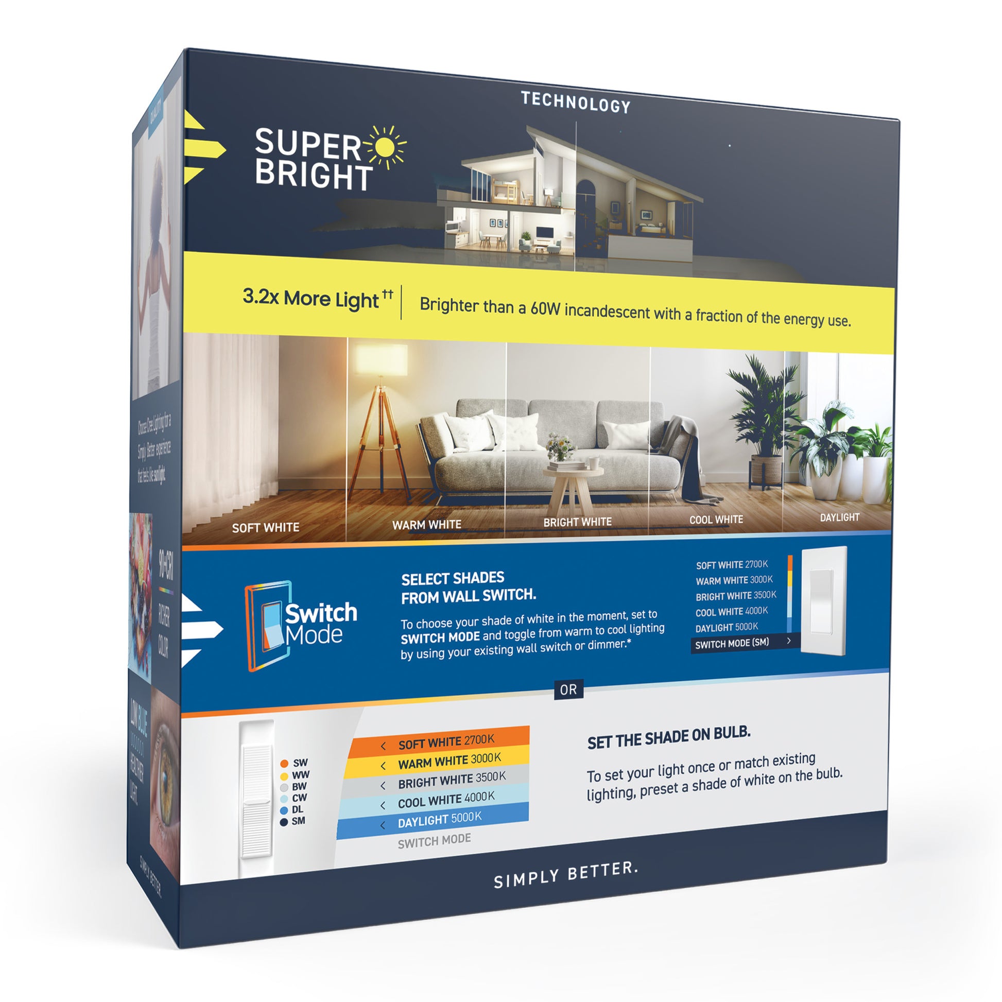 Upgrade your lighting game with this Super Bright Switchable White Dimmable LED Bulb. It’s 2605 Lumen output packs a punch in this small but mighty bulb. Preset Soft White (2700K), Warm White (3000K), Bright White (3500K), Cool White (4000K), or Daylight (5000K) before installation, or choose Switch Mode to use your wall switch to go from energizing light in the daytime to relaxing light at night. Energy-efficient LED technology replaces your traditional 150W incandescent bulb, saving money and energy without needing to be replaced for years to come. Low Blue technology filters harsh blue light that can cause eye strain, headaches, and disrupt sleep. With a remarkable 90+ Color Rendering Index (CRI), colors appear more vivid and true-to-life, enhancing the beauty of your home’s décor and making everything look its best. Built to last with an impressive 25,000-hour lifespan and featuring a medium E26 base, this energy-efficient LED saves you money and time, reducing replacements and energy costs compared to a traditional 150W incandescent bulb. With a medium-sized E26 base, this dimmable bulb provides an easy upgrade in most fixtures. Whether it’s your grand foyer, the garage, or the patio, enjoy flicker-free, eco-friendly lighting designed with sustainability in mind.