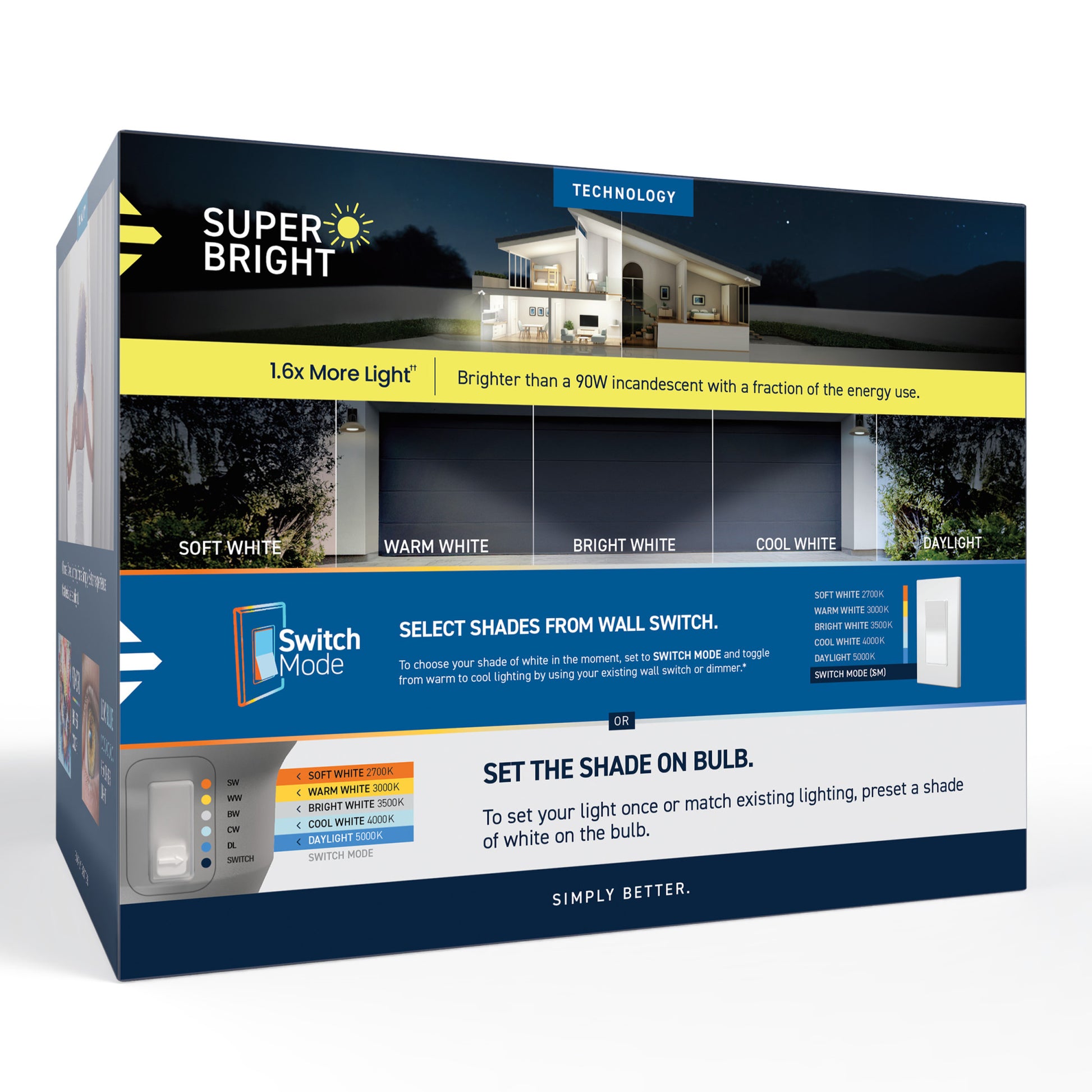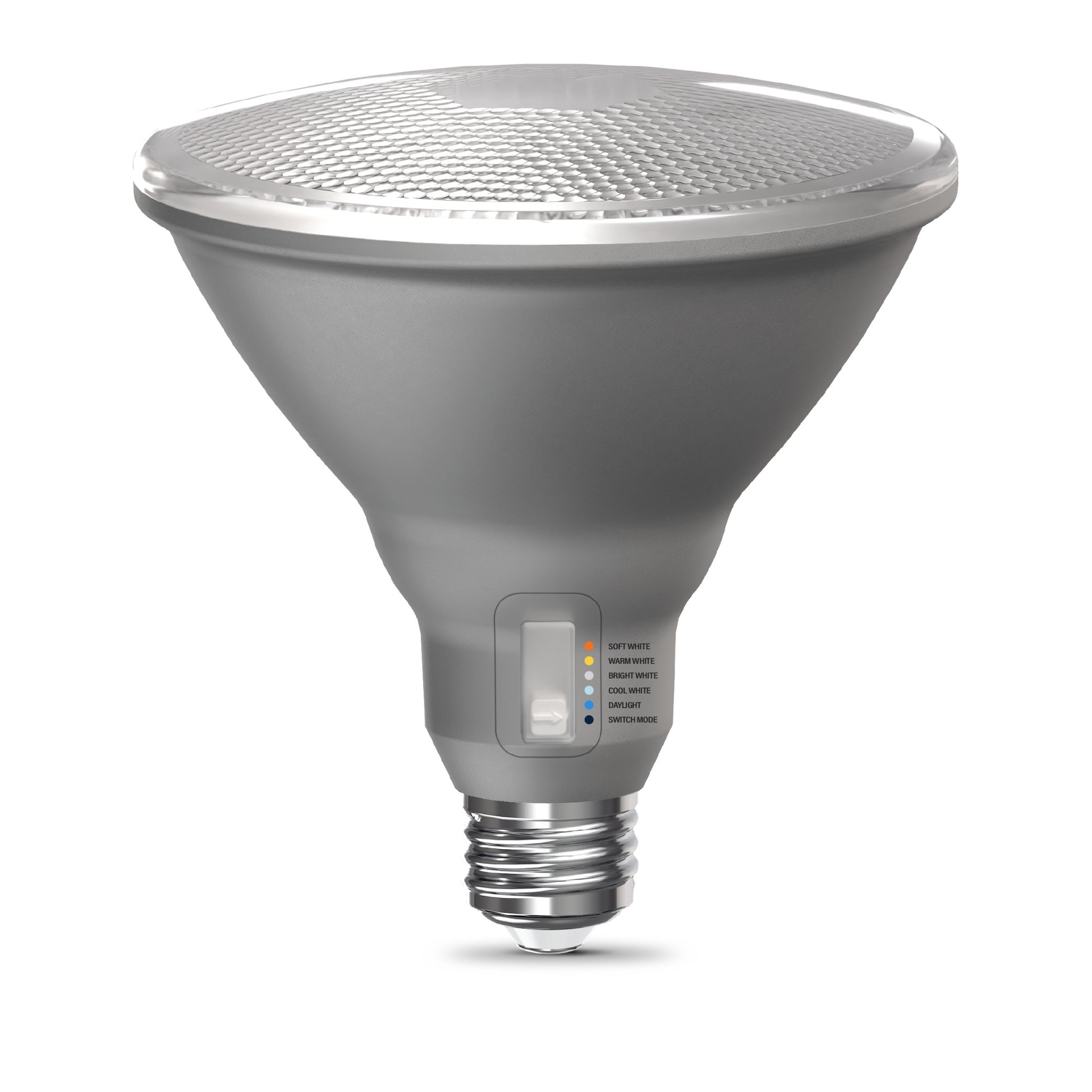 Upgrade your lighting game with our Super Bright 5 Shade + Switch Mode White LED Bulb. Preset Soft White (2700K), Warm White (3000K), Bright White (3500K), Cool White (4000K), or Daylight (5000K) before installation, or choose Switch Mode to use your wall switch to go from energizing light in the daytime to relaxing light at night. Low Blue technology filters out harsh blue light that can cause eye strain, headaches, and disrupt sleep. With a remarkable 90+ Color Rendering Index (CRI), colors appear more vivid and true-to-life, enhancing the beauty of your home’s décor and making everything look its best. Built to last with an impressive 25,000-hour lifespan, this energy-efficient LED saves you money and time, reducing replacements and energy costs when compared to a traditional 150W incandescent bulb. With a medium-sized E26 base, this dimmable bulb provides an easy upgrade in most fixtures. Whether it’s your garage, foyer, or patio, enjoy flicker-free, eco-friendly lighting that’s mercury-free and designed for sustainability. Illuminate your world with a bulb that combines comfort, clarity, and reliability—all in one brilliant package.
