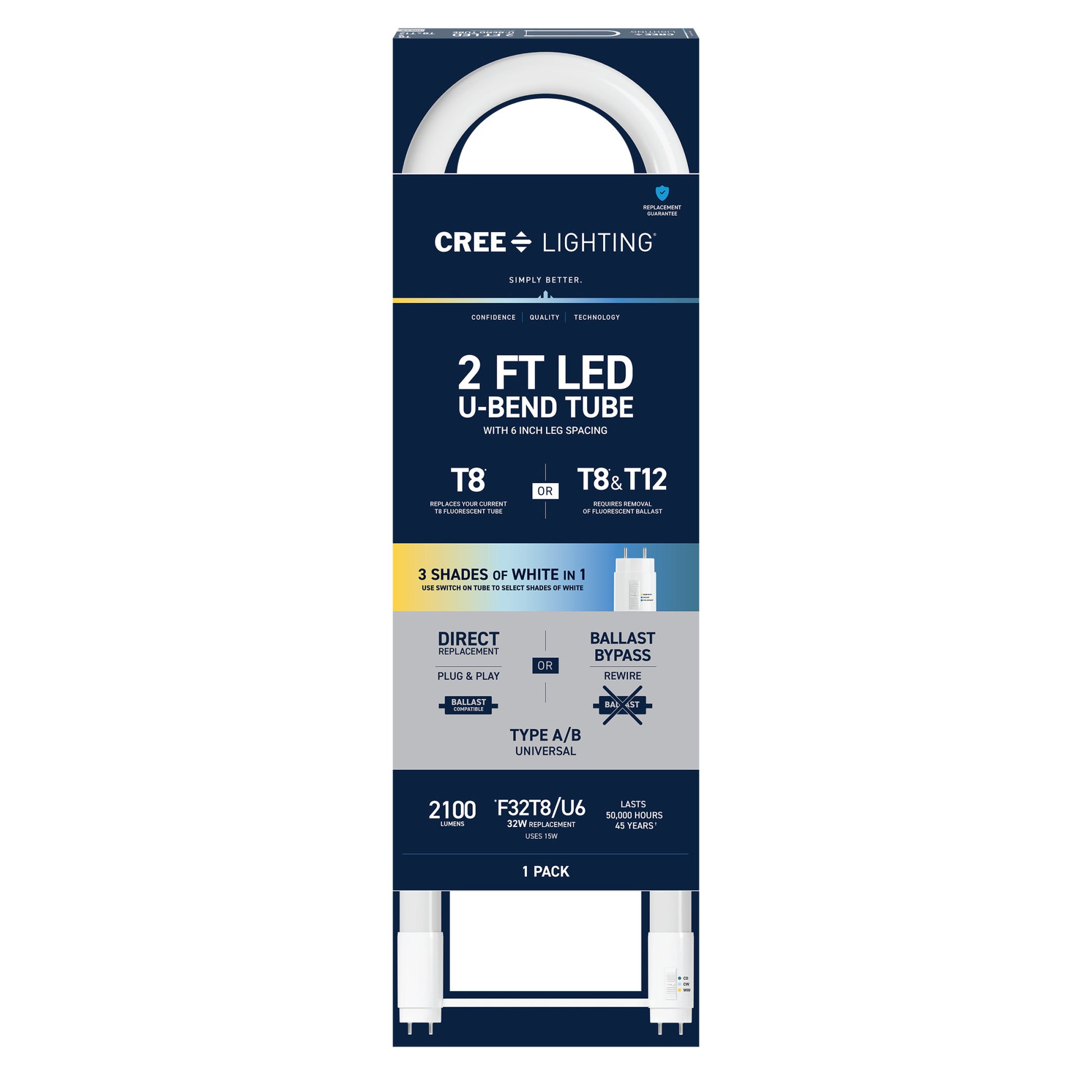 Upgrade your lighting game with Cree Lighting’s 2ft LED U-Bend Light Tube, a perfect replacement for T8 fluorescent bulbs in almost any commercial or business environment. This tube is a Type AB Replacement that allows you to plug in play for fast installation or hardwire for less maintenance over time. Set your color temperature on the bulb before installation to get the right light for your space – 3000K Warm White, 4000K Cool White, or 6500K Cool Daylight. LED light turns on instantly without the warmup time required by fluorescents. This 2100 Lumen non-dimmable tube uses just 15W of electricity, with cool running performance for its entire 50,000-hour lifespan. Whether it’s in the garage, retail environment, or office, enjoy flicker-free, mercury-free lighting built to last.
