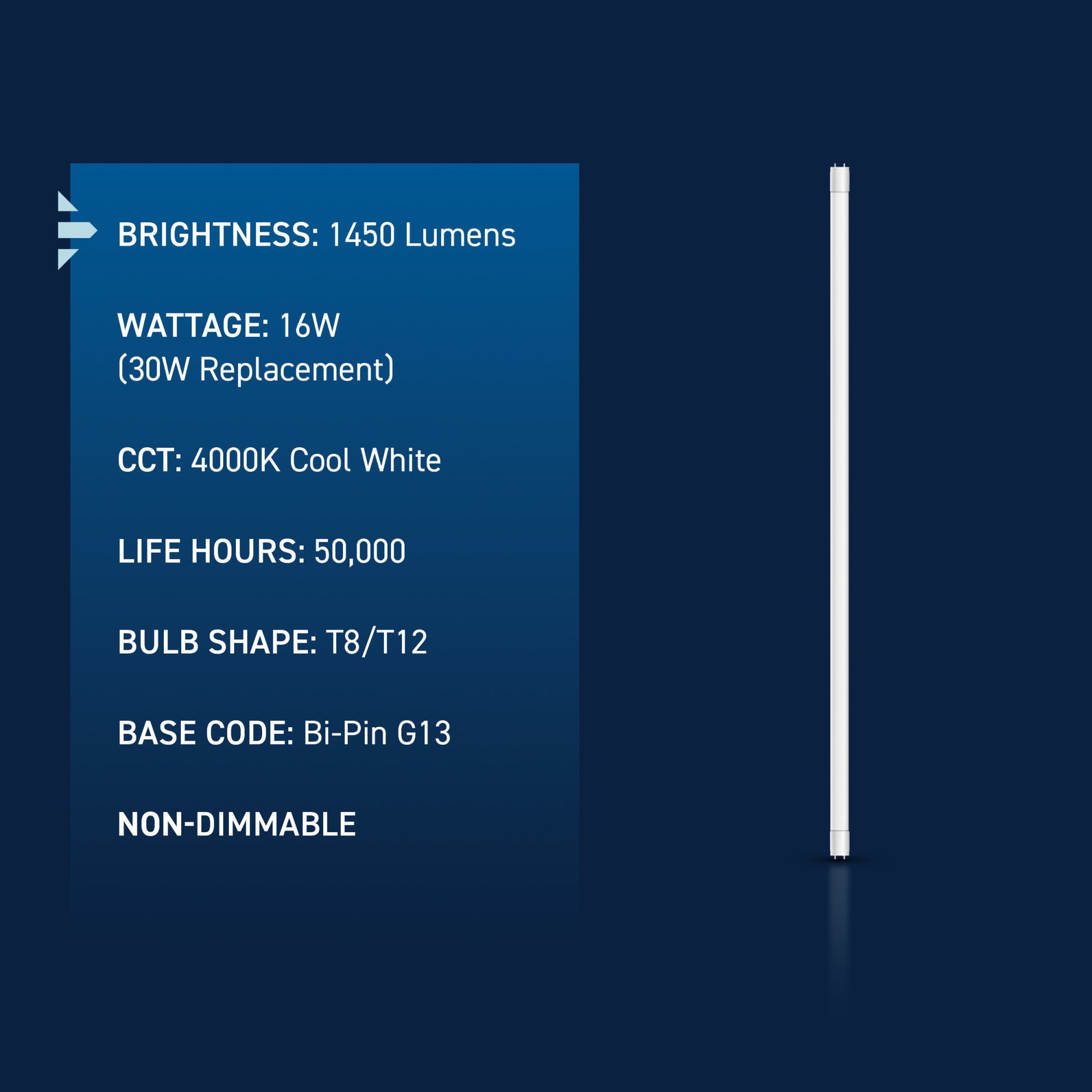 - 16W T8/T12 shape LED is ideal for replacing 30W fluorescent tubes