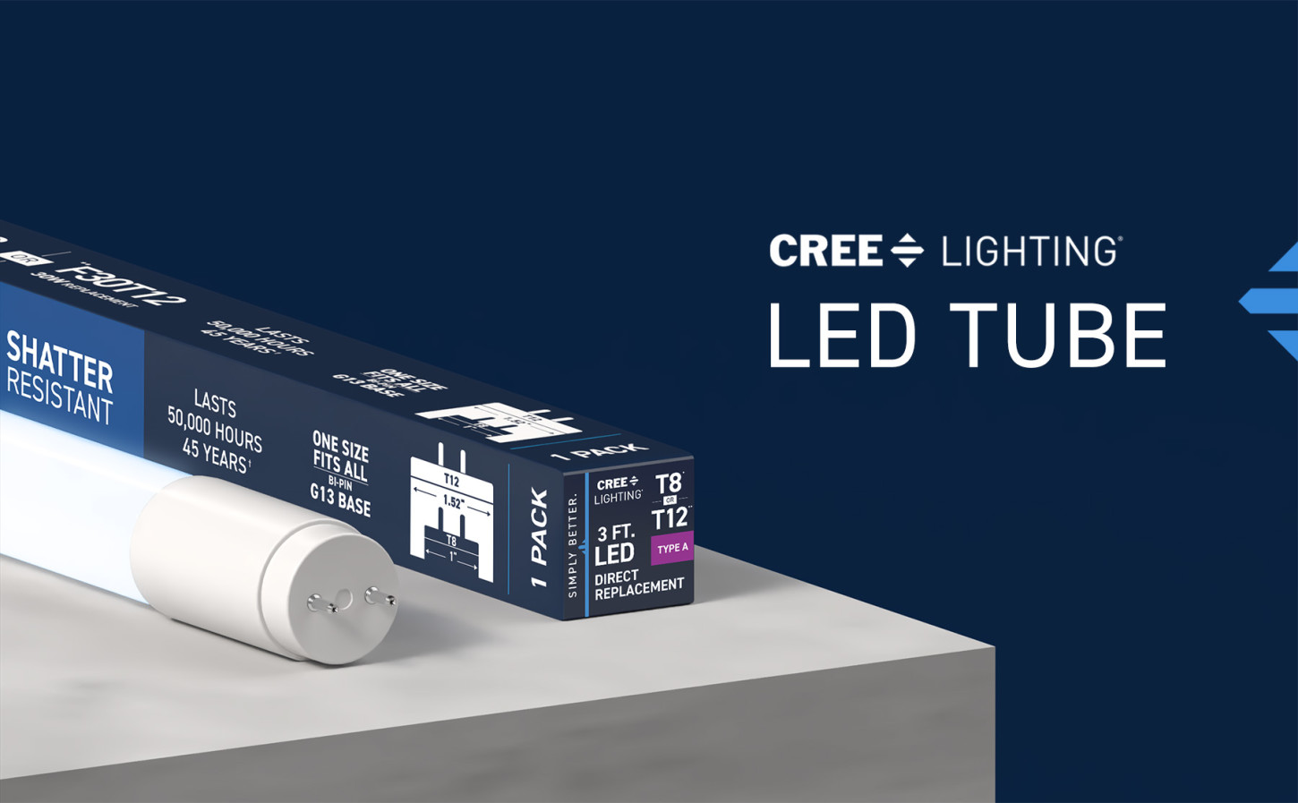 Upgrade your lighting game with Cree Lighting’s 3ft LED Light Tube, a perfect replacement for T8/T12 fluorescent bulbs in office and commercial environments. This tube is a Type A Direct Replacement that works with most existing electronic ballasts for quick and easy plug-and-play installation, no rewiring required. Boost visibility and stay on task with the vibrant clarity of Daylight Light. LED light turns on instantly without the warmup time required by fluorescents. This 1450 Lumen non-dimmable tube uses 16W of electricity, with cool running performance for its entire 50,000-hour lifespan. Whether it’s in an office, retail, or commercial space, enjoy flicker-free, mercury-free lighting built to last.