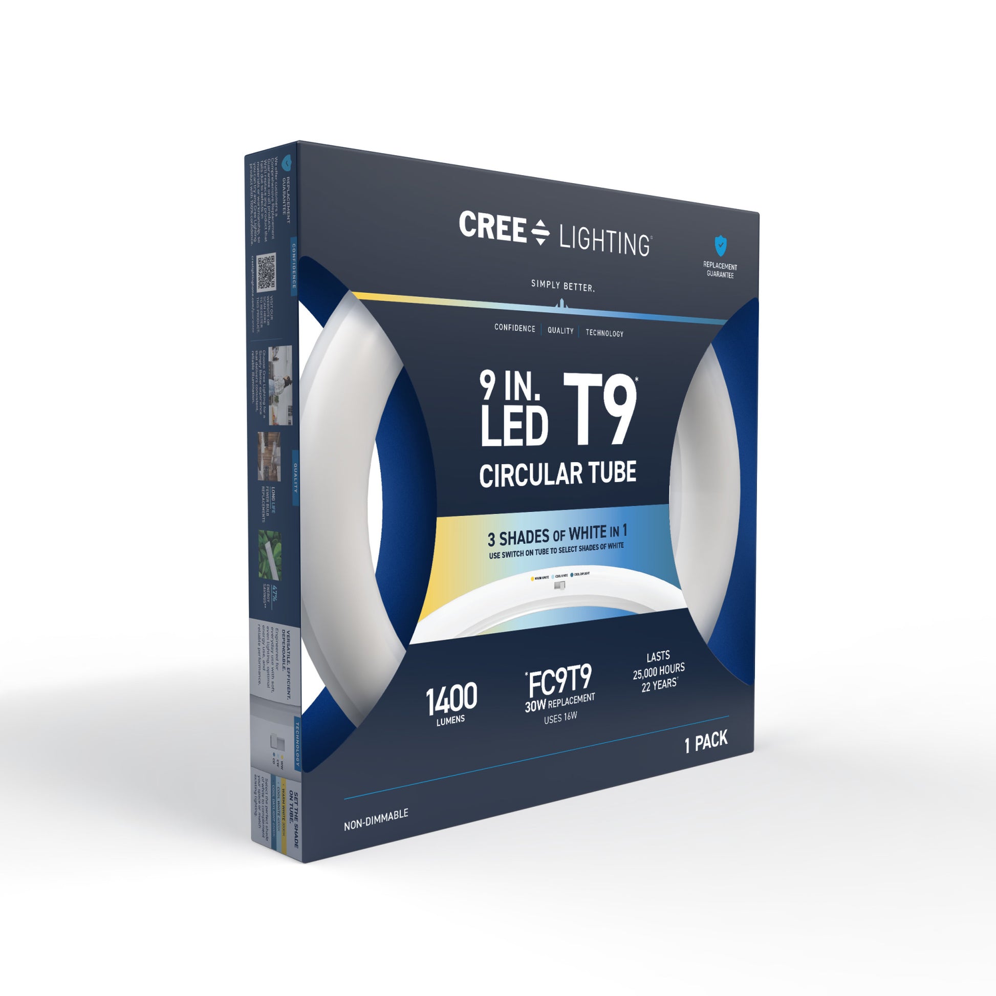 Upgrade your lighting game with Cree Lighting’s 9in Circular LED Light Tube, a perfect replacement for T9 fluorescent bulbs in almost any commercial or business environment. This tube is a Type A Direct Replacement that works with most existing electronic ballasts for quick and easy plug-and-play installation, no rewiring required. Set your color temperature on the bulb before installation to get the right light for your space – 3000K Warm White, 4000K Cool White, or 6500K Cool Daylight. LED light turns on instantly without the warmup time required by fluorescents. This 1400 Lumen non-dimmable tube uses just 16W of electricity, with cool running performance for its entire 25,000-hour lifespan. Whether it’s in the garage, storage unit, warehouse, or office, enjoy flicker-free, mercury-free lighting built to last.