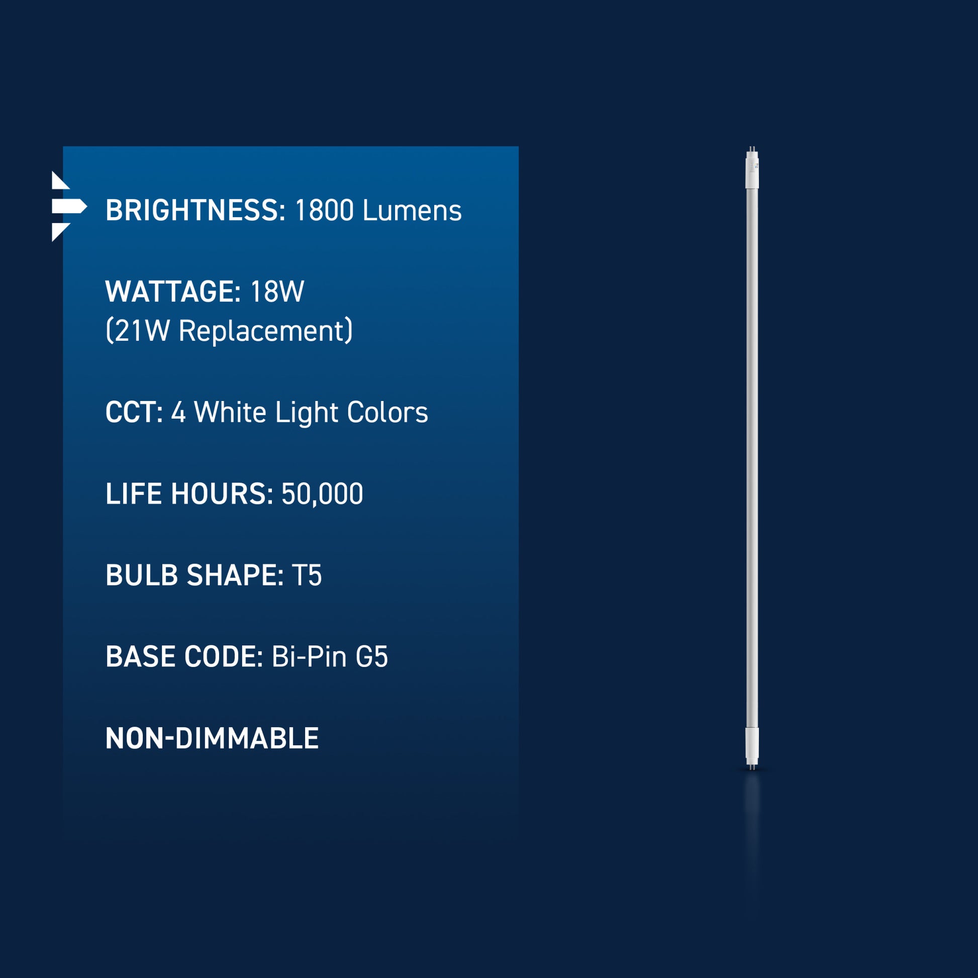 - 18W T5 shape LED is ideal for replacing 21W fluorescent tubes