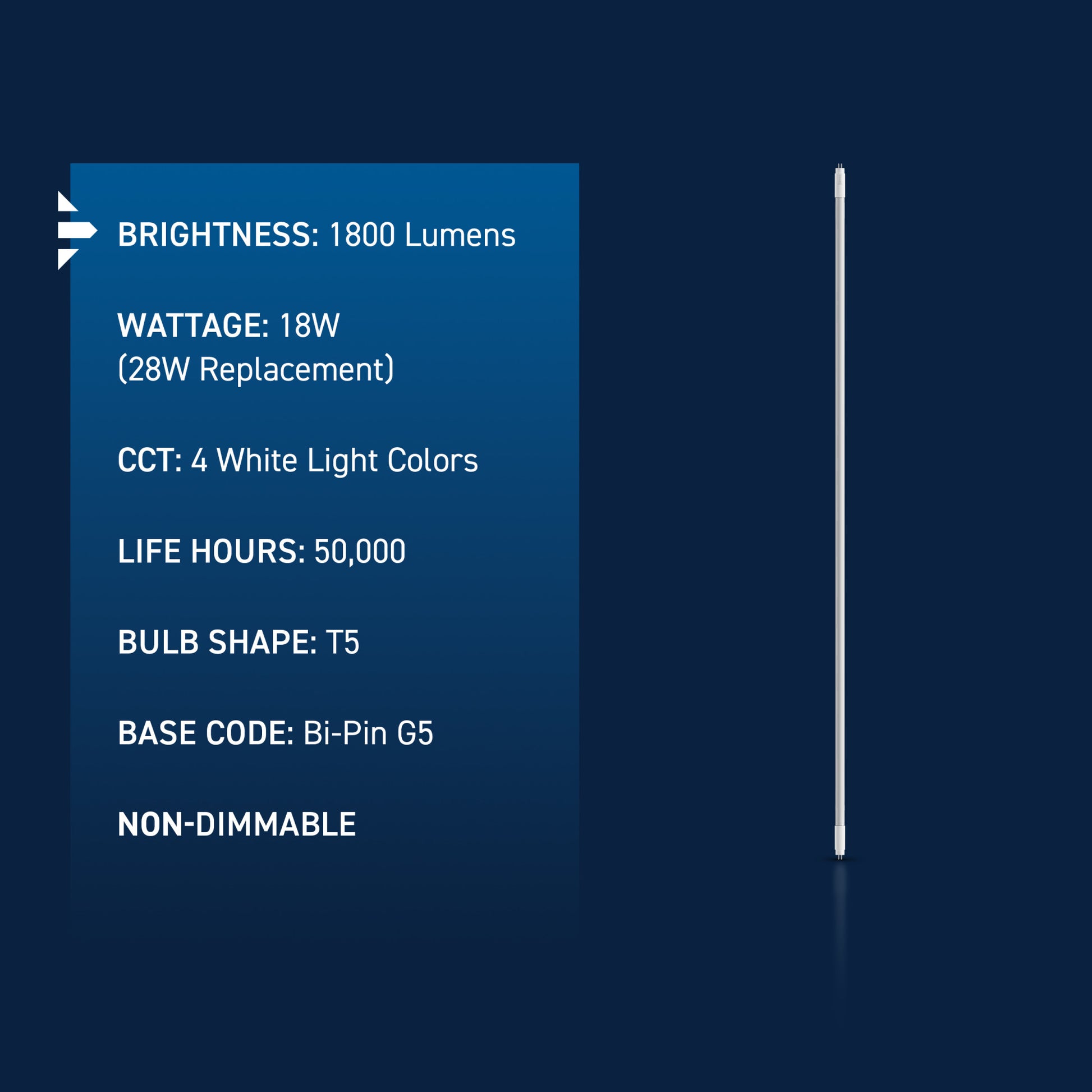 - 18W T5 shape LED is ideal for replacing 28W fluorescent tubes, saving 36% on energy and costs