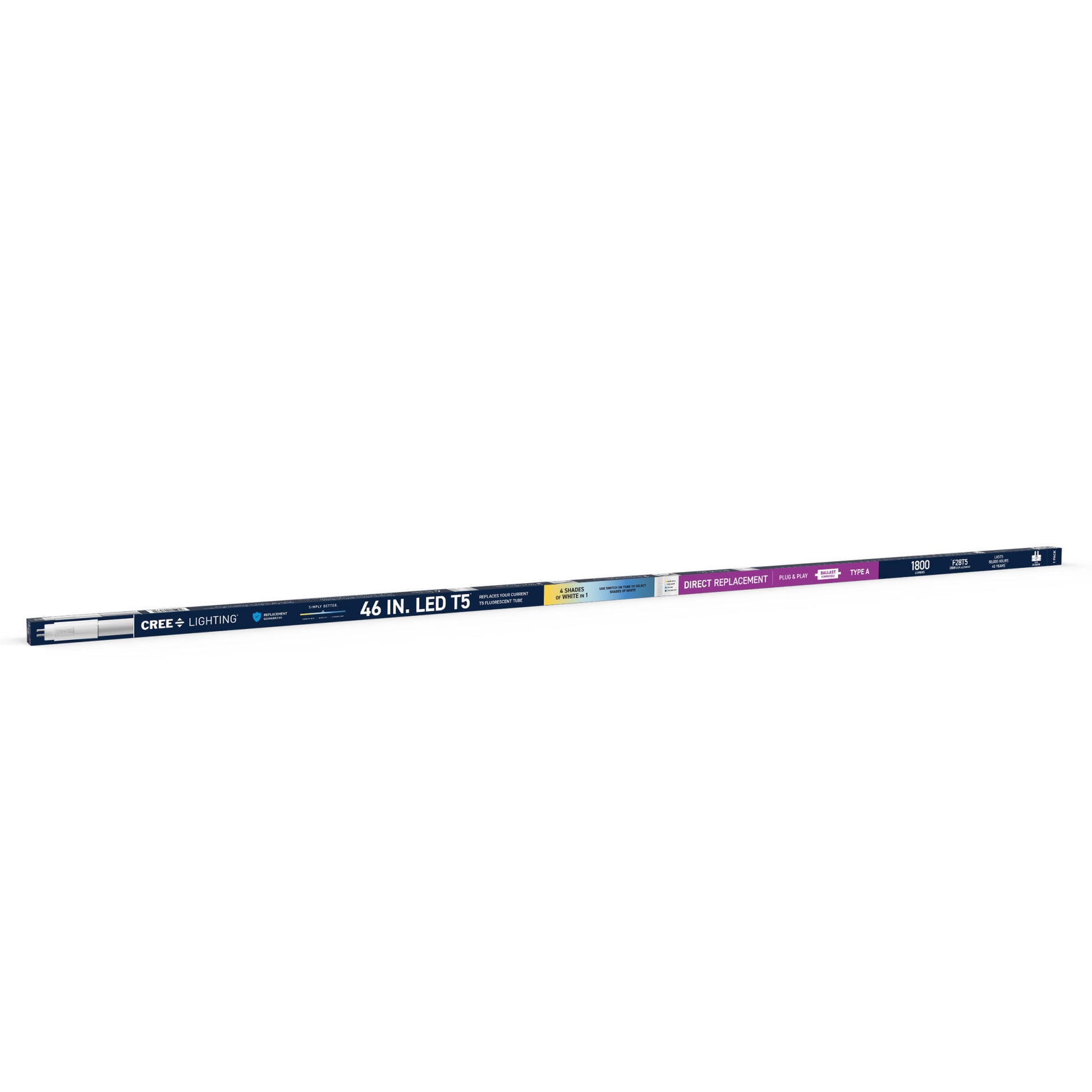 Upgrade your lighting game with Cree Lighting’s 46in Linear LED Light Tube, a perfect replacement for T5 fluorescent bulbs in almost any commercial or business environment. This tube is a Type A Direct Replacement that works with most existing electronic ballasts for quick and easy plug-and-play installation, no rewiring required. Set your color temperature on the bulb before installation to get the right light for your space – 3000K Warm White, 4000K Cool White, 5000K Daylight, or 6500K Cool Daylight. LED light turns on instantly without the warmup time required by fluorescents. This 1800 Lumen non-dimmable tube uses just 18W of electricity, with cool running performance for its entire 50,000-hour lifespan. Whether it’s in the garage, storage unit, warehouse, or office, enjoy flicker-free, mercury-free lighting built to last.