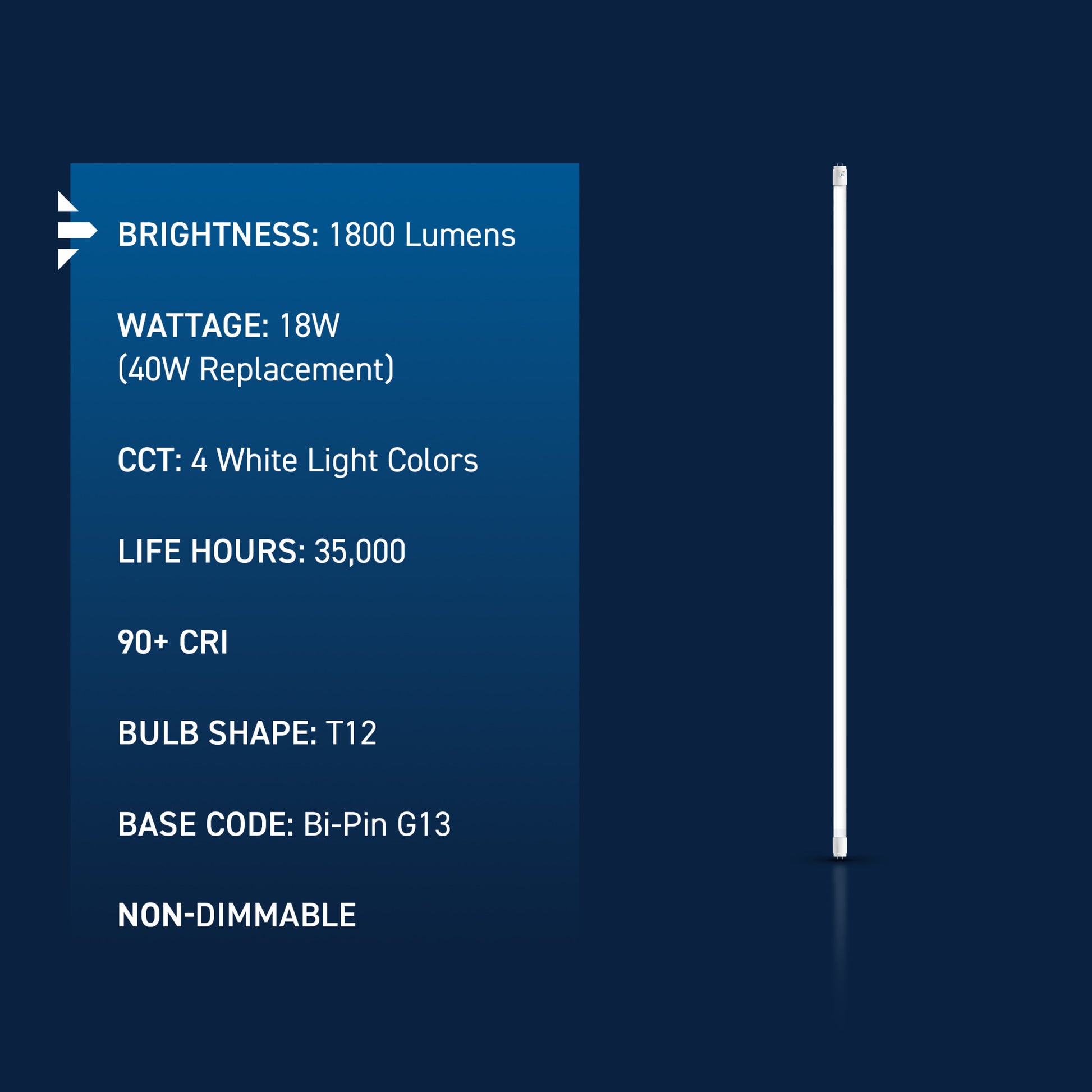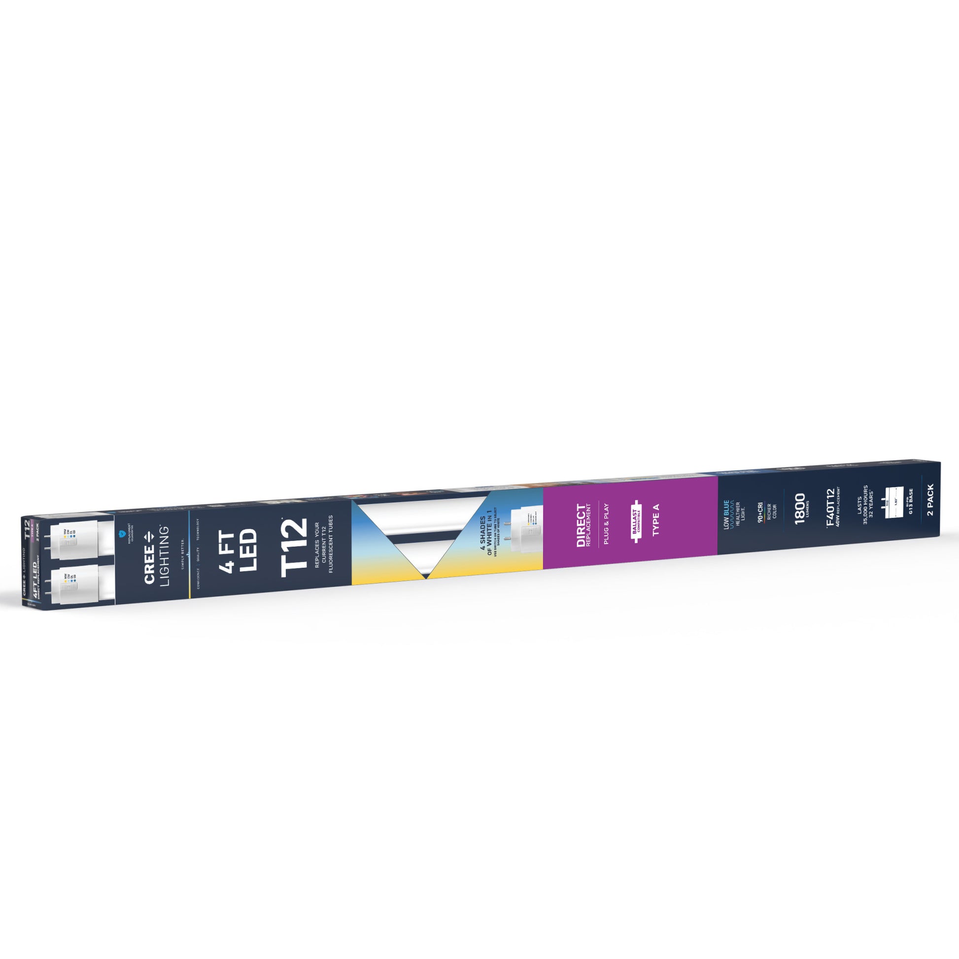 Upgrade your lighting game with Cree Lighting’s 4ft LED Light Tube, a perfect replacement for T12 fluorescent bulbs in public and commercial environments. This tube is a Type A Direct Replacement that works with most existing electronic ballasts for quick and easy plug-and-play installation, no rewiring required. Set your color temperature on the bulb before installation to get the right light for your space – 3000K Warm White, 4000K Cool White, 5000K Daylight, or 6500K Cool Daylight. The remarkable 90+ Color Rendering Index (CRI) makes colors appear more vivid and true-to-life, enhancing the beauty of your space and making everything look its best. LED light turns on instantly without the warmup time required by fluorescents. This 1800 Lumen non-dimmable tube uses 18W of electricity, with cool running performance for its entire 35,000-hour lifespan. Whether it’s in a garage, warehouse, or commercial space, enjoy flicker-free, mercury-free lighting built to last.