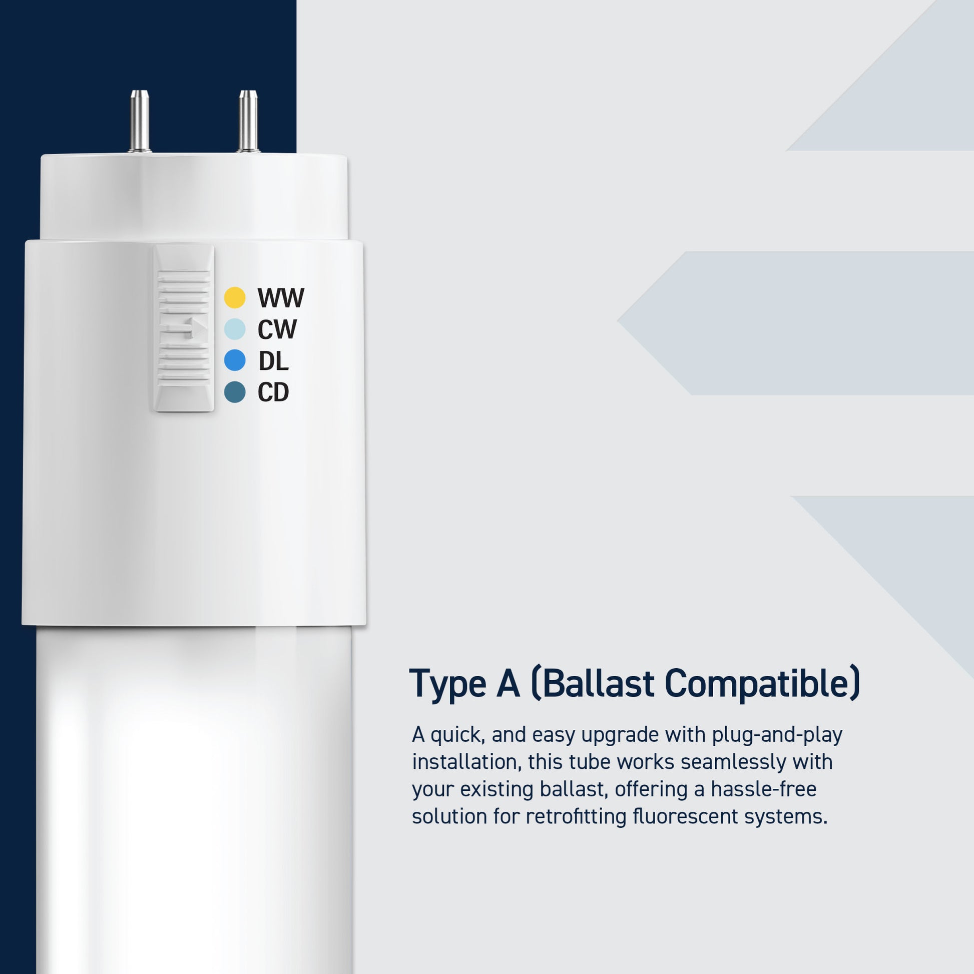 - Type A Direct Replacement uses existing ballasts for easy installation, no hardwiring required