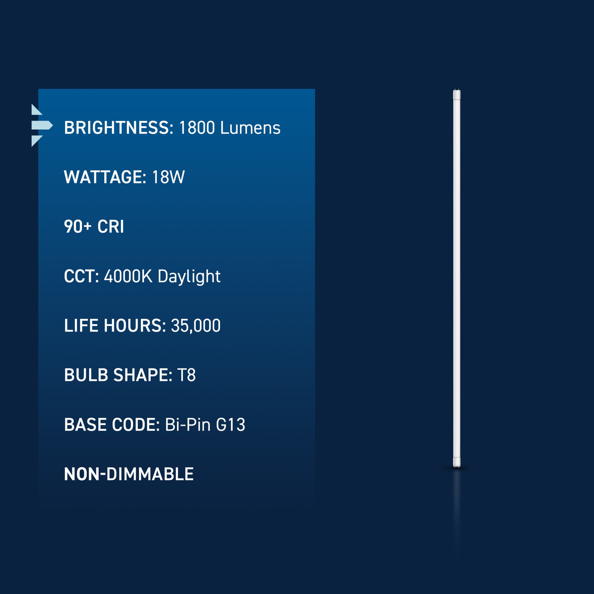 Upgrade your lighting game with Cree Lighting’s 4ft LED Light Tube, a perfect replacement for T8 fluorescent bulbs in office and commercial environments. This tube is a Type A Direct Replacement that works with most existing electronic ballasts for quick and easy plug-and-play installation, no rewiring required. Create a crisp, refreshing environment with 4000K Cool White light. The remarkable 90+ Color Rendering Index (CRI) makes colors appear more vivid and true-to-life, enhancing the beauty of your space and making everything look its best. LED light turns on instantly without the warmup time required by fluorescents. This 1800 Lumen non-dimmable tube uses 18W of electricity, with cool running performance for its entire 35,000-hour lifespan. Low Blue technology filters harsh blue light that can cause eye strain, headaches, and disrupt sleep. Whether it’s in an office, retail, or commercial space, enjoy flicker-free, mercury-free lighting built to last.