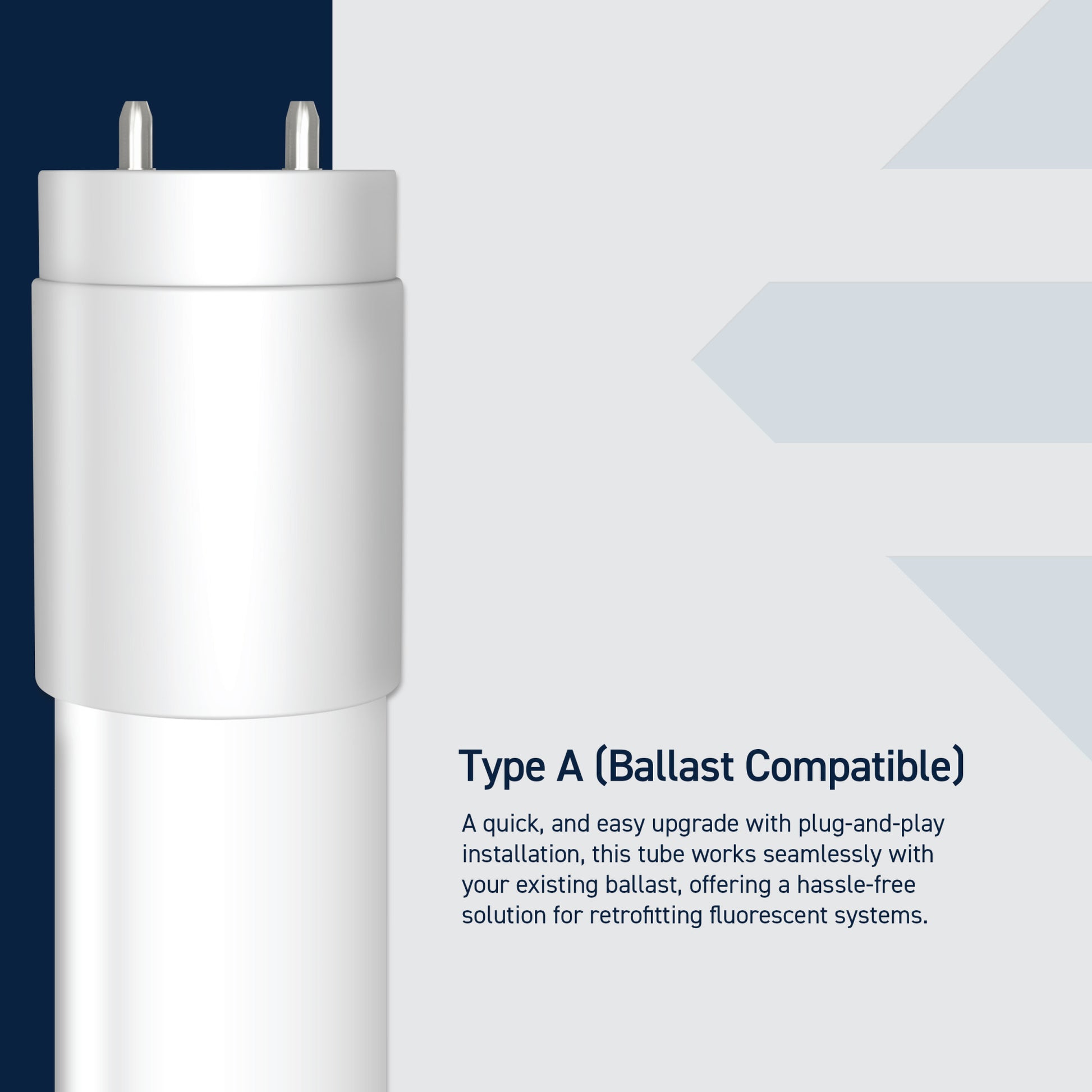 - Type A Direct Replacement uses existing ballasts for easy installation, no hardwiring required