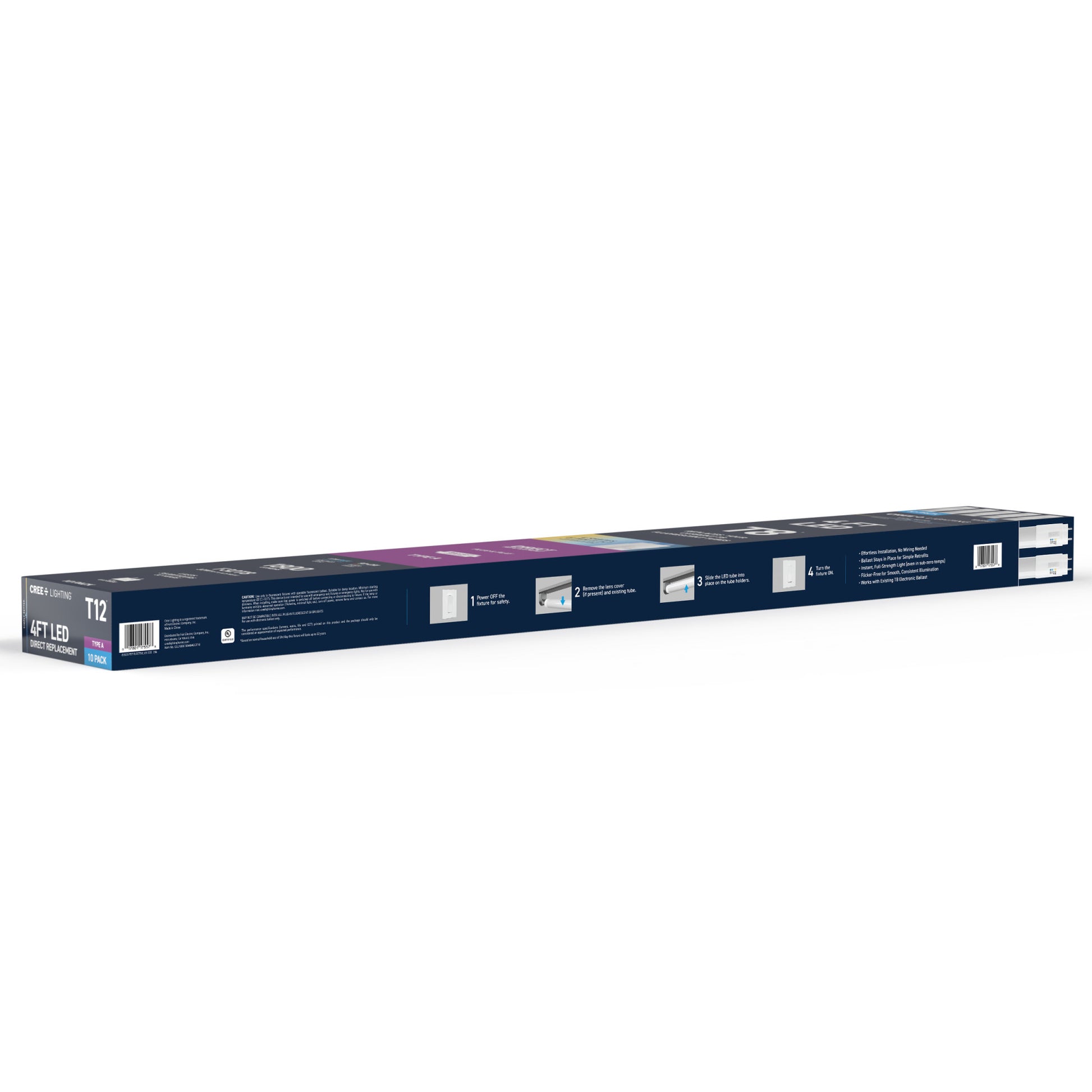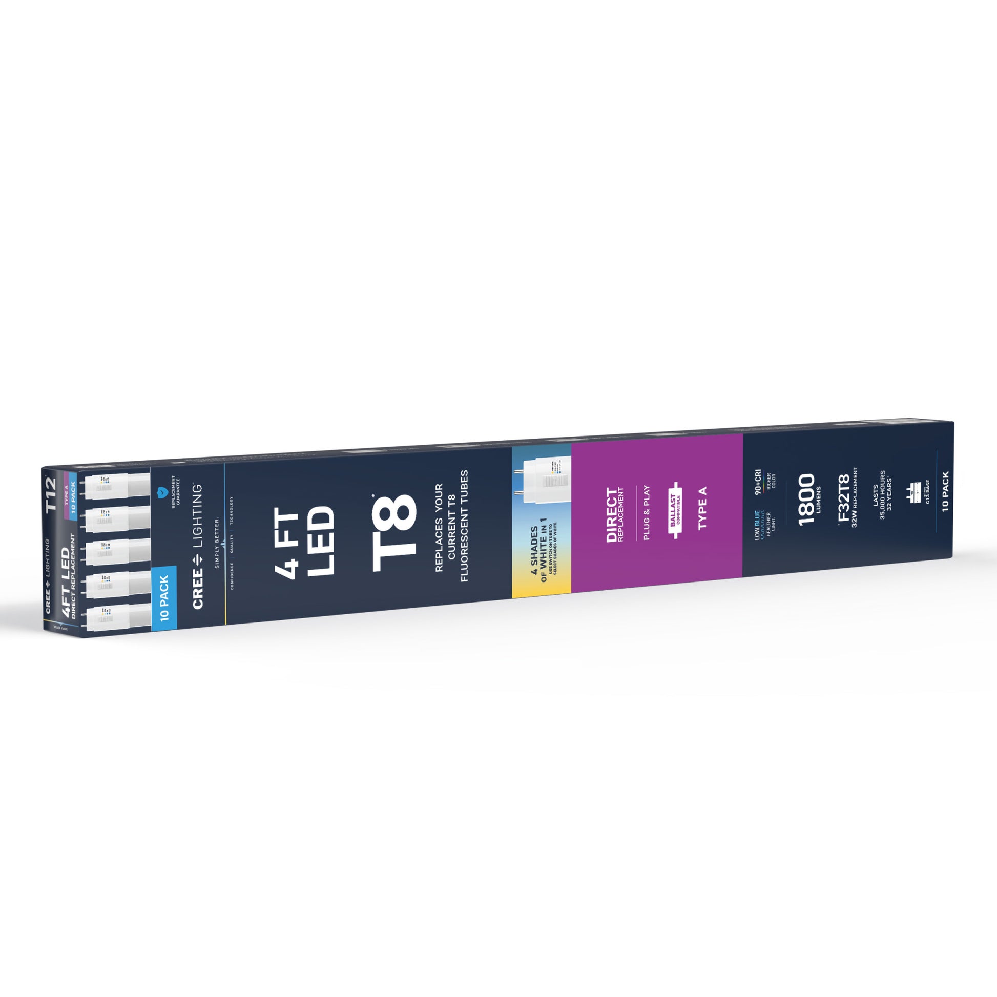 Upgrade your lighting game with Cree Lighting’s 4ft LED Light Tube, a perfect replacement for T8 fluorescent bulbs in public and commercial environments. This tube is a Type A Direct Replacement that works with most existing electronic ballasts for quick and easy plug-and-play installation, no rewiring required. Set your color temperature on the bulb before installation to get the right light for your space – 3000K Warm White, 4000K Cool White, 5000K Daylight, or 6500K Cool Daylight. The remarkable 90+ Color Rendering Index (CRI) makes colors appear more vivid and true-to-life, enhancing the beauty of your space and making everything look its best. LED light turns on instantly without the warmup time required by fluorescents. LED light turns on instantly without the warmup time required by fluorescents. This 1800 Lumen non-dimmable tube uses 18W of electricity, with cool running performance for its entire 35,000-hour lifespan. Whether it’s in a garage, warehouse, or commercial space, enjoy flicker-free, mercury-free lighting built to last.