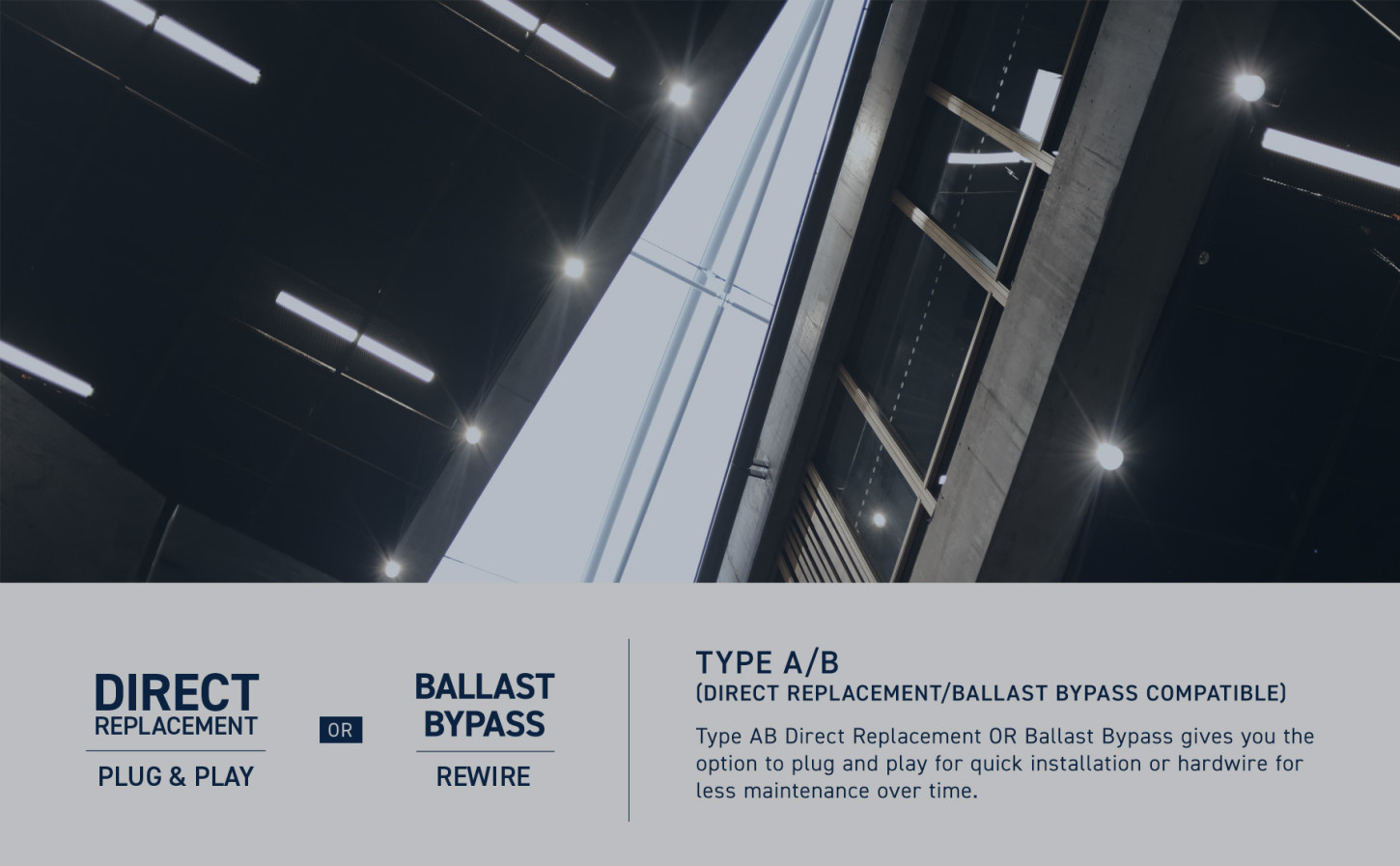 - Type AB Direct Replacement and Ballast Bypass gives you the option to plug and play or hardwire during installation
