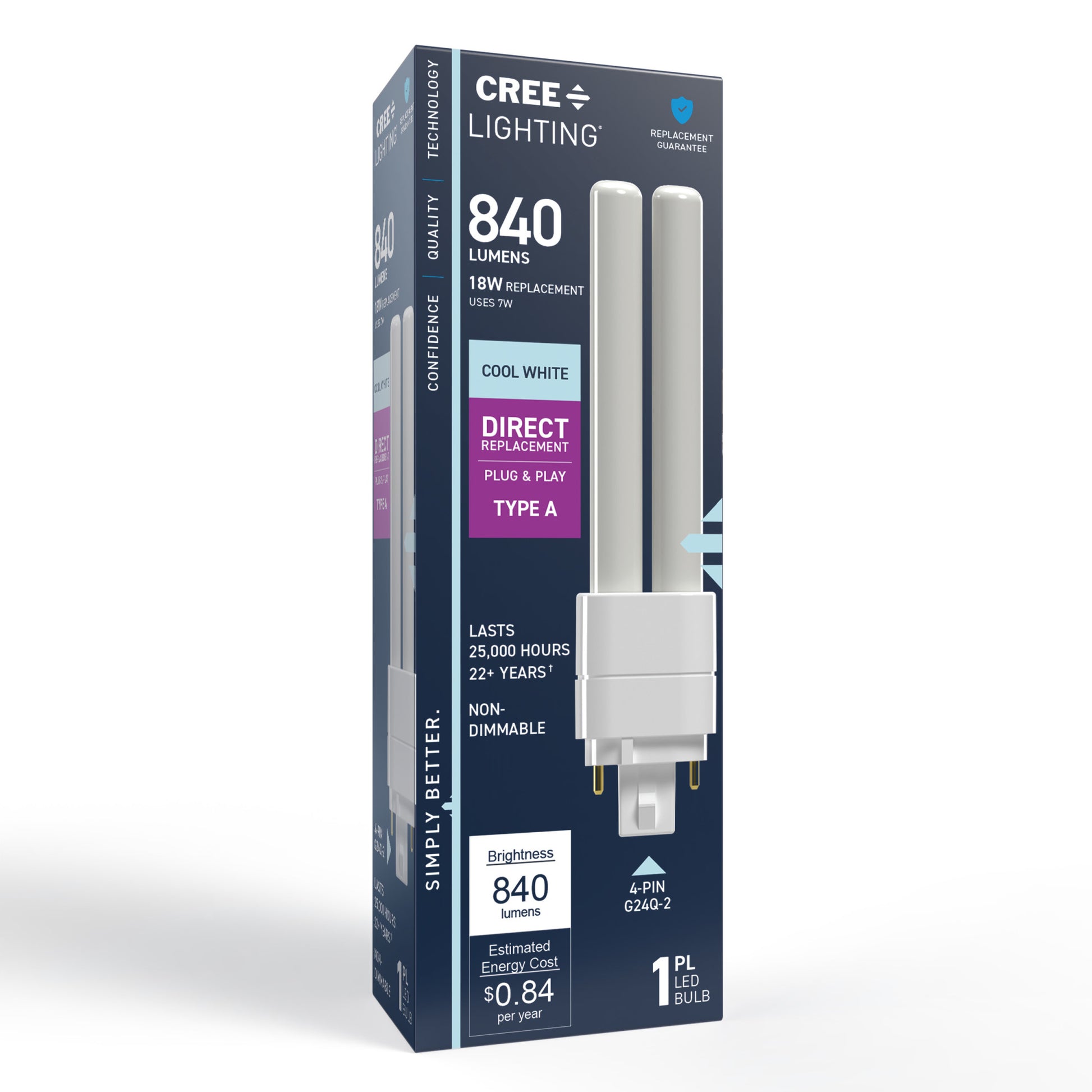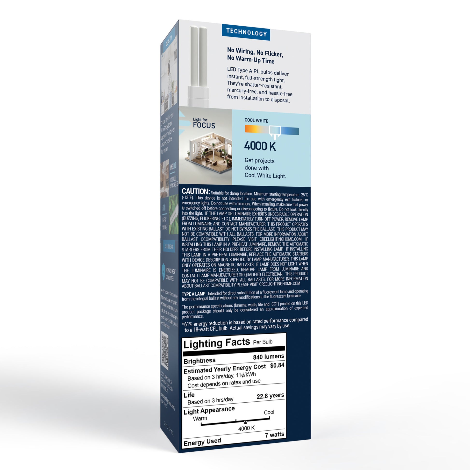 Refresh your recessed and ceiling fixtures with this 18W Replacement Double Twin Tube PLD LED Bulb. Designed to fit G24q-2 4-pin bases, it delivers 4100K Cool White light that’s ideal for clean, focused illumination in commercial and utility spaces. Using just 7 watts, it cuts energy use while producing 840 lumens of flicker-free brightness. Mercury-free and rated to last 25,000 hours, it’s the smart way to upgrade from outdated CFLs.