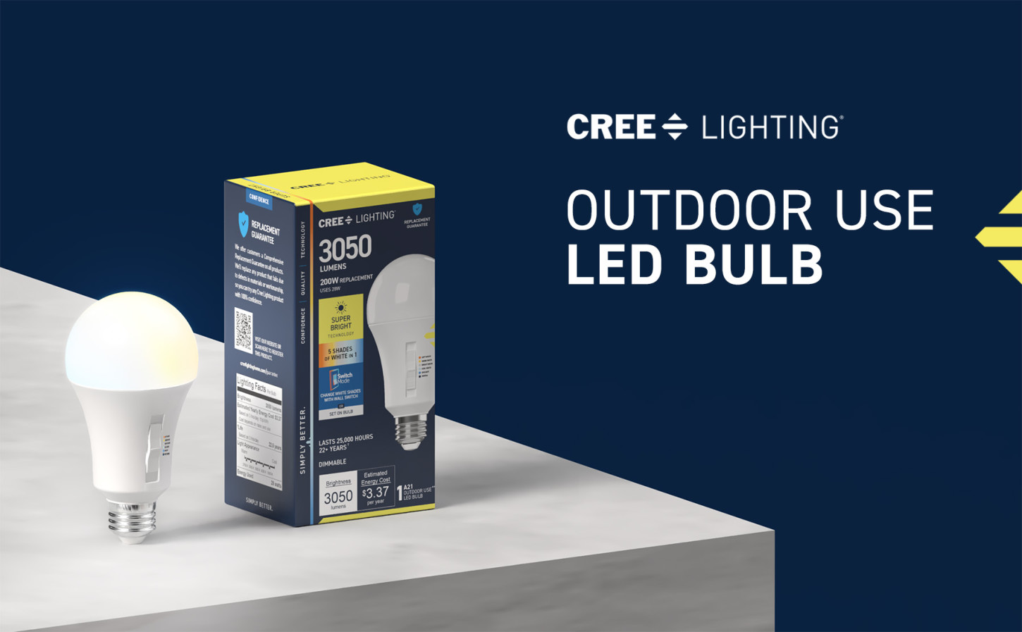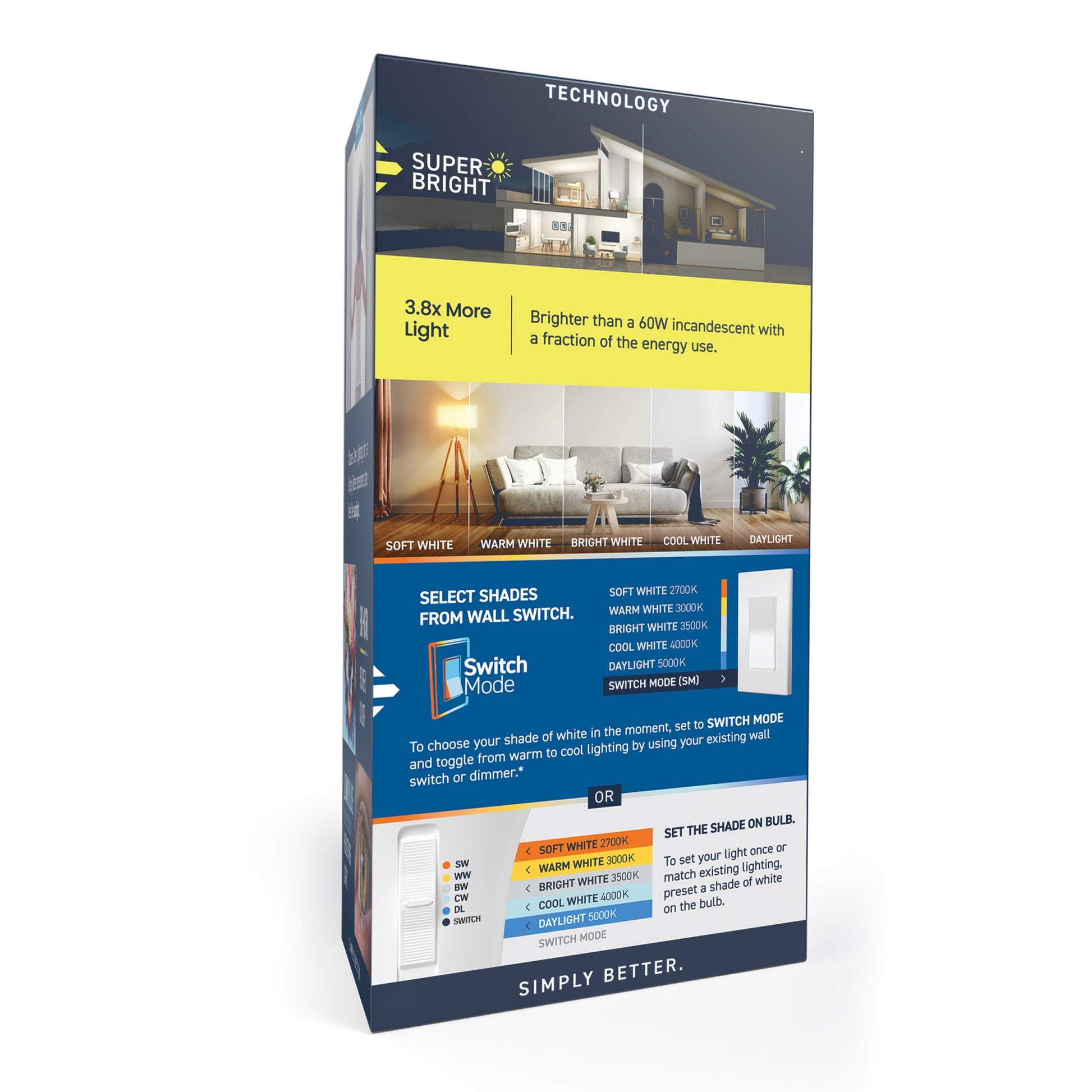 Upgrade your lighting game with our Super Bright 3050 Lumen Switchable White LED Bulb, perfect for high ceilings and large outdoor spaces that need an extra shine with fewer bulbs. Preset Soft White (2700K), Warm White (3000K), Bright White (3500K), Cool White (4000K), or Daylight (5000K) before installation, or choose Switch Mode to use your wall switch to go from energizing light in the daytime to relaxing light at night. Low Blue technology filters harsh blue light that can cause eye strain, headaches, and disrupt sleep. With a remarkable 90+ Color Rendering Index (CRI), colors appear more vivid and true-to-life, enhancing the beauty of your home's décor and making everything look its best. Built to last with an impressive 25,000-hour lifespan, this energy-efficient LED saves you money and time, reducing replacements and energy costs compared to a traditional 200W incandescent bulb. With a medium-sized E26 base, this dimmable bulb provides an easy upgrade in most fixtures. Whether it's your grand foyer, the garage, or the patio, enjoy flicker-free, eco-friendly lighting that's designed with sustainability in mind.
