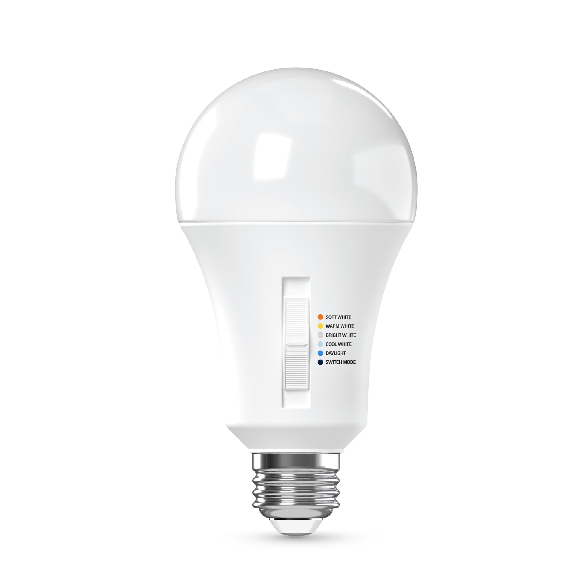 Upgrade your lighting game with our Super Bright 3050 Lumen Switchable White LED Bulb, perfect for high ceilings and large outdoor spaces that need an extra shine with fewer bulbs. Preset Soft White (2700K), Warm White (3000K), Bright White (3500K), Cool White (4000K), or Daylight (5000K) before installation, or choose Switch Mode to use your wall switch to go from energizing light in the daytime to relaxing light at night. Low Blue technology filters harsh blue light that can cause eye strain, headaches, and disrupt sleep. With a remarkable 90+ Color Rendering Index (CRI), colors appear more vivid and true-to-life, enhancing the beauty of your home’s décor and making everything look its best. Built to last with an impressive 25,000-hour lifespan, this energy-efficient LED saves you money and time, reducing replacements and energy costs compared to a traditional 200W incandescent bulb. With a medium-sized E26 base, this dimmable bulb provides an easy upgrade in most fixtures. Whether it’s your grand foyer, the garage, or the patio, enjoy flicker-free, eco-friendly lighting that’s designed with sustainability in mind.