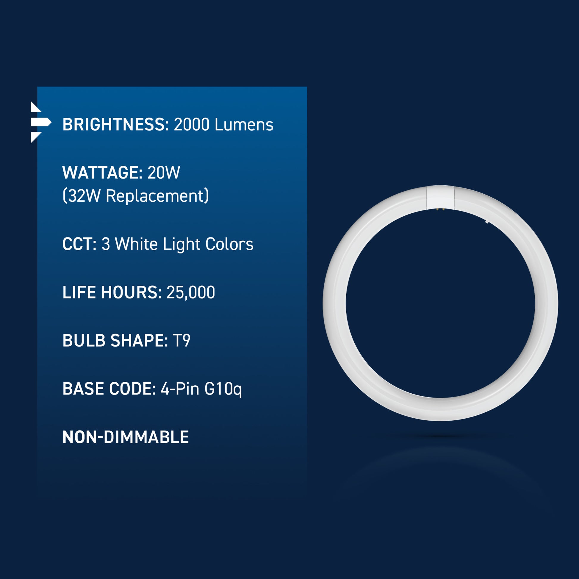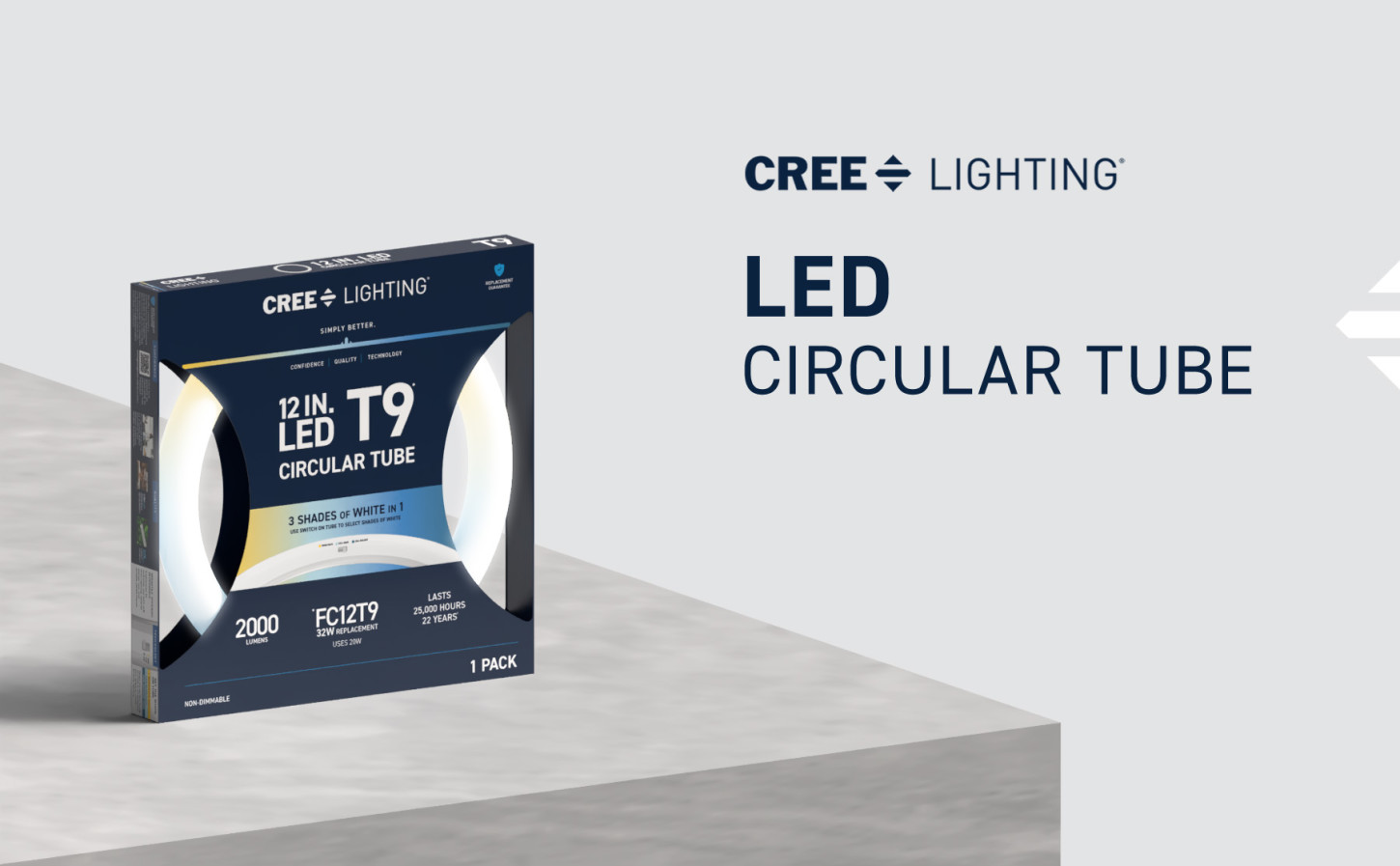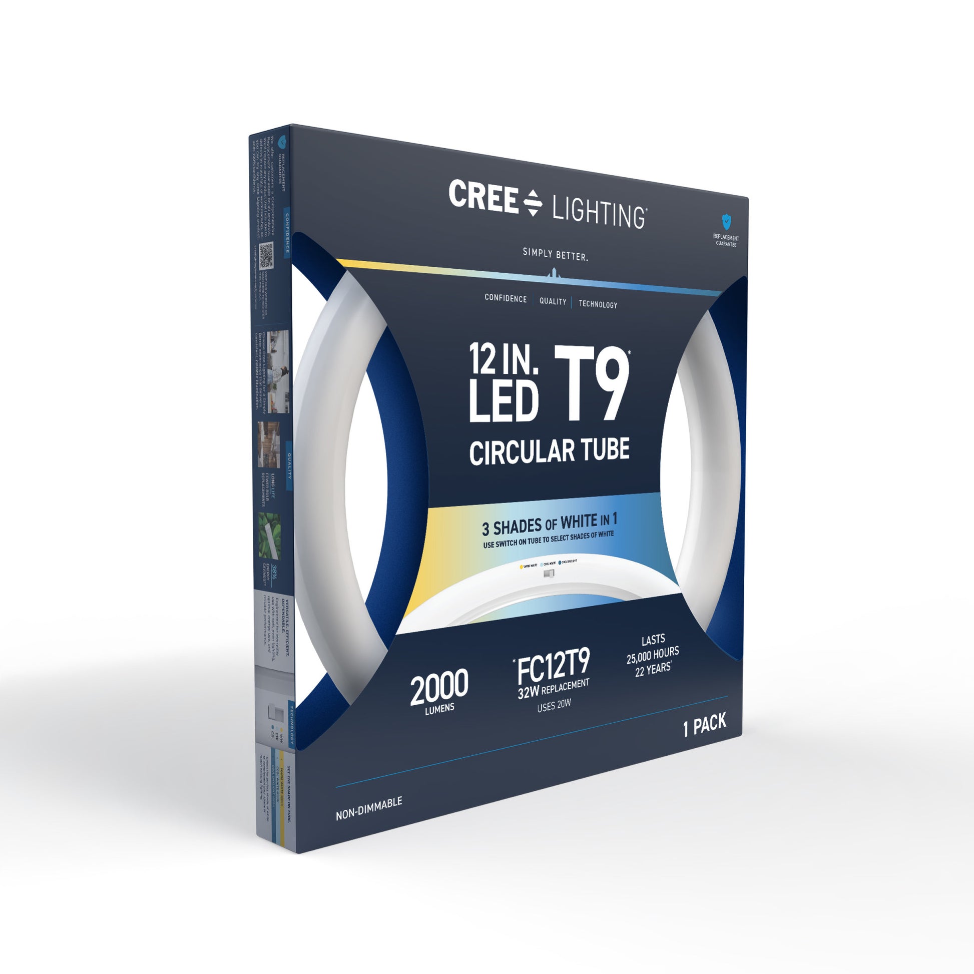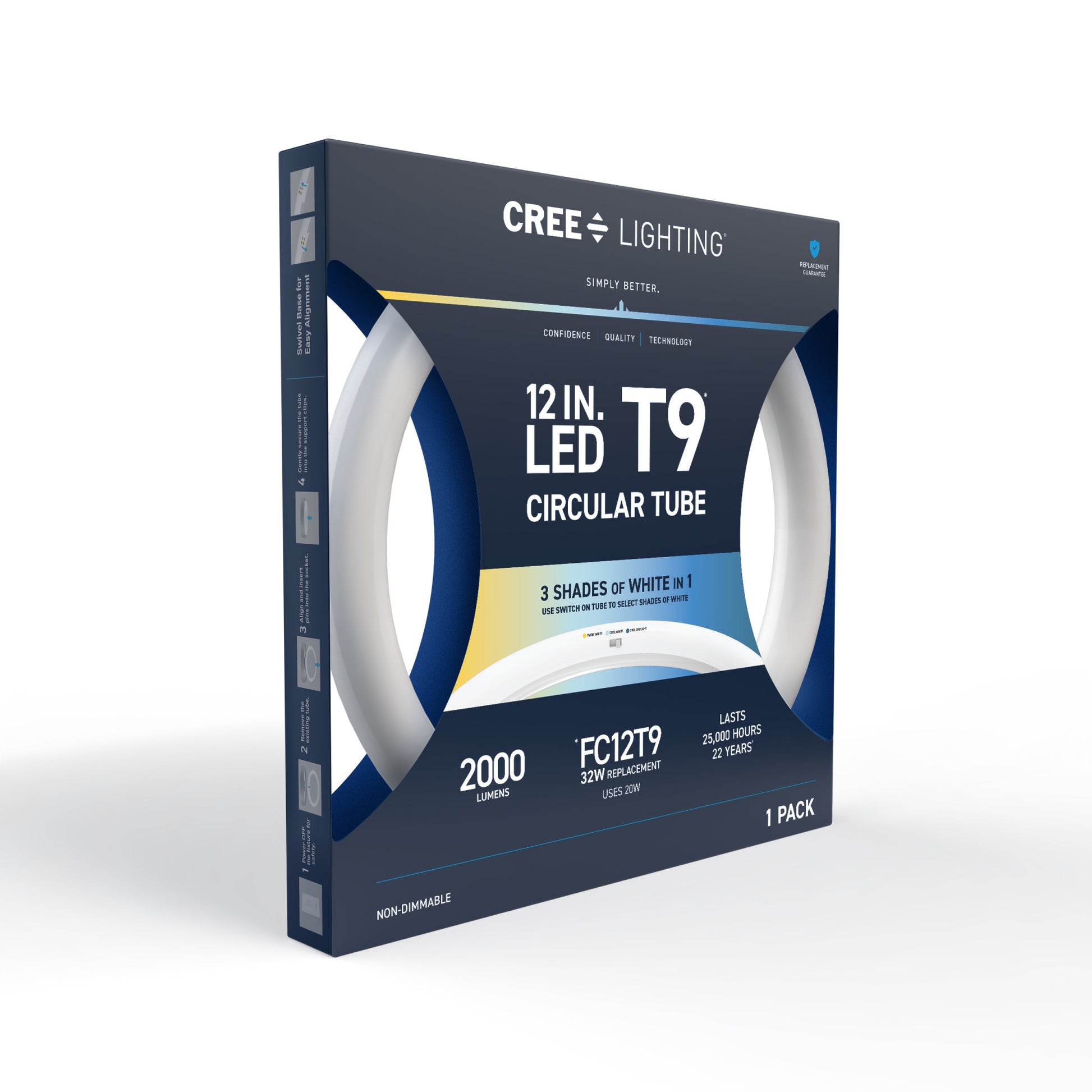 Upgrade your lighting game with Cree Lighting’s 12in Circular LED Light Tube, a perfect replacement for T9 fluorescent bulbs in almost any commercial or business environment. This tube is a Type A Direct Replacement that works with most existing electronic ballasts for quick and easy plug-and-play installation, no rewiring required. Set your color temperature on the bulb before installation to get the right light for your space – 3000K Warm White, 4000K Cool White, or 6500K Cool Daylight. LED light turns on instantly without the warmup time required by fluorescents. This 2000 Lumen non-dimmable tube uses just 20W of electricity, with cool running performance for its entire 25,000-hour lifespan. Whether it’s in the garage, storage unit, warehouse, or office, enjoy flicker-free, mercury-free lighting built to last.