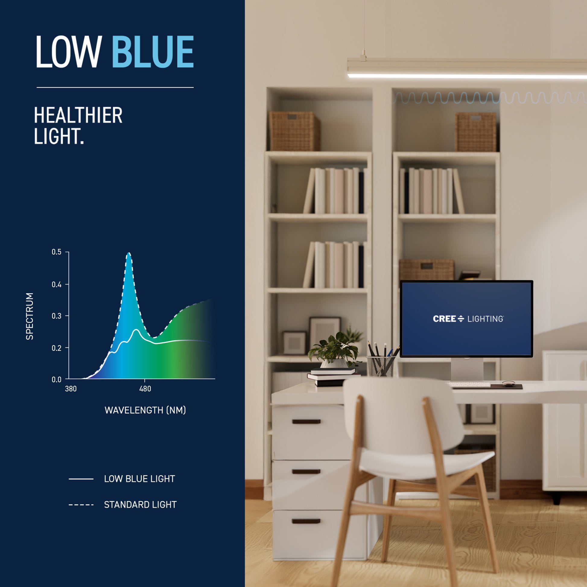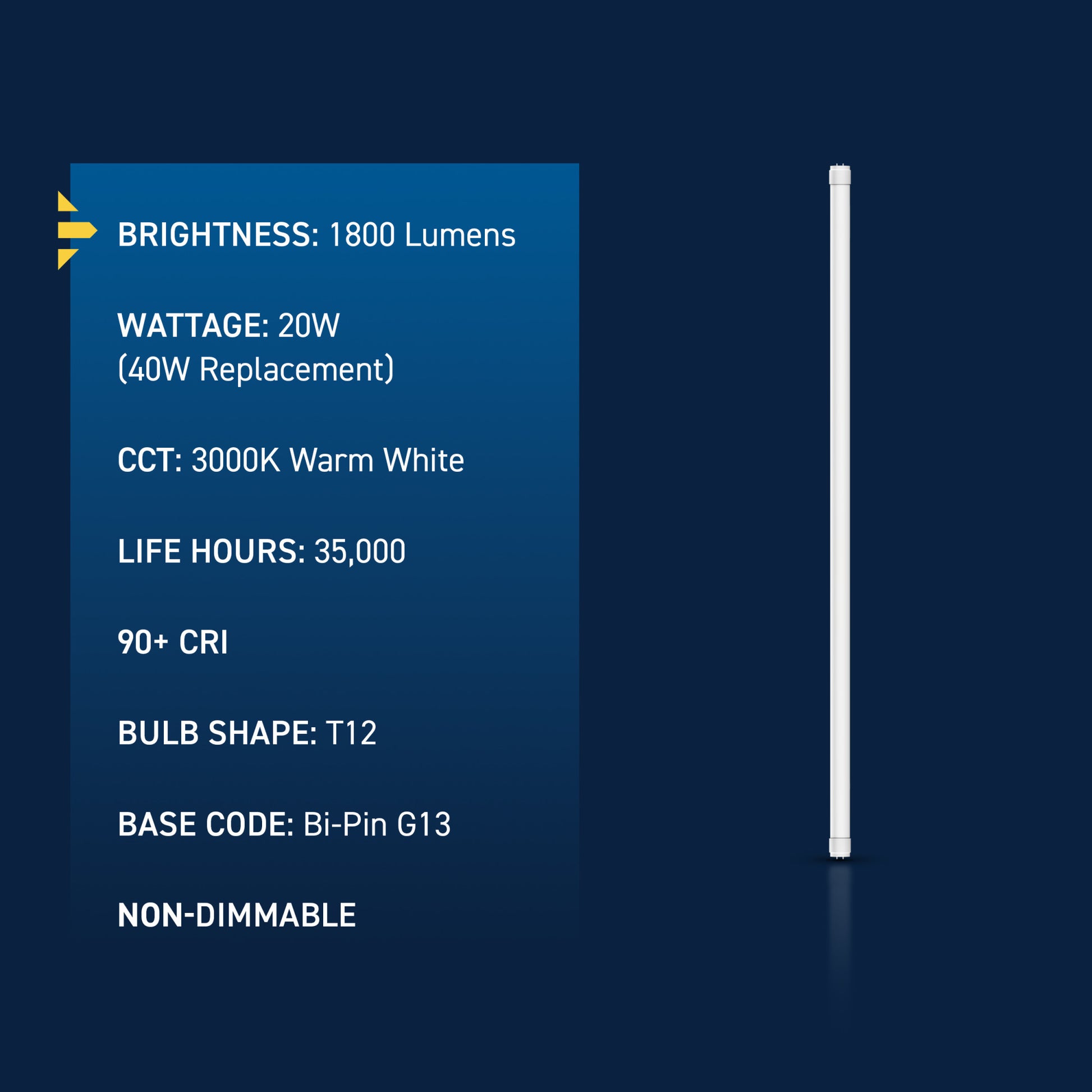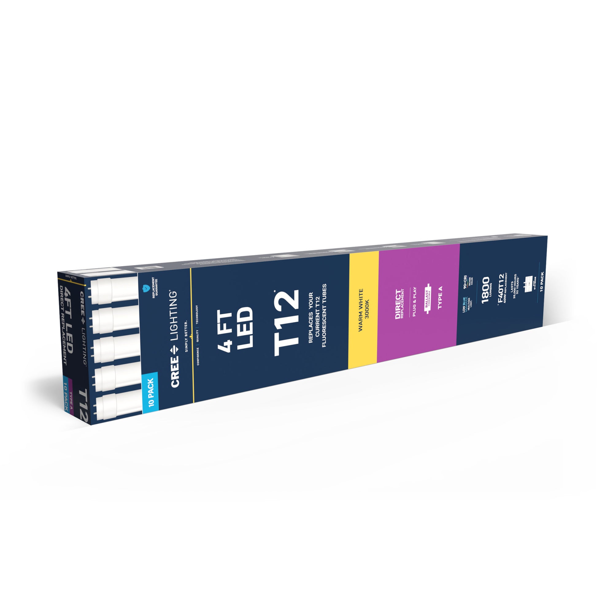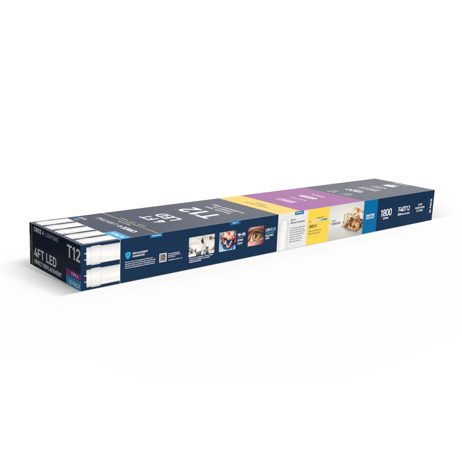 Upgrade your lighting game with Cree Lighting's 4ft LED Light Tube, a perfect replacement for T12 fluorescent bulbs in office and commercial environments. This tube is a Type A Direct Replacement that works with most existing electronic ballasts for quick and easy plug-and-play installation, no rewiring required. Relax and recharge in the welcoming glow of Warm White Light. The remarkable 90+ Color Rendering Index (CRI) makes colors appear more vivid and true-to-life, enhancing the beauty of your space and making everything look its best. LED light turns on instantly without the warmup time required by fluorescents. This 1800 Lumen non-dimmable tube uses 20W of electricity, with cool running performance for its entire 35,000-hour lifespan. Low Blue technology filters harsh blue light that can cause eye strain, headaches, and disrupt sleep. Whether it's in an office, retail, or commercial space, enjoy flicker-free, mercury-free lighting built to last.