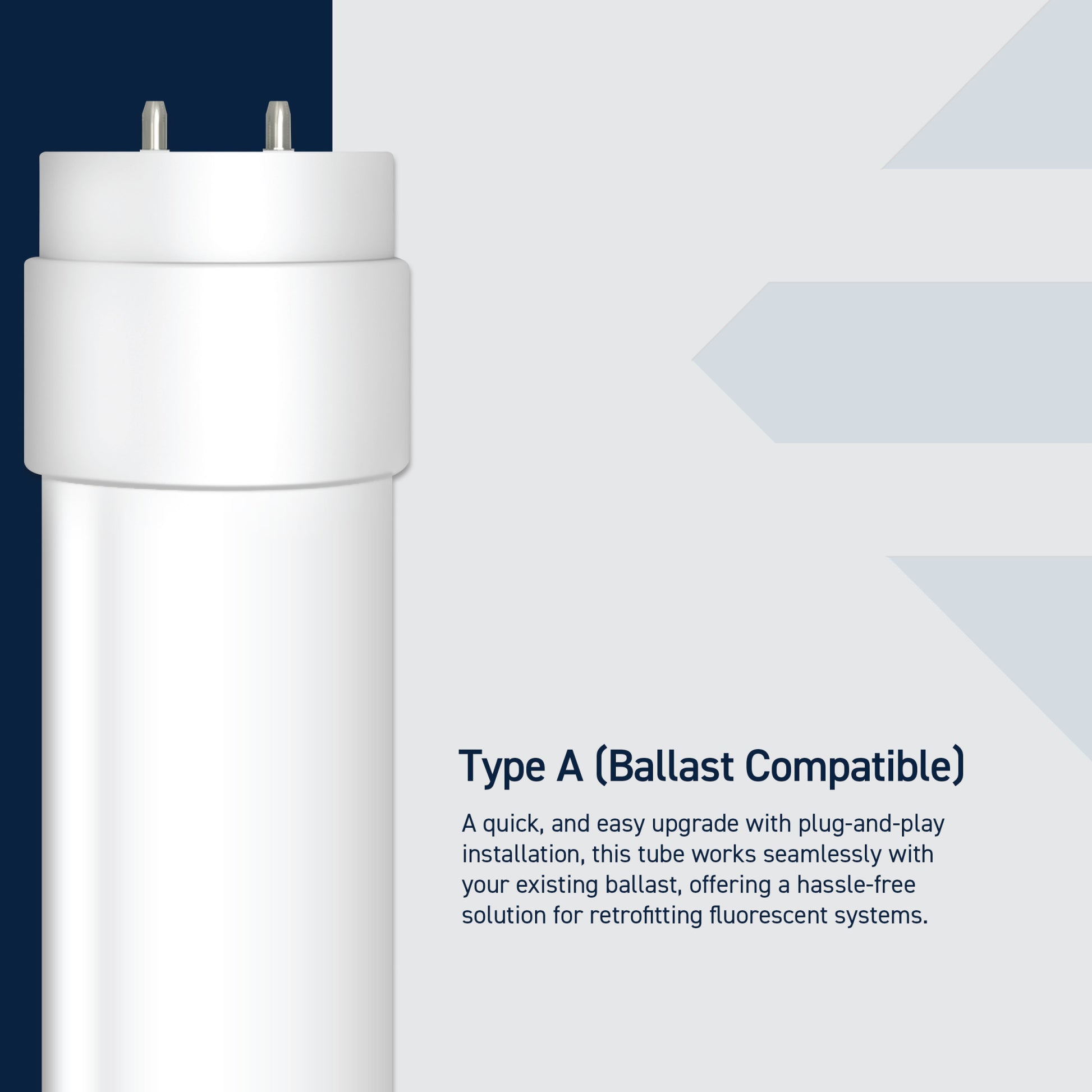 - Type A Direct Replacement uses existing ballasts for easy installation, no hardwiring required