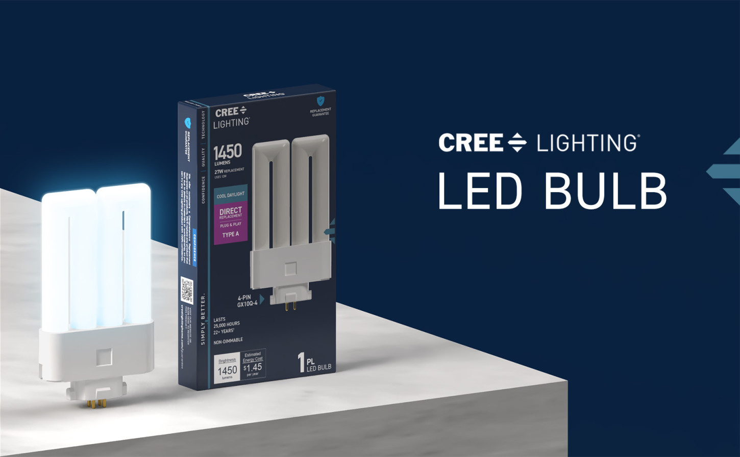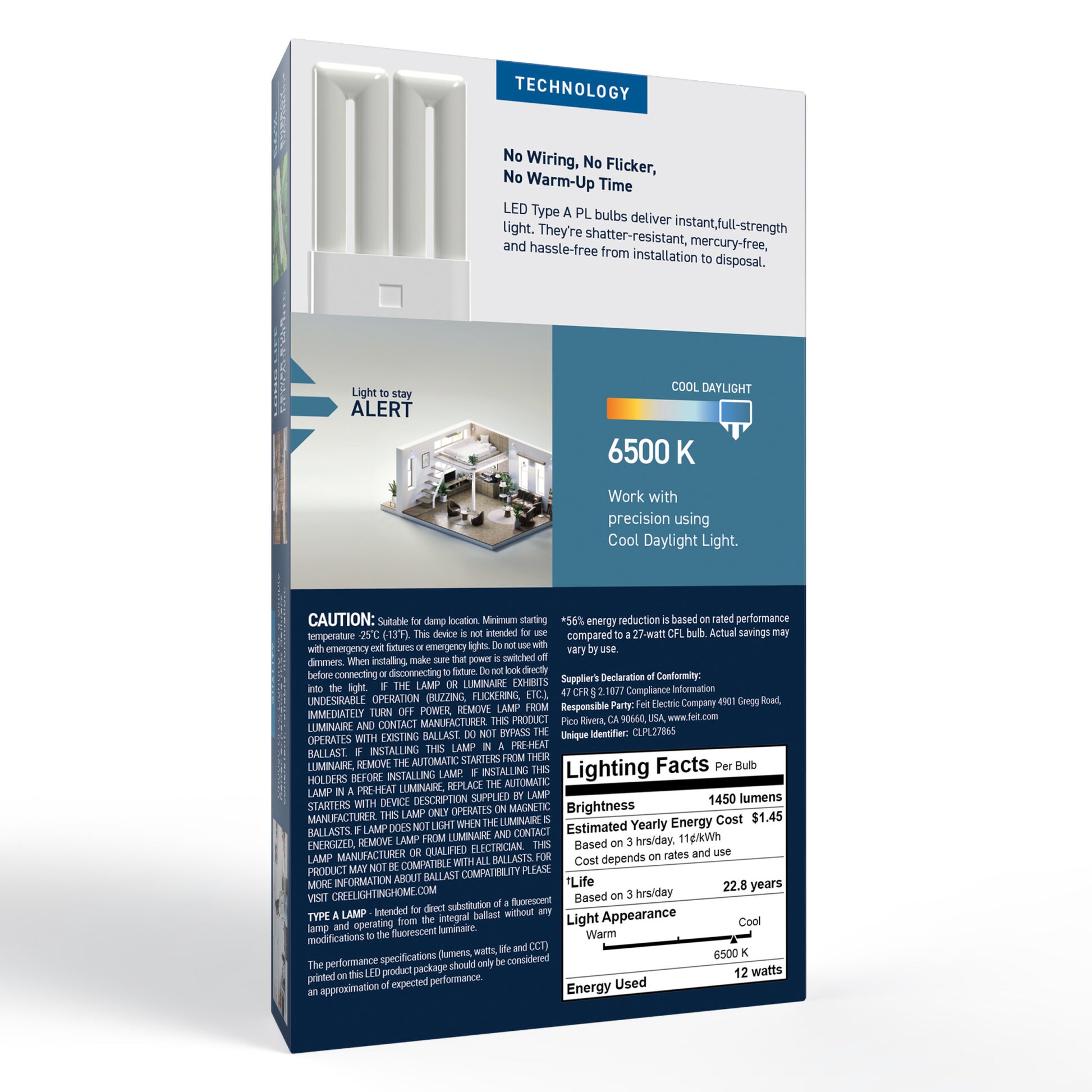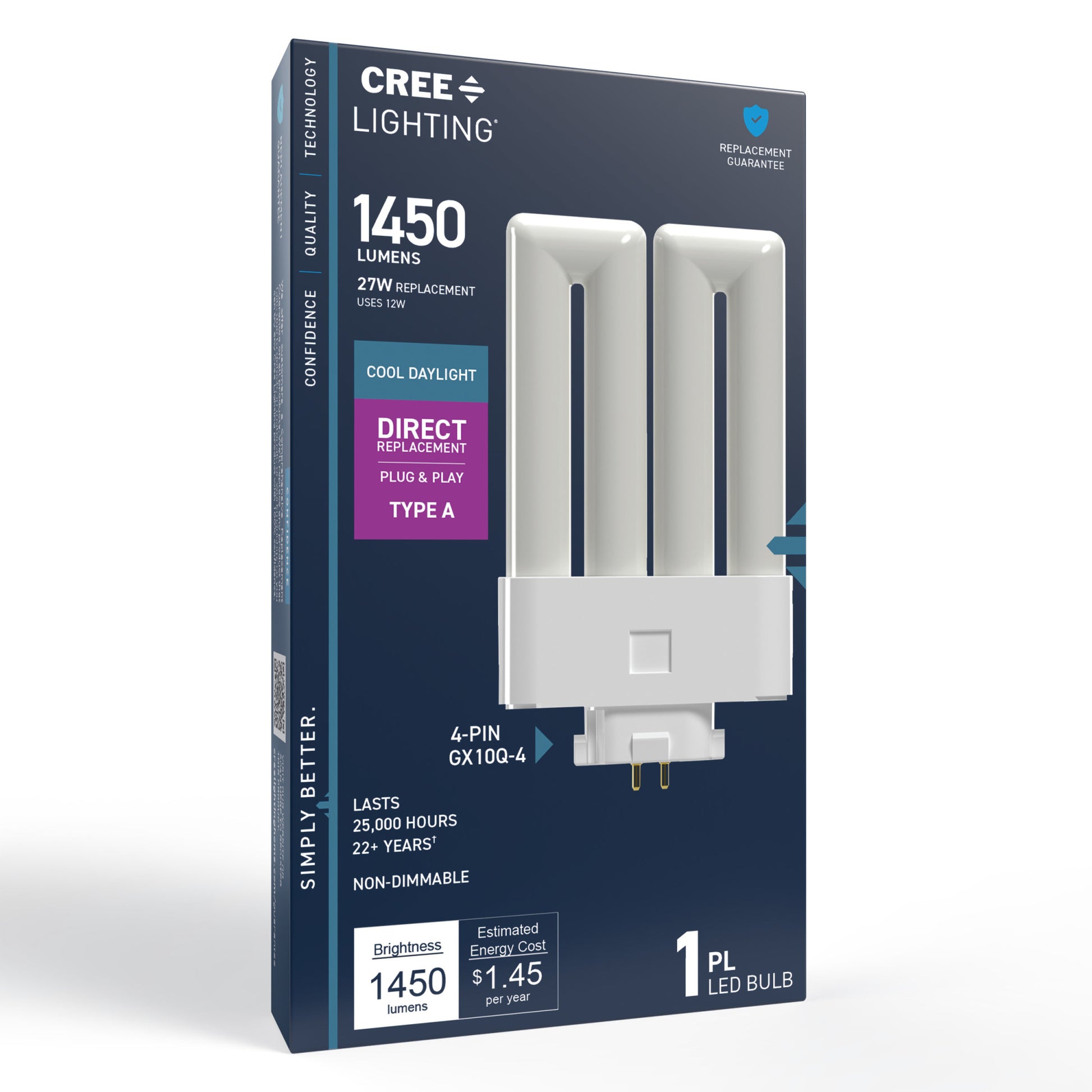 When you need brightness that means business, count on this 27W Replacement PL LED Bulb. Its high-output Cool Daylight (6500K) light is designed to replace traditional CFLs in utility, garage, and workshop fixtures. 4-pin base ensures a secure and continuous connection, delivering bright, flicker-free light with only 12W of energy. With a 25,000-hour lifespan and mercury-free construction, it’s a long-lasting upgrade built for comfort and performance.