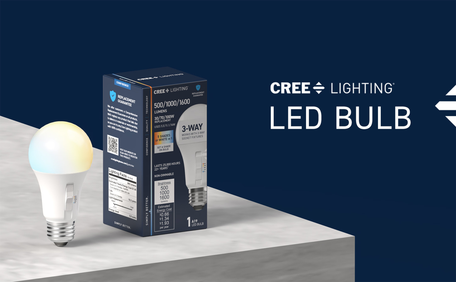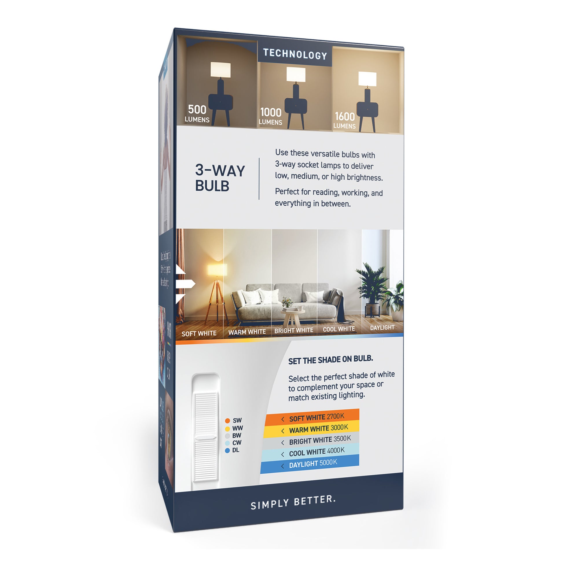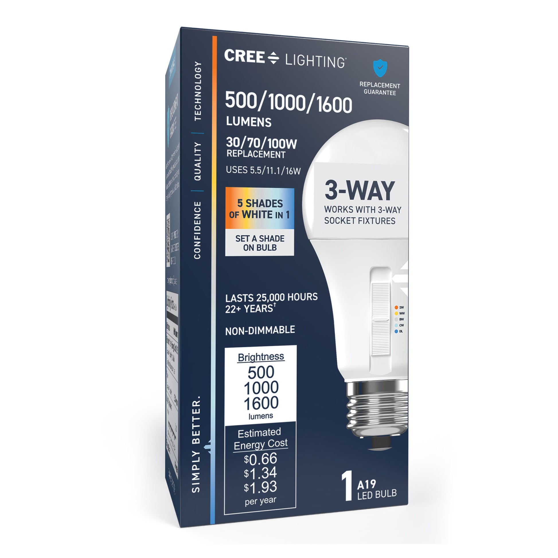 Ultimate versatility is at your fingertips with this Cree 3-way switch 5-in-1 Switchable White Light LED Bulb. This bulb works in 3-Way lamps to switch toggle between 500, 1000, and 1600 Lumens, so the brightness is just right at any time of day or night. Low Blue technology filters harsh blue light that can cause eye strain, headaches, and disrupt sleep. Choose between Soft White (2700K), Warm White (3000K), Bright White (3500K), Cool White (4000K), or Daylight (5000K) for any mood in any space. The medium-sized E26 base makes for a convenient upgrade, and the brilliant 90+ Color Rendering Index (CRI) makes the colors in your home appear more vivid and true-to-life, enhancing the beauty of your décor. Built to last with an impressive 25,000-hour lifespan, this energy-efficient LED saves you money and time, reducing replacements and energy costs by up to 84% compared to traditional 30/70/100W incandescent bulbs. Whether it's in your reading lamp or providing adjustable mood lighting in the living room, enjoy flicker-free, eco-friendly lighting that's mercury-free and designed for sustainability.