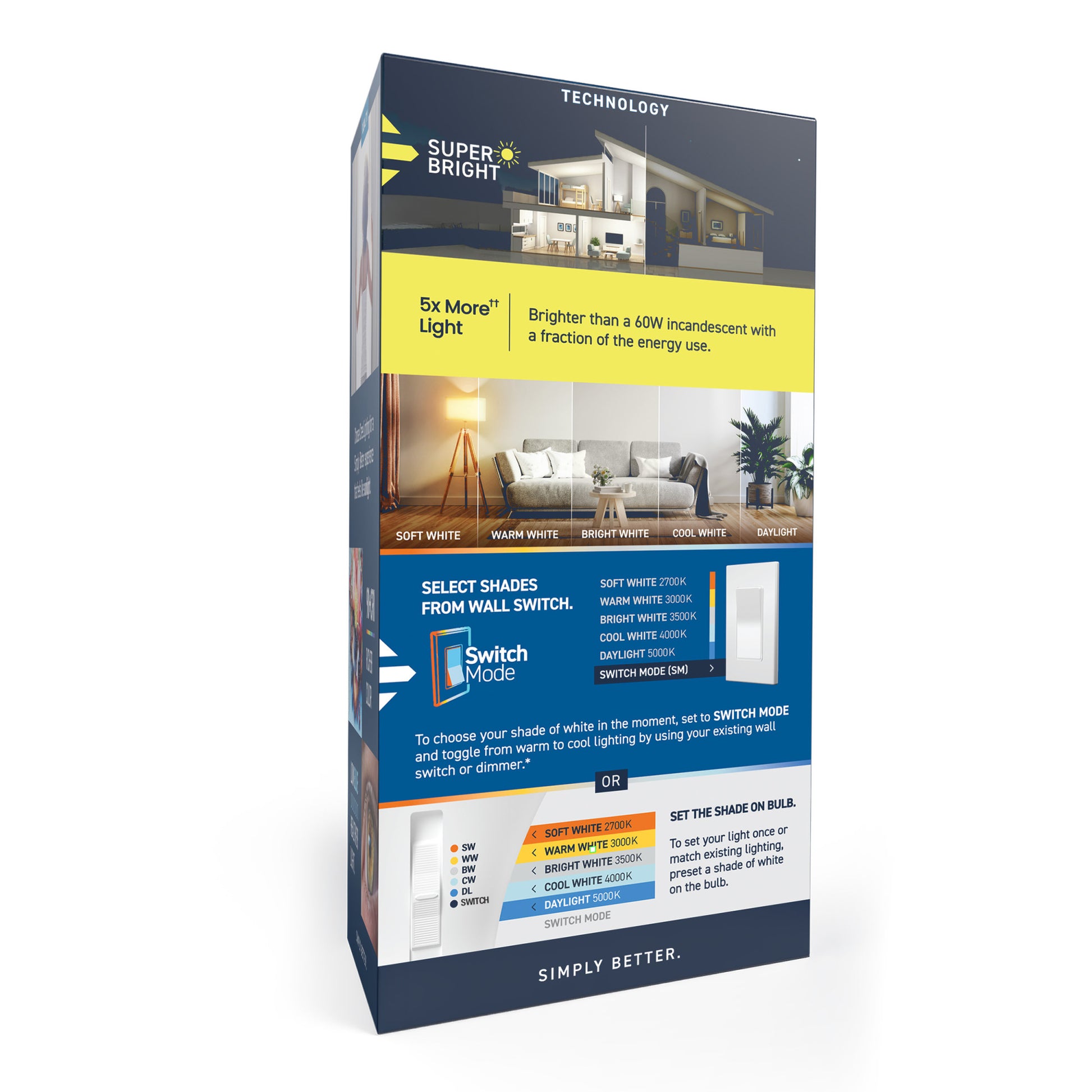 Upgrade your lighting game with our Super Bright 4060 Lumen Switchable White LED Bulb, perfect for high ceilings and large outdoor spaces that need an extra shine with fewer bulbs. Preset Soft White (2700K), Warm White (3000K), Bright White (3500K), Cool White (4000K), and Daylight (5000K) before installation or select Switch Mode to toggle between shades anytime with your existing wall switch. Low Blue technology filters harsh blue light that can cause eye strain, headaches, and disrupt sleep. With a remarkable 90+ Color Rendering Index (CRI), colors appear more vivid and true-to-life, enhancing the beauty of your home's décor and making everything look its best. Built to last with an impressive 25,000-hour lifespan, this energy-efficient LED saves you money and time, reducing replacements and energy costs compared to a traditional 300W incandescent bulb. With a medium-sized E26 base, this dimmable bulb provides an easy upgrade in most fixtures. Whether it's your grand foyer, the garage, or the outdoor patio, enjoy flicker-free, eco-friendly lighting that's designed for sustainability.