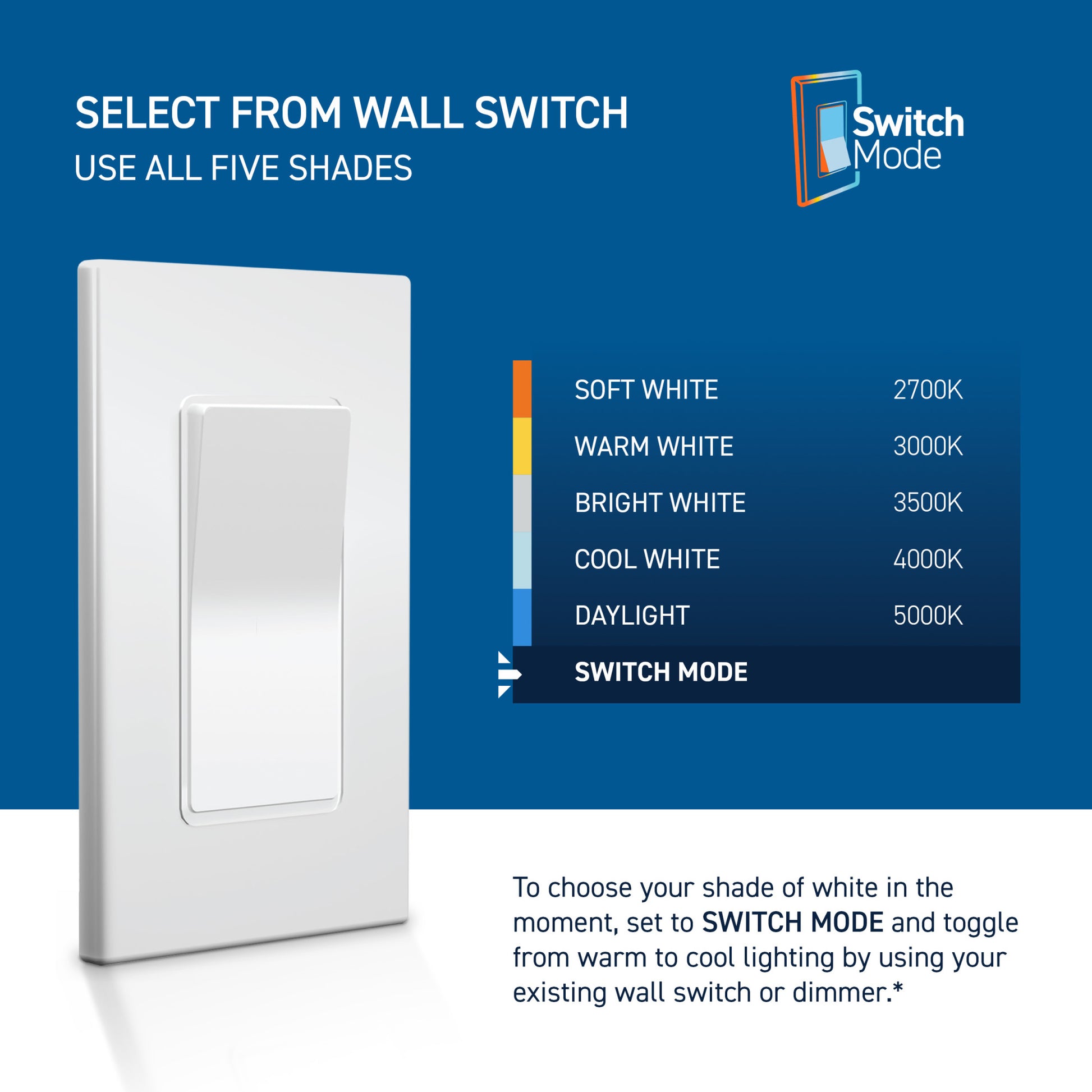 - Choose Soft White (2700K), Warm White (3000K), Bright White (3500K), Cool White (4000K), or Daylight (5000K)