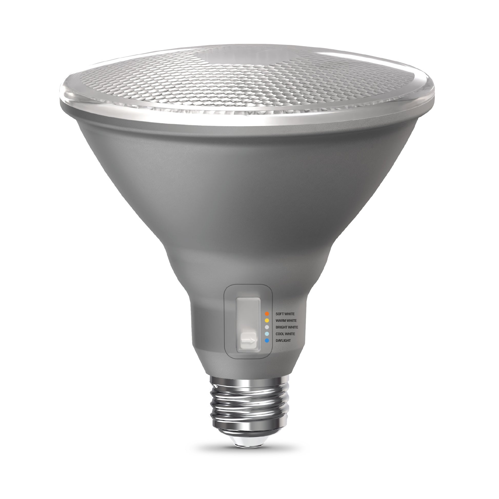 Upgrade your lighting game with our Super Bright 3000 Lumen PAR38 Switchable White LED Bulb, perfect for high ceilings and large outdoor spaces that need an extra shine with fewer bulbs. Preset Soft White (2700K), Warm White (3000K), Bright White (3500K), Cool White (4000K), and Daylight (5000K) before installation or select Switch Mode to toggle between shades anytime with your existing wall switch. Low Blue technology filters harsh blue light that can cause eye strain, headaches, and disrupt sleep. With a remarkable 90+ Color Rendering Index (CRI), colors appear more vivid and true-to-life, enhancing the beauty of your home’s décor and making everything look its best. Built to last with an impressive 25,000-hour lifespan, this energy-efficient LED saves you money and time, reducing replacements and energy costs compared to a traditional 325W incandescent bulb. With a medium-sized E26 base, this dimmable bulb provides an easy upgrade in most fixtures. Whether it’s your grand foyer, the garage, or the outdoor patio, enjoy flicker-free, eco-friendly lighting that’s designed for sustainability.