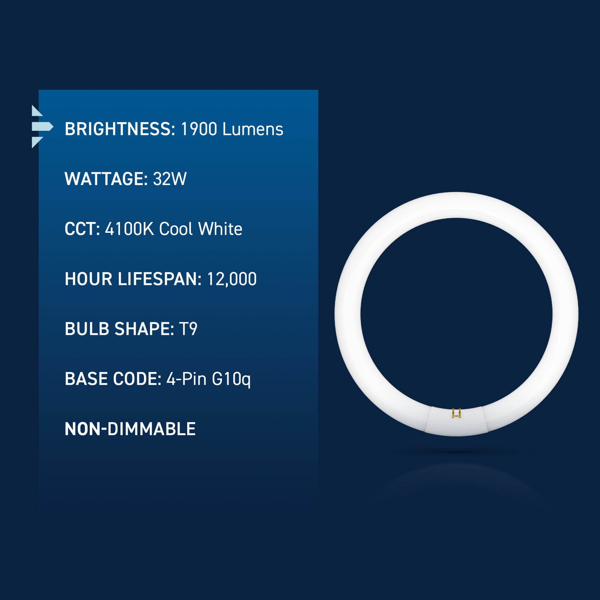 Upgrade your lighting game with Cree Lighting’s 12in Fluorescent Circular Light Tube, a perfect replacement for T9 fluorescent bulbs in almost any commercial or business environment. 4100K Cool White CCT casts crisp, refreshing illumination to keep you sharp and productive. This 1900 Lumen non-dimmable tube uses 32W of electricity, with relatively cool running performance for its entire 12,000-hour lifespan. Its 4-pin base makes for easy installation and upgrades. Whether it’s in the garage, storage unit, warehouse, or office, enjoy flicker-free lighting built to last.