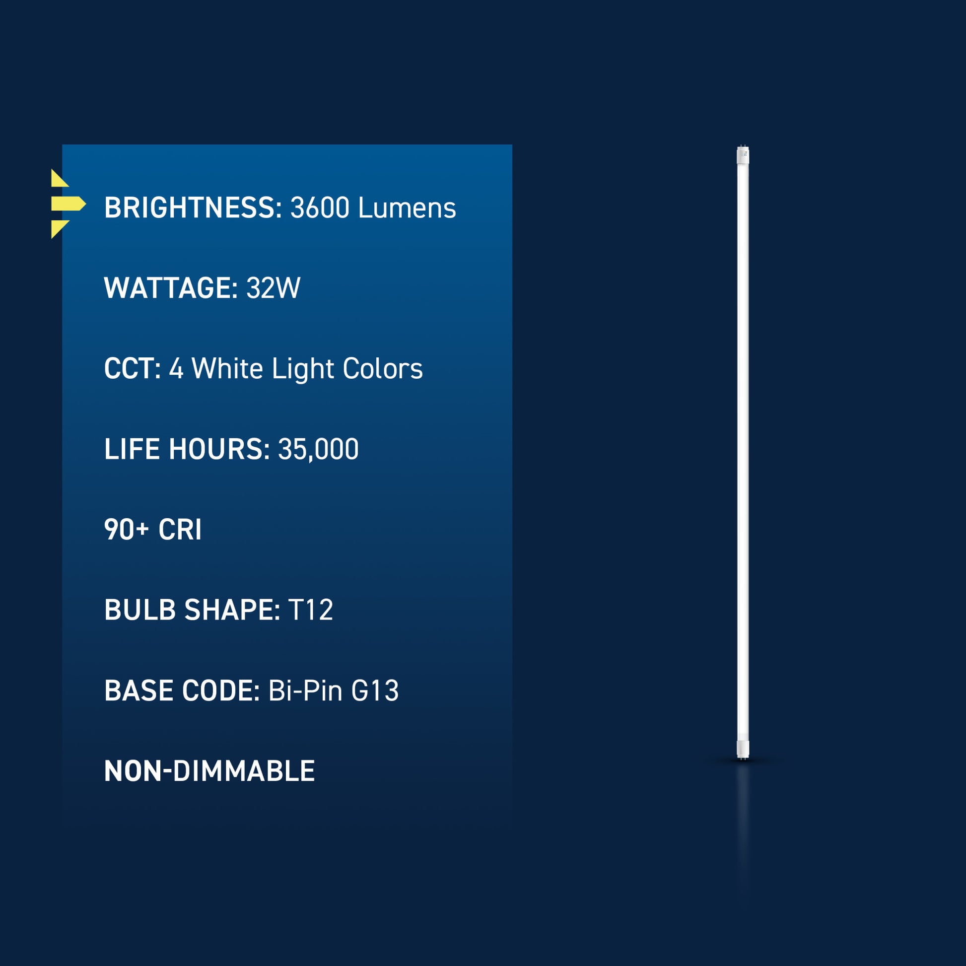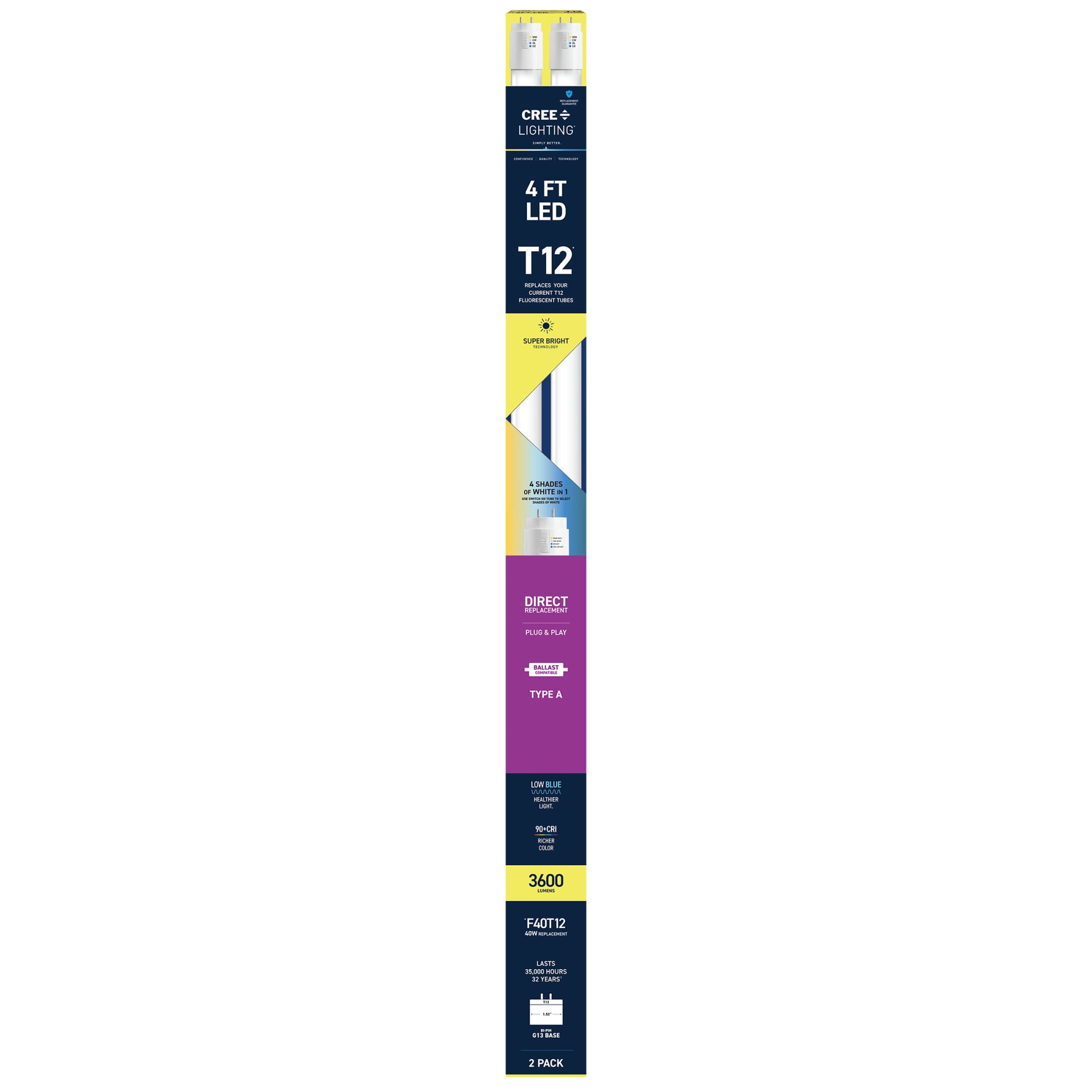 Upgrade your lighting game with Cree Lighting’s 4ft LED Light Tube, a perfect replacement for T12 fluorescent bulbs in public and commercial environments. This tube is a Type A Direct Replacement that works with most existing electronic ballasts for quick and easy plug-and-play installation, no rewiring required. Set your color temperature on the bulb before installation to get the right light for your space – 3000K Warm White, 4000K Cool White, 5000K Daylight, or 6500K Cool Daylight. The remarkable 90+ Color Rendering Index (CRI) makes colors appear more vivid and true-to-life, enhancing the beauty of your space and making everything look its best. LED light turns on instantly without the warmup time required by fluorescents. This 3600 Lumen non-dimmable tube uses 32W of electricity, with cool running performance for its entire 35,000-hour lifespan. Whether it’s in a garage, warehouse, or commercial space, enjoy flicker-free, mercury-free lighting built to last.