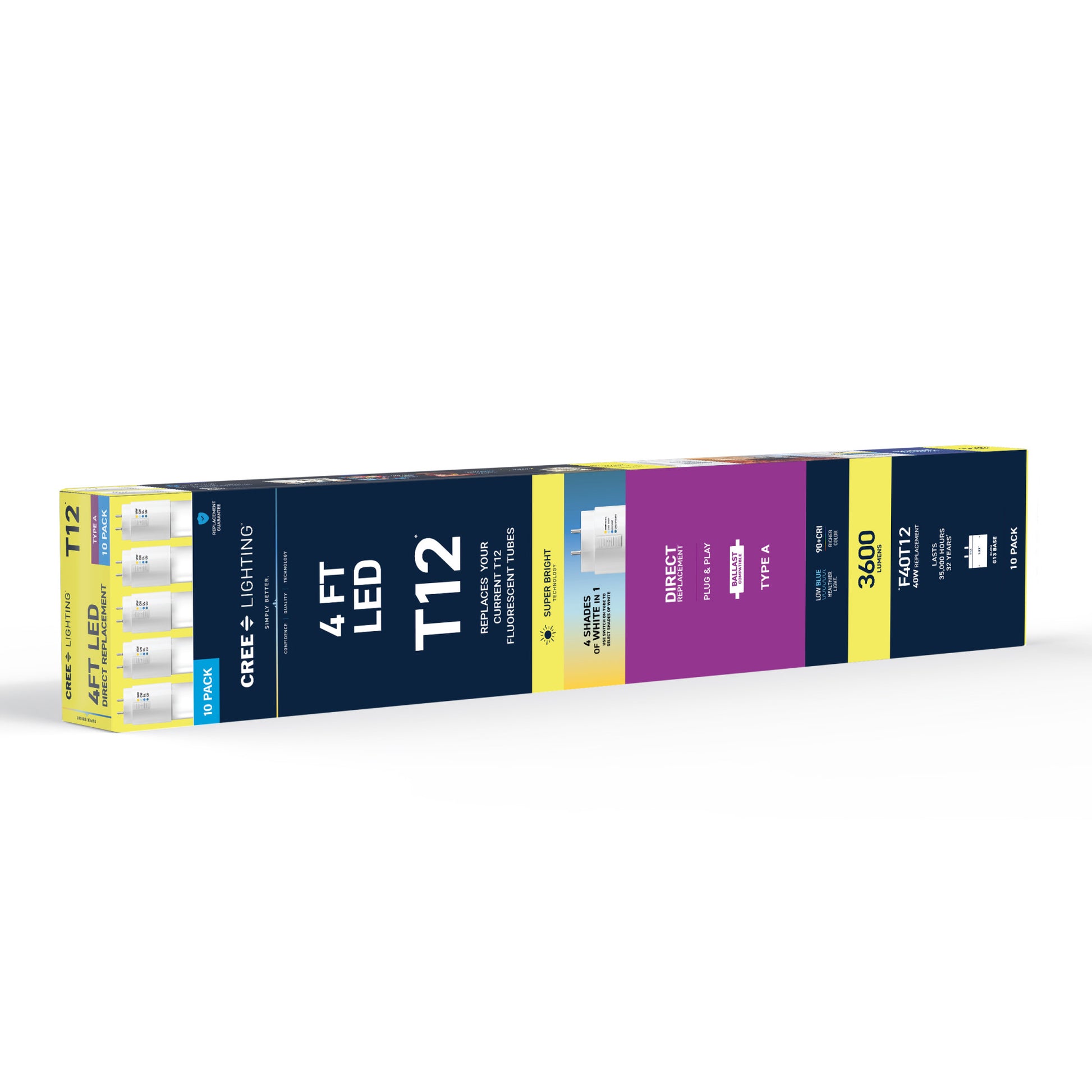 Upgrade your lighting game with Cree Lighting’s 4ft LED Light Tube, a perfect replacement for T12 fluorescent bulbs in public and commercial environments. This tube is a Type A Direct Replacement that works with most existing electronic ballasts for quick and easy plug-and-play installation, no rewiring required. Set your color temperature on the bulb before installation to get the right light for your space – 3000K Warm White, 4000K Cool White, 5000K Daylight, or 6500K Cool Daylight. The remarkable 90+ Color Rendering Index (CRI) makes colors appear more vivid and true-to-life, enhancing the beauty of your space and making everything look its best. LED light turns on instantly without the warmup time required by fluorescents. This 3600 Lumen non-dimmable tube uses 32W of electricity, with cool running performance for its entire 35,000-hour lifespan. Whether it’s in a garage, warehouse, or commercial space, enjoy flicker-free, mercury-free lighting built to last.