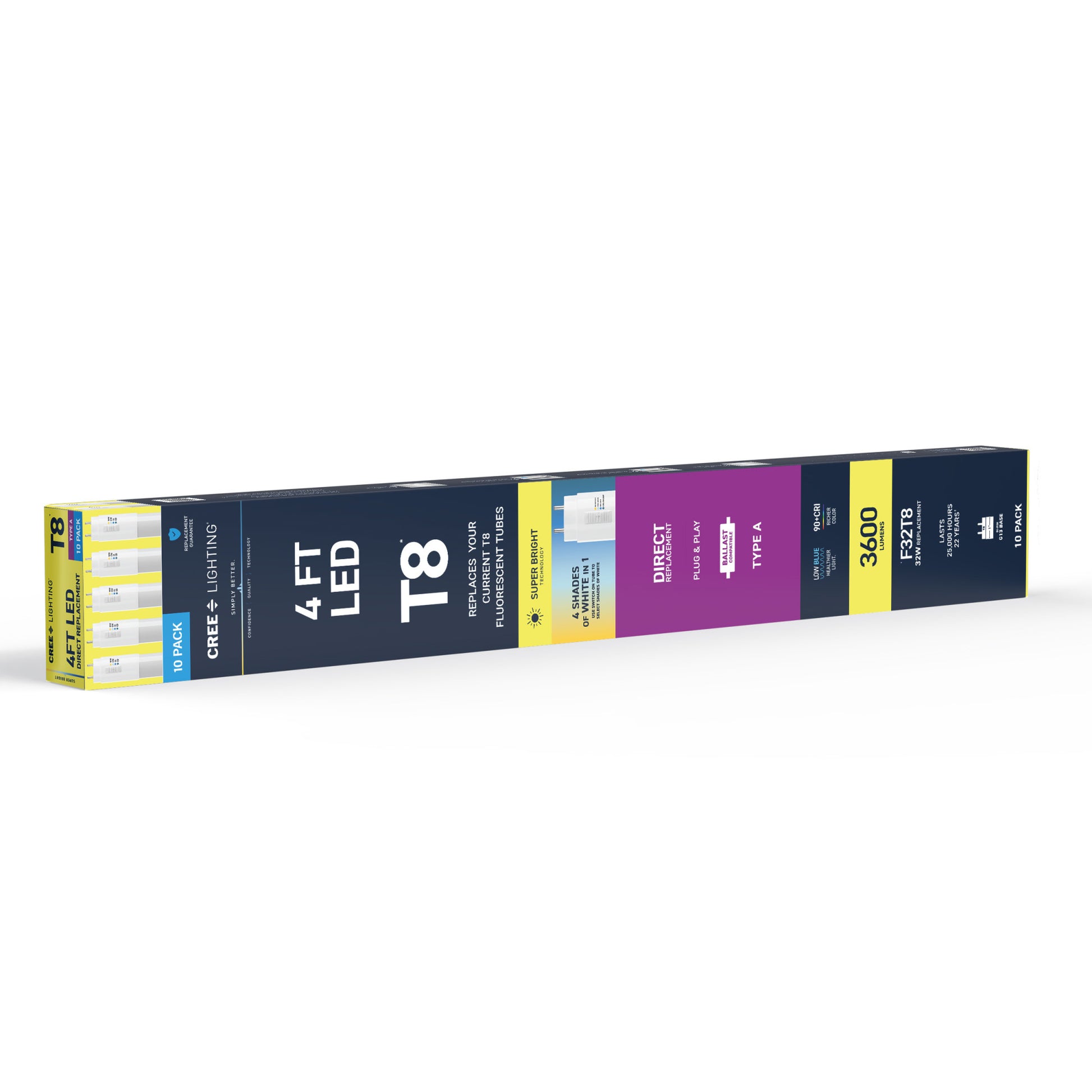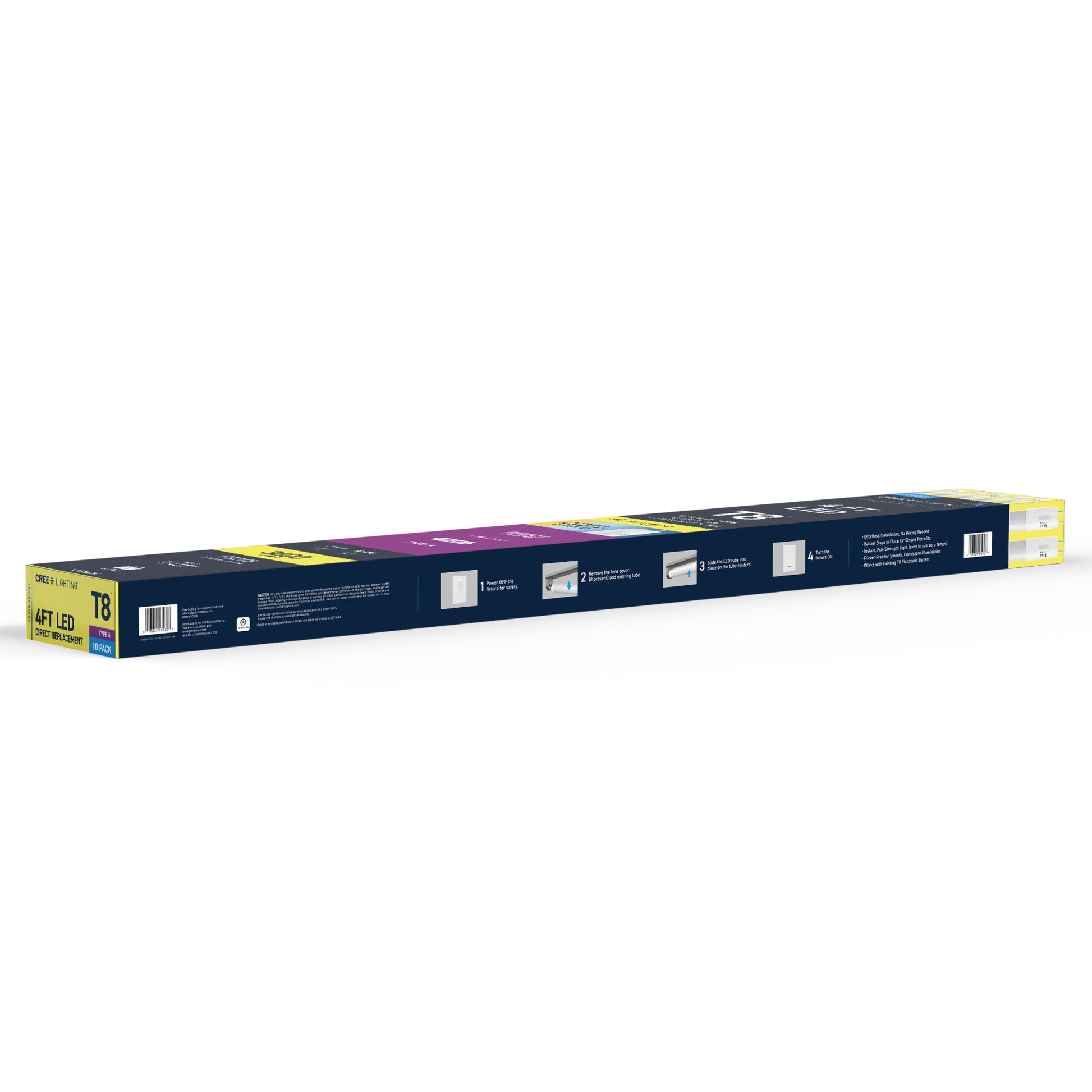 Upgrade your lighting game with Cree Lighting’s 4ft LED Light Tube, a perfect replacement for T8 fluorescent bulbs in public and commercial environments. This tube is a Type A Direct Replacement that works with most existing electronic ballasts for quick and easy plug-and-play installation, no rewiring required. Set your color temperature on the bulb before installation to get the right light for your space – 3000K Warm White, 4000K Cool White, 5000K Daylight, or 6500K Cool Daylight. The remarkable 90+ Color Rendering Index (CRI) makes colors appear more vivid and true-to-life, enhancing the beauty of your space and making everything look its best. LED light turns on instantly without the warmup time required by fluorescents. This 3600 Lumen non-dimmable tube uses 32W of electricity, with cool running performance for its entire 25,000-hour lifespan. Whether it’s in a garage, warehouse, or commercial space, enjoy flicker-free, mercury-free lighting built to last.