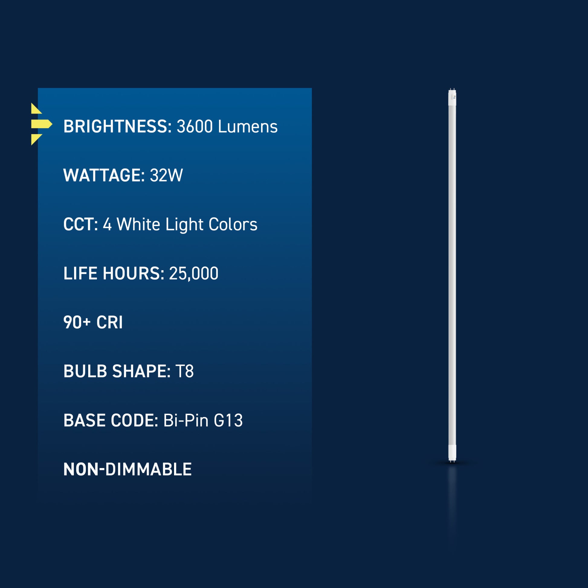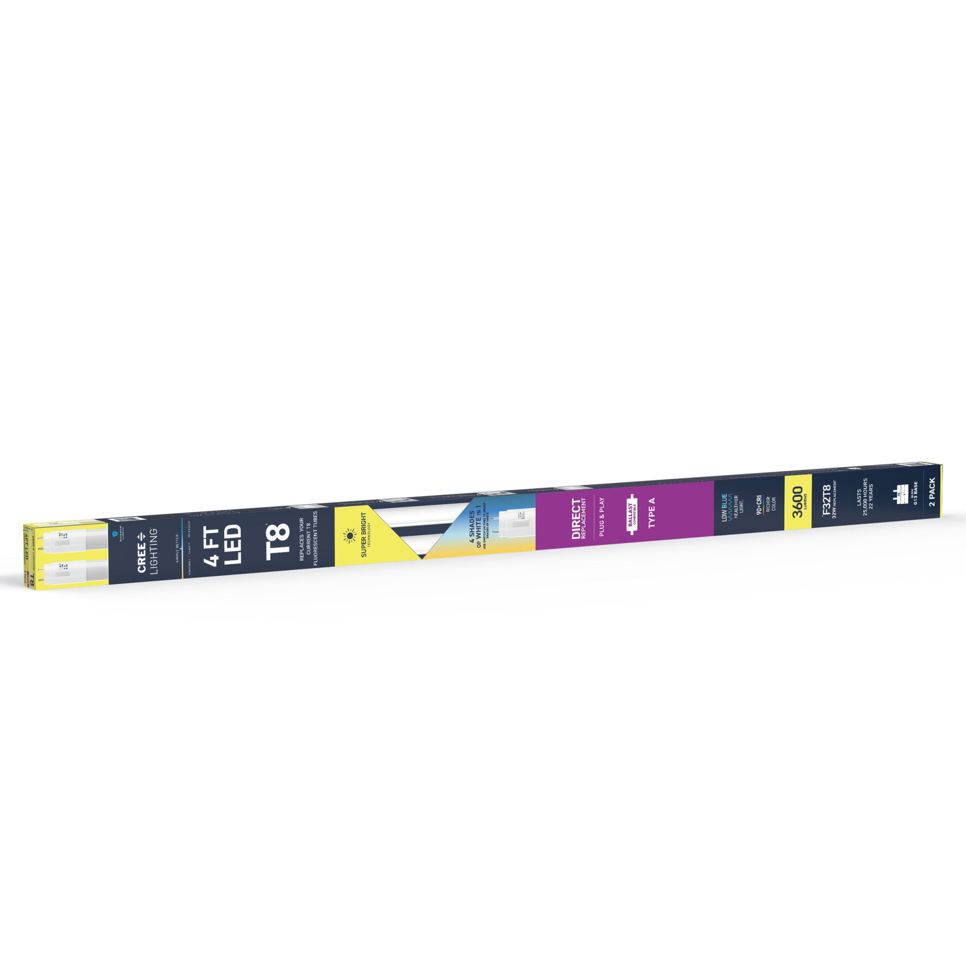 Upgrade your lighting game with Cree Lighting's 4ft LED Light Tube, a perfect replacement for T8 fluorescent bulbs in public and commercial environments. This tube is a Type A Direct Replacement that works with most existing electronic ballasts for quick and easy plug-and-play installation, no rewiring required. Set your color temperature on the bulb before installation to get the right light for your space – 3000K Warm White, 4000K Cool White, 5000K Daylight, or 6500K Cool Daylight. The remarkable 90+ Color Rendering Index (CRI) makes colors appear more vivid and true-to-life, enhancing the beauty of your space and making everything look its best. LED light turns on instantly without the warmup time required by fluorescents. This 3600 Lumen non-dimmable tube uses 32W of electricity, with cool running performance for its entire 25,000-hour lifespan. Whether it's in a garage, warehouse, or commercial space, enjoy flicker-free, mercury-free lighting built to last.