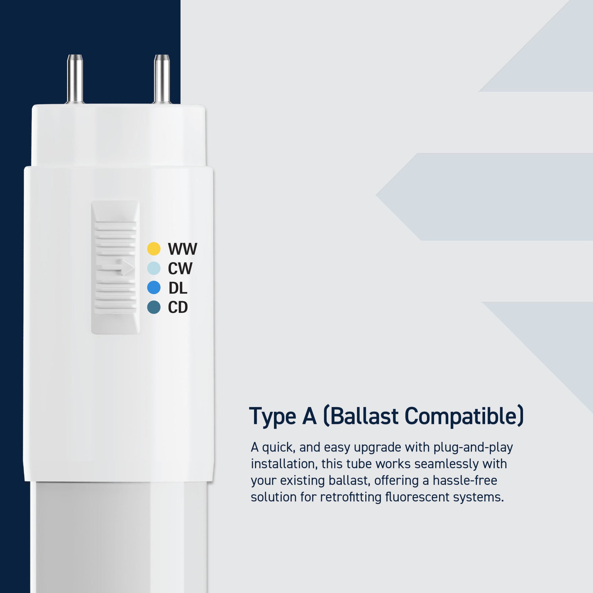 - Type A Direct Replacement uses existing ballasts for easy installation, no hardwiring required