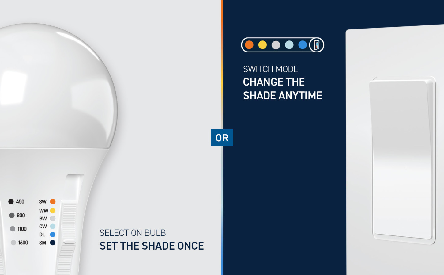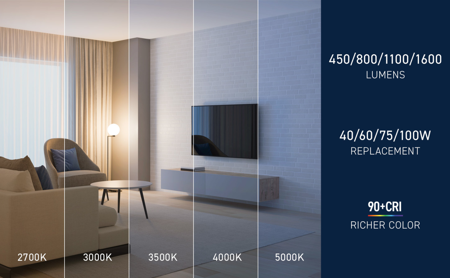 - Choose Soft White (2700K), Warm White (3000K), Bright White (3500K), Cool White (4000K), or Daylight (5000K)