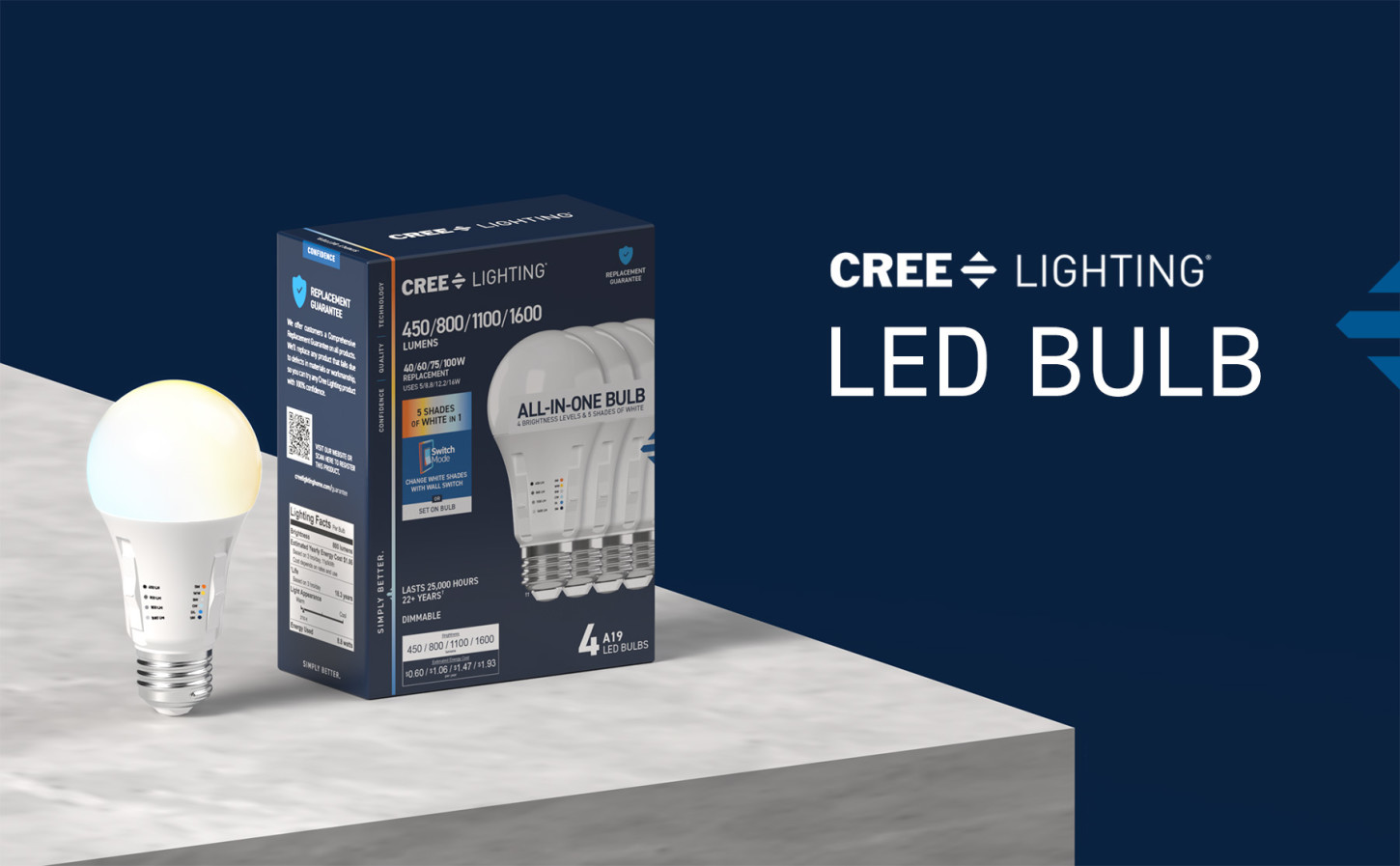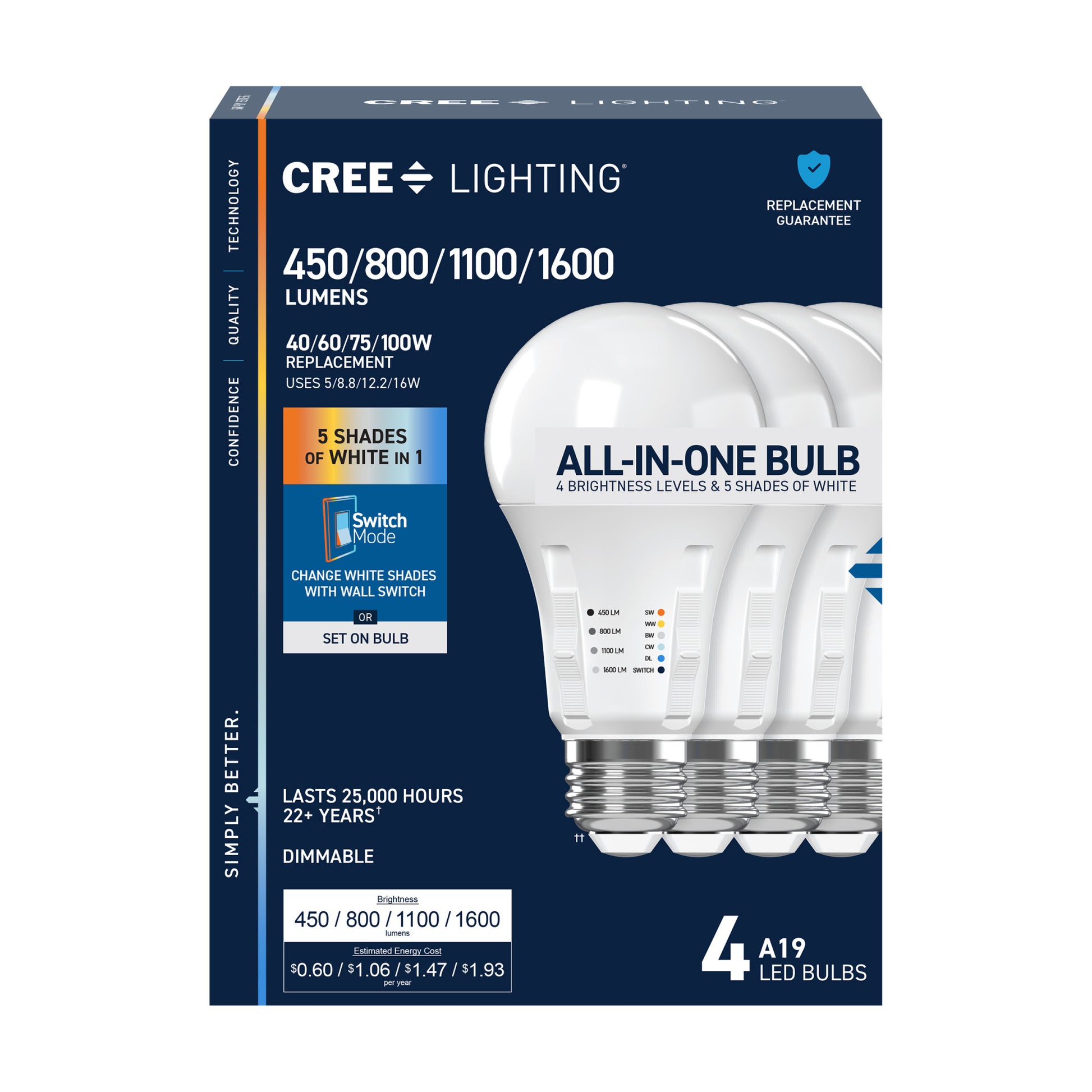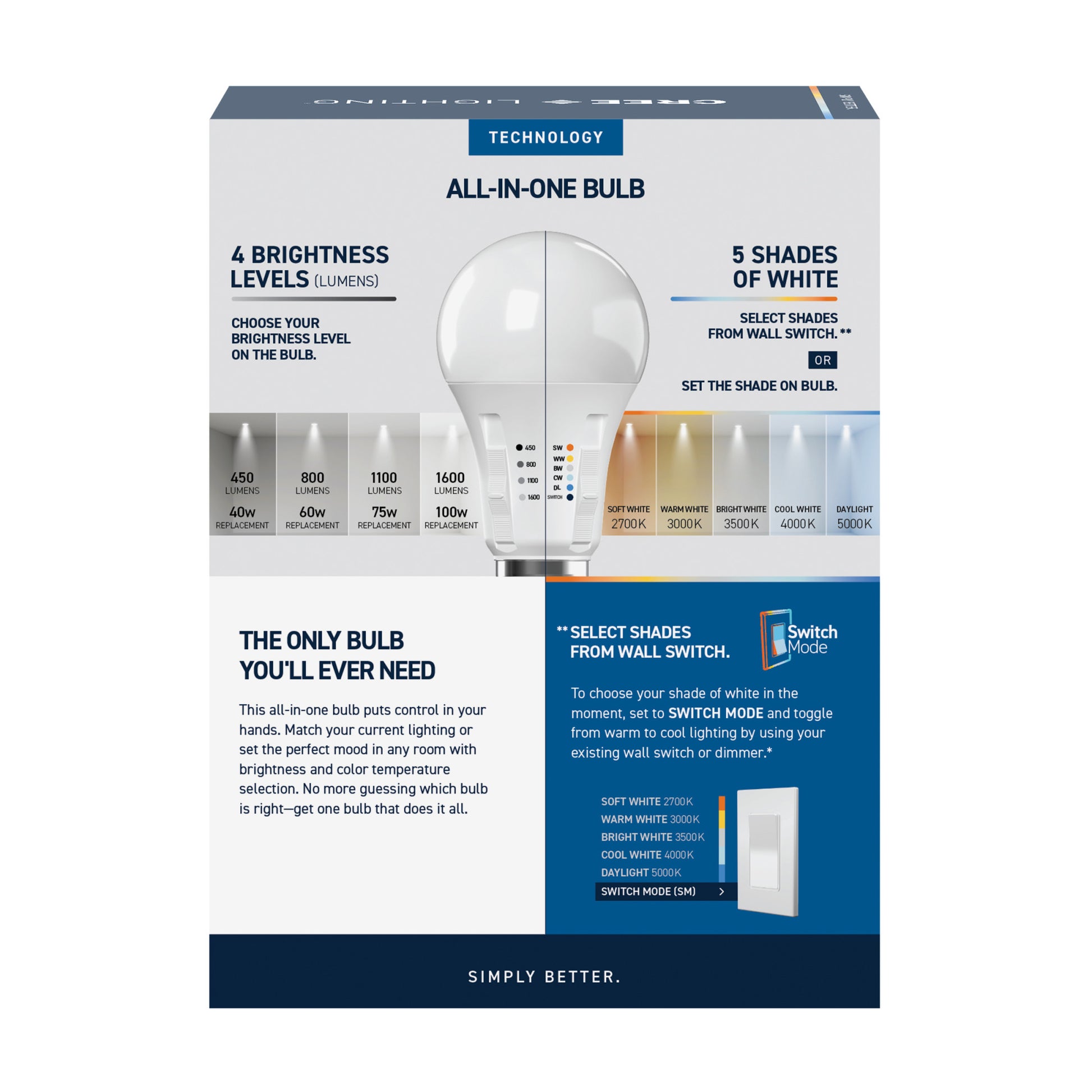 Ultimate versatility is at your fingertips with this All-In-One Bulb, the only bulb you'll ever need. Featuring Adjustable Brightness, choose between 450, 800, 1100, and 1600 Lumens, so the brightness is just right at any time of day or night and matches your existing lighting. Preset Soft White (2700K), Warm White (3000K), Bright White (3500K), Cool White (4000K), or Daylight (5000K) before installation, or choose Switch Mode to use your wall switch to go from energizing light in the daytime to relaxing light at night. Low Blue technology filters out harsh blue light that can cause eye strain, headaches, and disrupt sleep. The medium-sized E26 base makes for a convenient upgrade in almost any fixture or lamp, and the brilliant 90+ Color Rendering Index (CRI) makes the colors in your home appear more vivid and true-to-life, enhancing the beauty of your décor. Built to last with an impressive 25,000-hour lifespan, this energy-efficient LED saves you money and time, reducing replacements and energy costs compared to traditional 40/60/75/100W incandescent bulbs. Whether it's in your reading lamp, hanging over the kitchen counter, or providing adjustable mood lighting in the living room, enjoy flicker-free, eco-friendly lighting that's mercury-free and designed for sustainability.