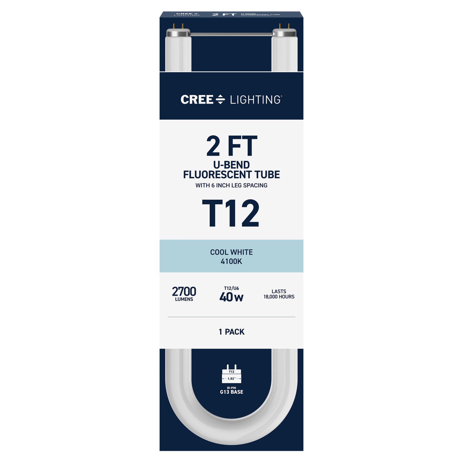 Upgrade your lighting game with Cree Lighting’s 2ft Fluorescent U-Bend Light Tube, a perfect replacement for T12 fluorescent bulbs in almost any commercial or business environment. 4100K Cool White light creates a crisp, refreshing environment in any room. This 2700 Lumen non-dimmable tube uses 40W of electricity, with relatively cool running performance for its entire 18,000-hour lifespan. Its bi-pin base makes for easy installation and upgrades. Whether it’s in the garage, storage unit, warehouse, or office, enjoy flicker-free lighting built to last.