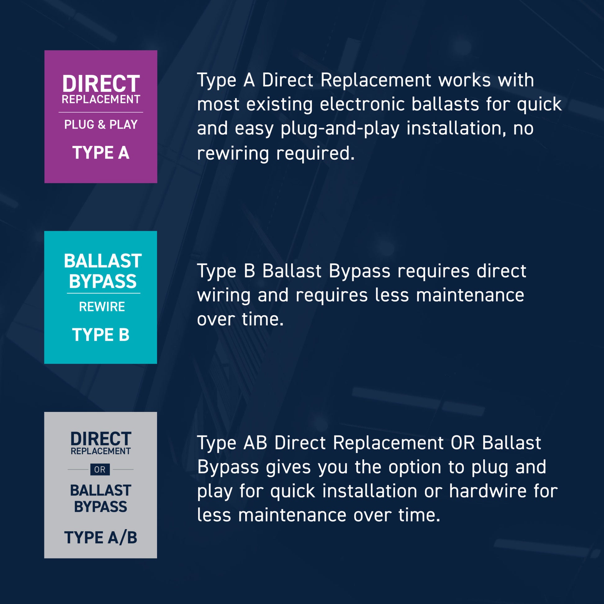 - Type B Ballast Bypass uses direct wiring and requires less maintenance over time