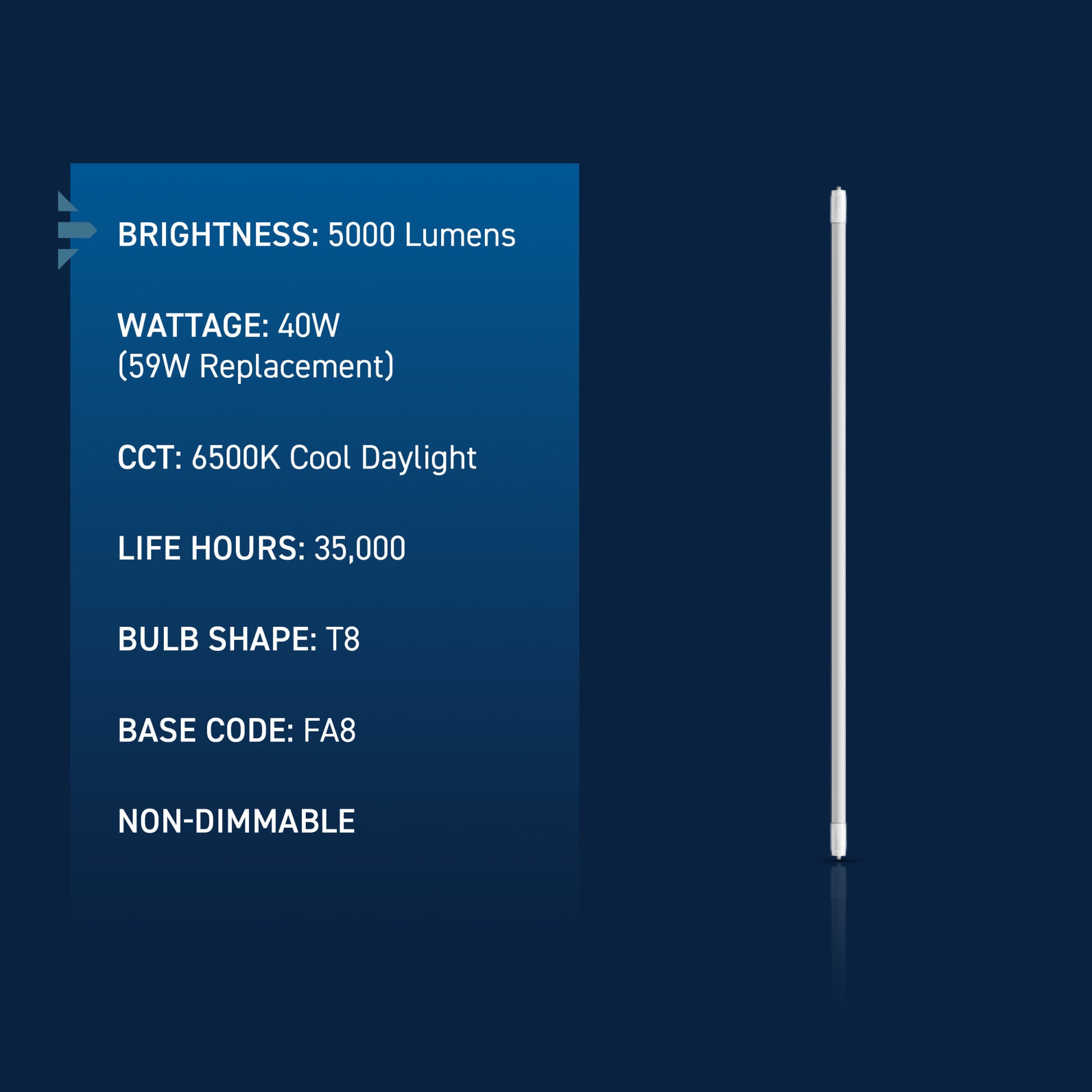 - 40W T8 shape LED is ideal for replacing 59W fluorescent tubes