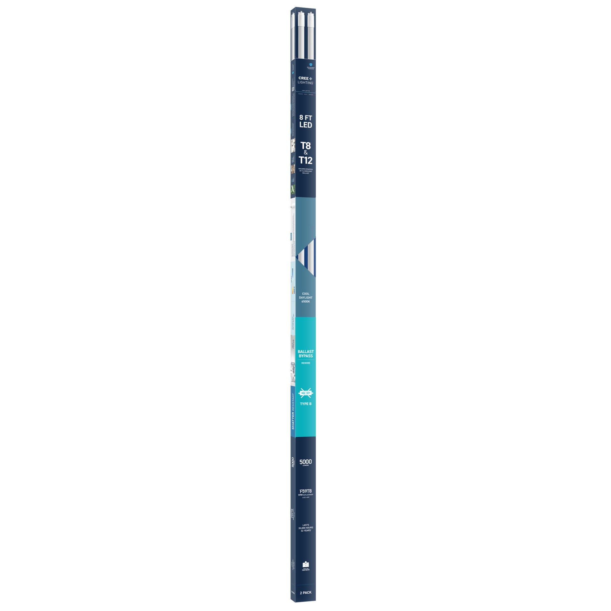 Upgrade your lighting game with Cree Lighting's 8ft LED Light Tube, a perfect replacement for T8 fluorescent bulbs in public and commercial environments. This tube is a Type B Ballast Bypass that uses direct wiring and requires less maintenance over time. Maximize clarity and precision with the ultra-bright intensity of Cool Daylight Light. LED light turns on instantly without the warmup time required by fluorescents. This 5000 Lumen non-dimmable tube uses 40W of electricity, with cool running performance for its entire 35,000-hour lifespan. Whether it's in a garage, warehouse, or commercial space, enjoy flicker-free, mercury-free lighting built to last.