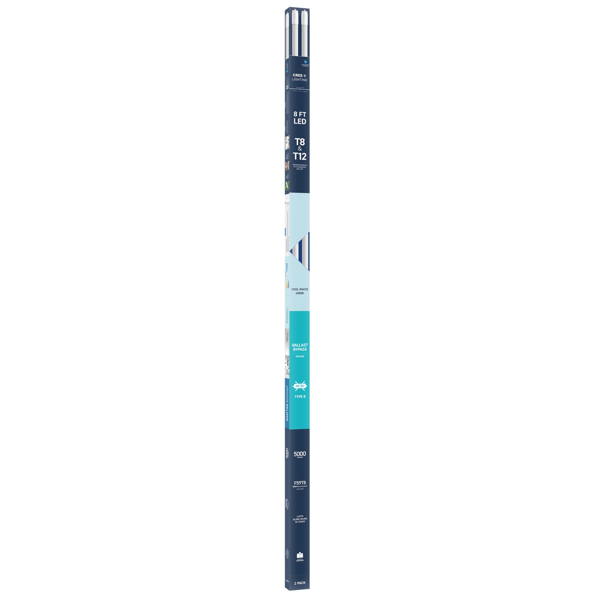Upgrade your lighting game with Cree Lighting’s 8ft LED Light Tube, a perfect replacement for T8 fluorescent bulbs in public and commercial environments. This tube is a Type B Ballast Bypass that uses direct wiring and requires less maintenance over time. Create a crisp, refreshing environment with 4000K Cool White light. LED light turns on instantly without the warmup time required by fluorescents. This 5000 Lumen non-dimmable tube uses 40W of electricity, with cool running performance for its entire 35,000-hour lifespan. Whether it’s in a garage, warehouse, or commercial space, enjoy flicker-free, mercury-free lighting built to last.