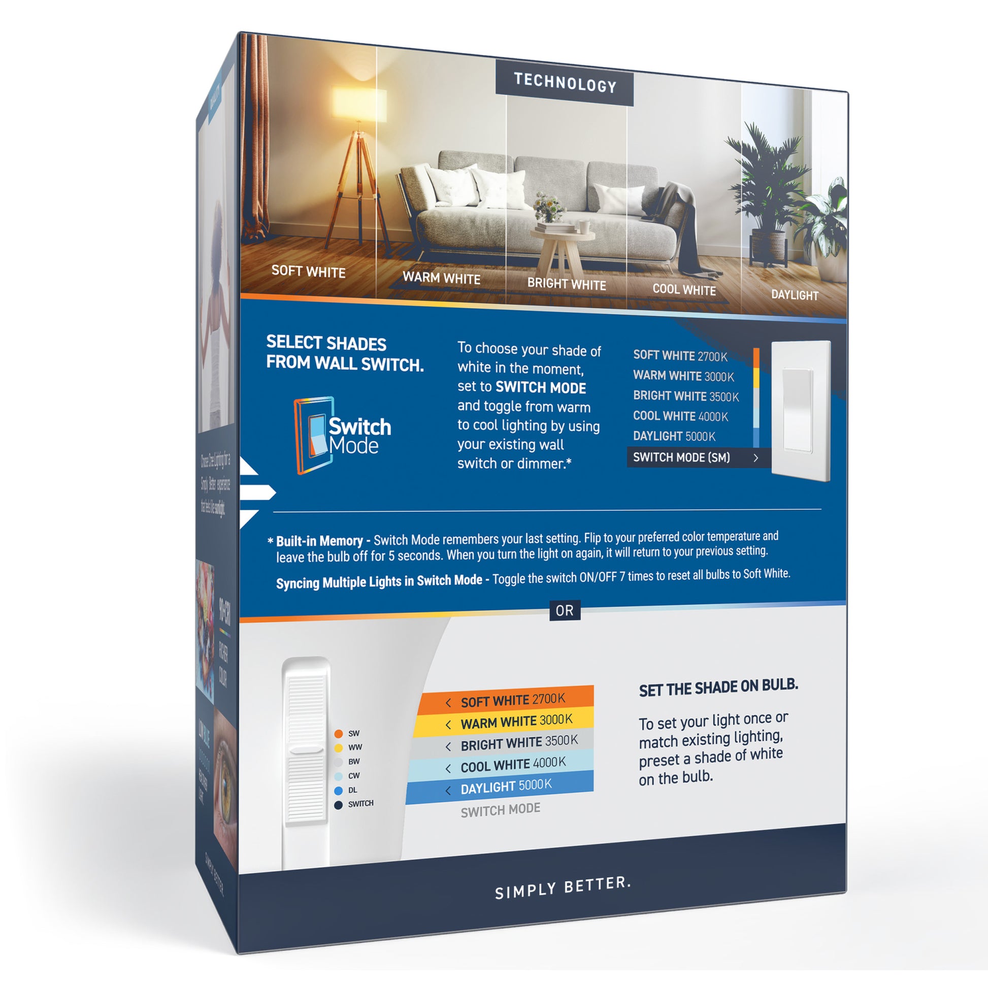 Upgrade your lighting game with our 5 Shade + Switch Mode White LED Bulb. Preset Soft White (2700K), Warm White (3000K), Bright White (3500K), Cool White (4000K), or Daylight (5000K) before installation, or choose Switch Mode to use your wall switch to go from energizing light in the daytime to relaxing light at night. With a remarkable 90+ Color Rendering Index (CRI), colors appear more vivid and true-to-life, enhancing the beauty of your home’s décor and making everything look its best. Low Blue technology filters harsh blue light that can cause eye strain, headaches, and disrupt sleep. Built to last with an impressive 25,000-hour lifespan, this energy-efficient LED saves you money and time, reducing replacements and energy costs compared to a traditional 40W incandescent bulb. With a medium-sized E26 base, this dimmable bulb provides an easy upgrade in most fixtures. Whether it’s your living room, bedroom, or kitchen, enjoy flicker-free, eco-friendly lighting that’s mercury-free and designed for sustainability. Illuminate your world with a bulb that combines comfort, clarity, and reliability—all in one brilliant package.