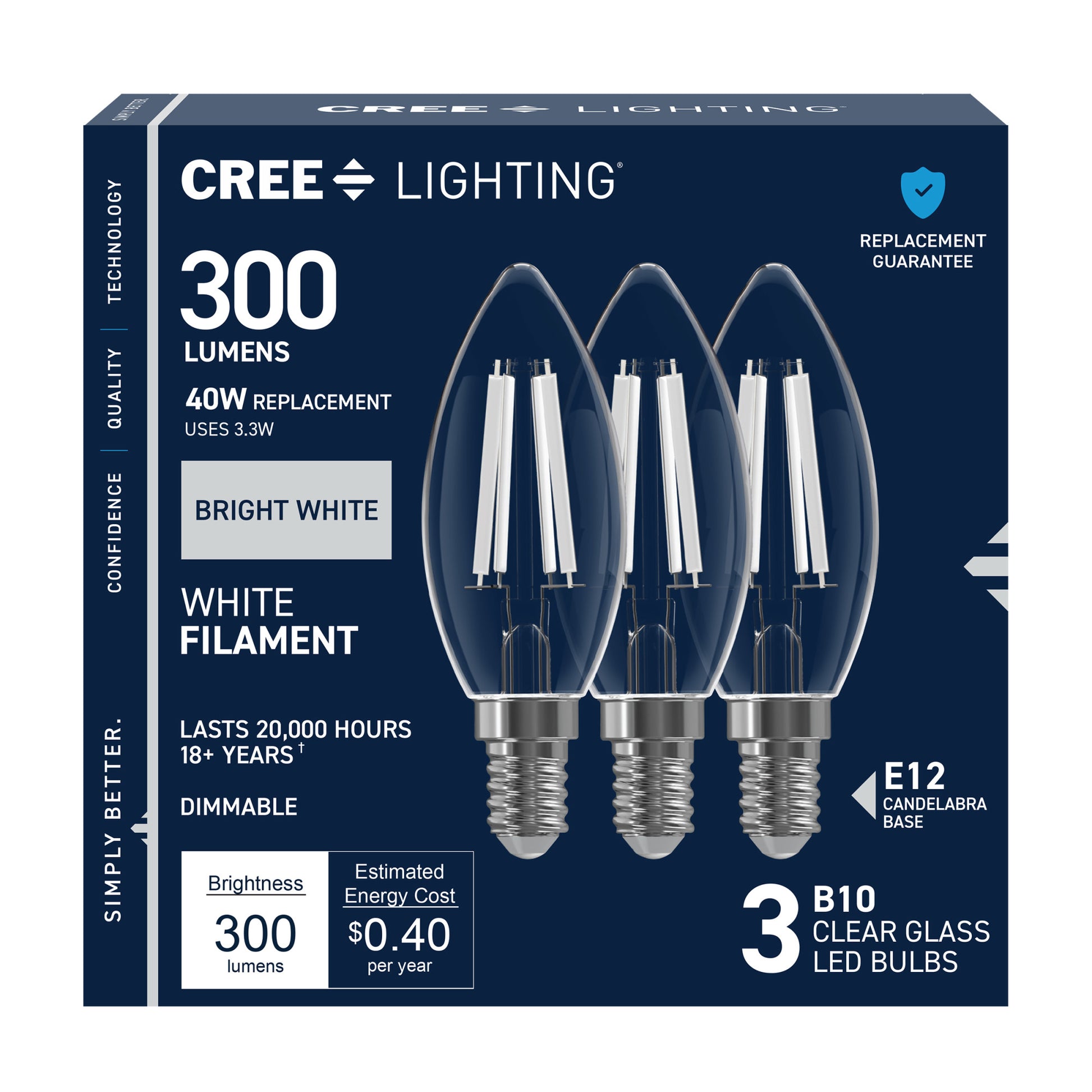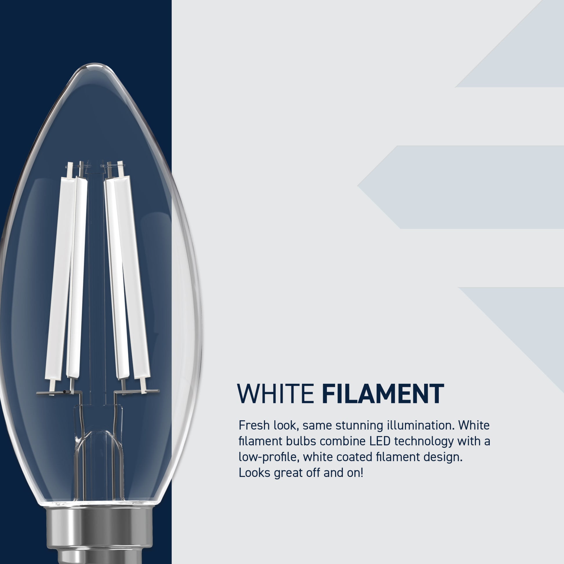 Refresh your lighting to fit your aesthetic with our White Filament LED Bright White bulb. Equipped with low-profile, white coated filament design, these clear bulbs give off stunning, stylish illumination while on and blend seamlessly into your decor while off. The candle shape brings a high-end ambiance to your fixtures. Strike the perfect balance of comfort and energy with Bright White light (3500K). The remarkable 90+ Color Rendering Index (CRI) makes colors appear more vivid and true-to-life, enhancing the beauty of your home's decor and making everything look its best for up to 20,000 hours. This 300-lumen bulb has a Candelabra E12 base, and replacements are fewer and further between with eco-friendly, LED bulb technology. This bulb does with 3.3W what a traditional incandescent bulb does with 40W, making it 91.8% more efficient. Whether it's in your living room, dining room, or kitchen, enjoy flicker-free, sustainable lighting that elevates your fixtures with effortlessly sleek style.